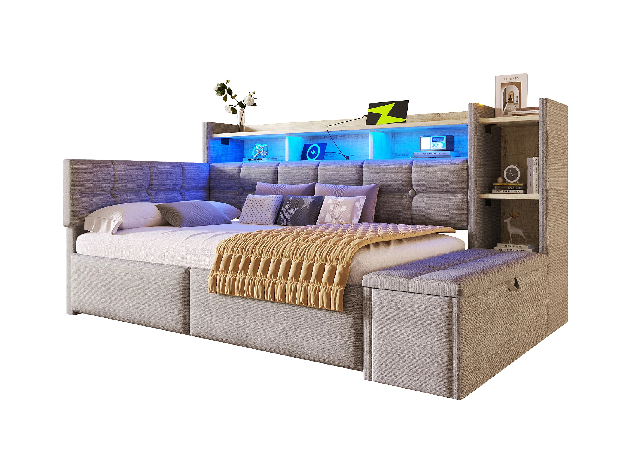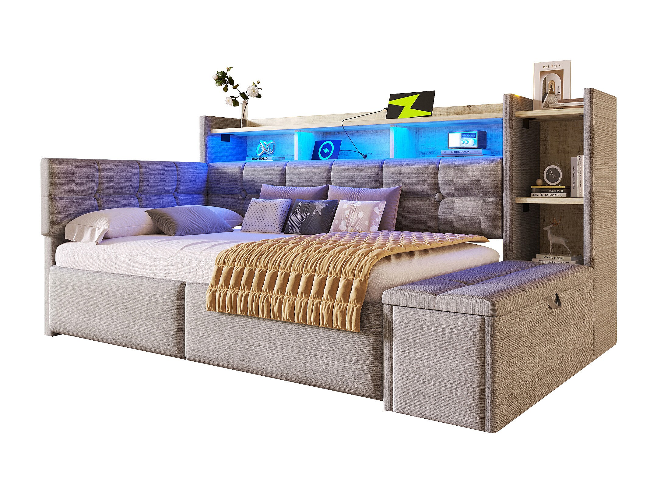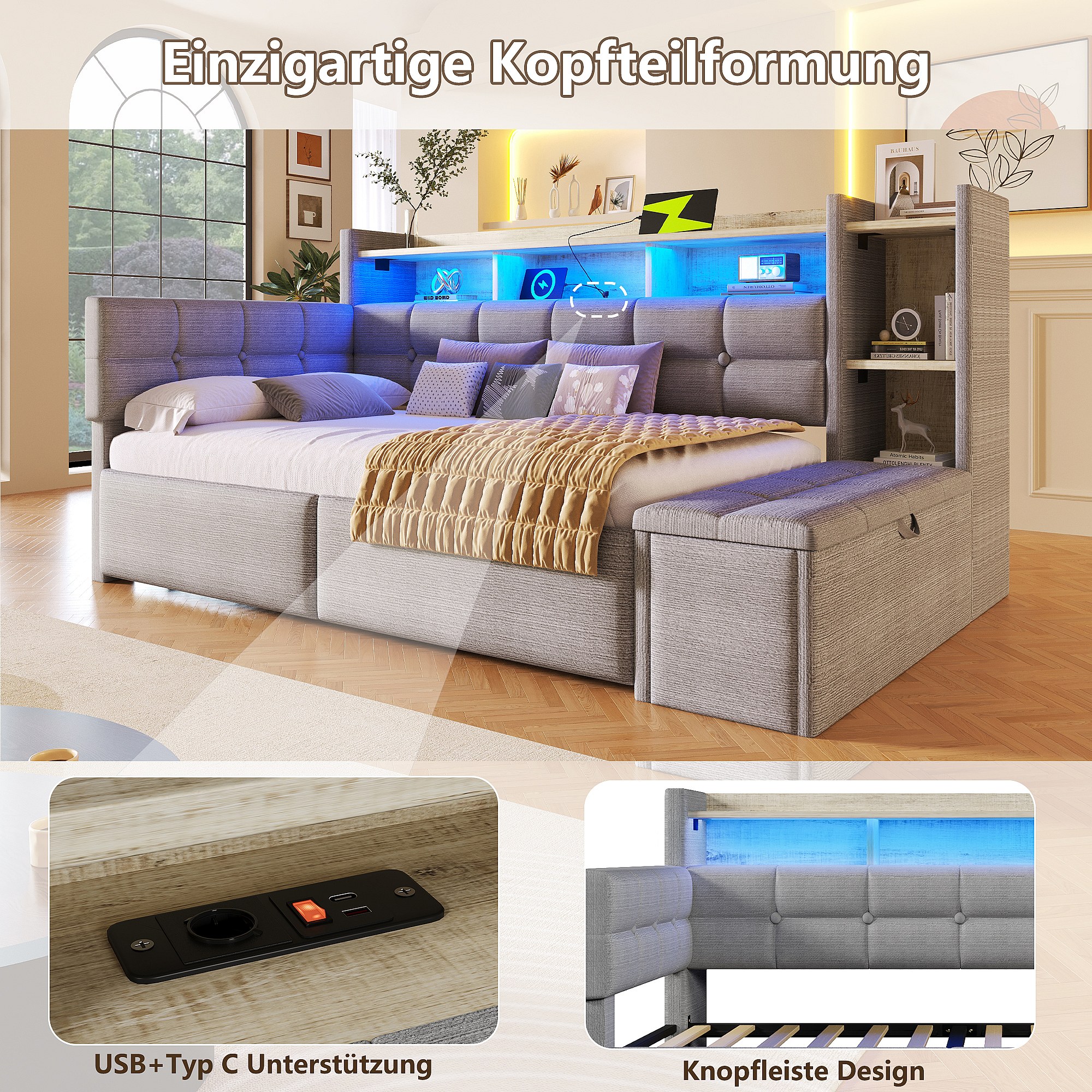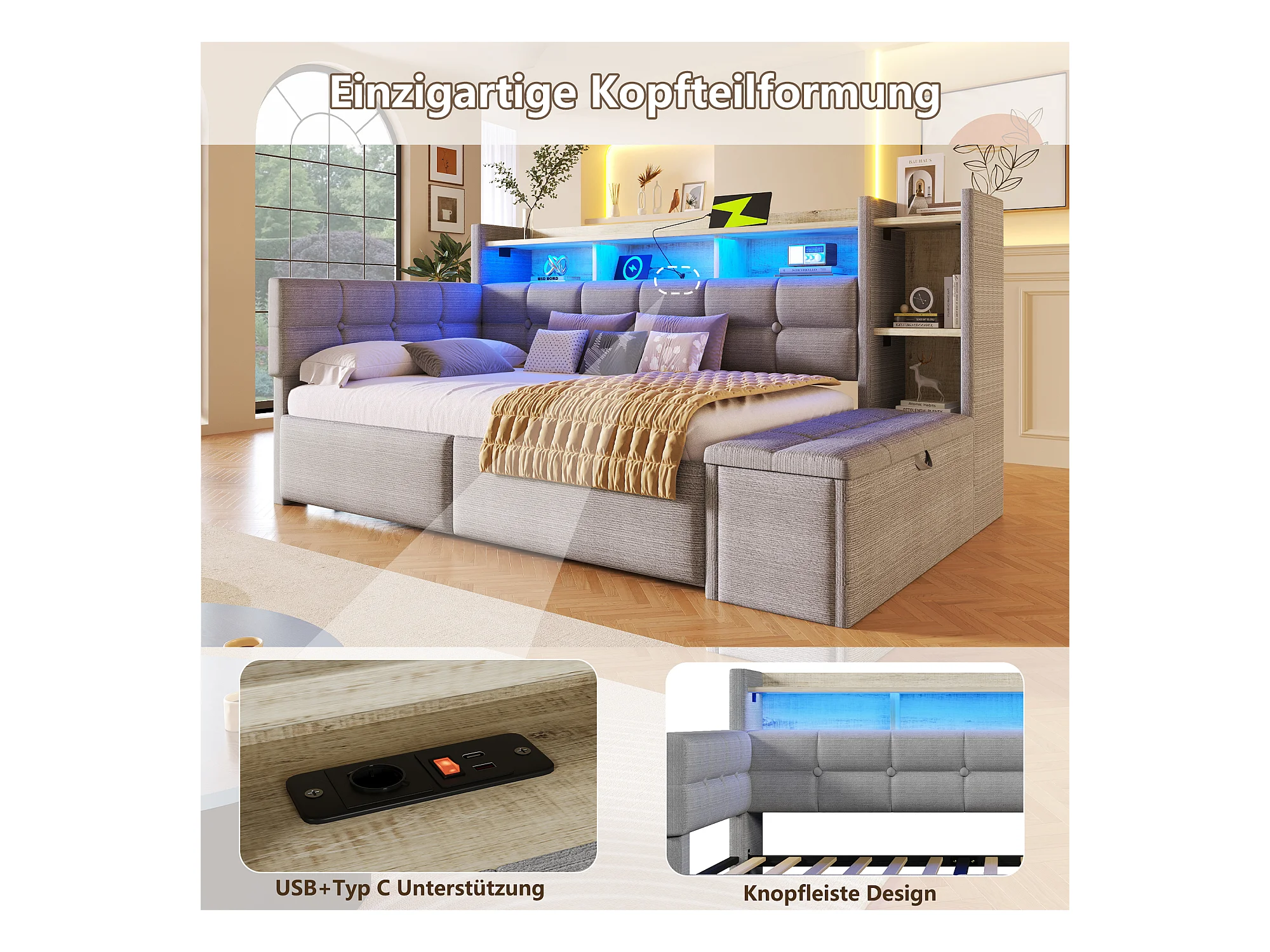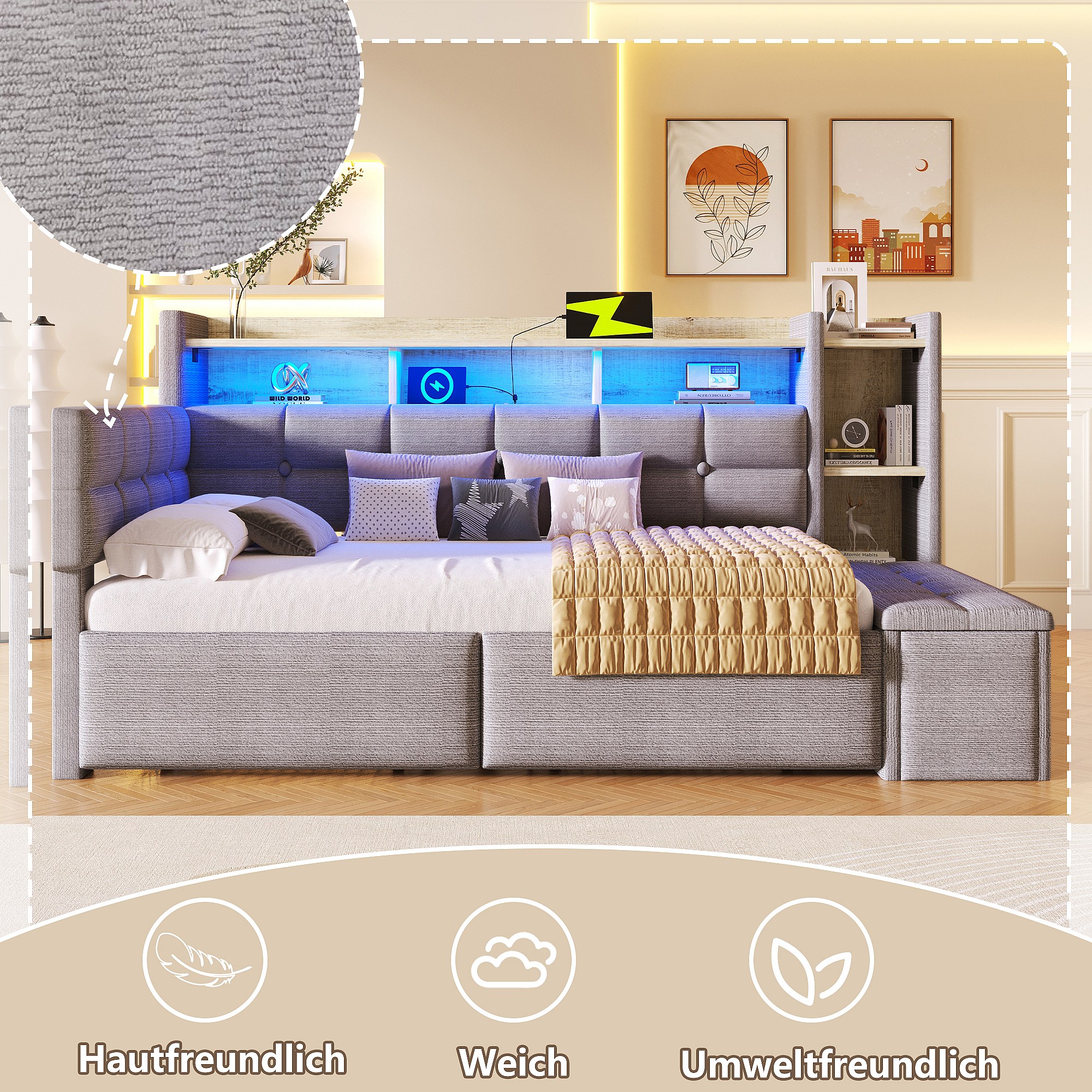 Canapé-lit 90 x 190 cm - avec 2 tiroirs + USB + étagère + banc de rangement + Leds - velours - gris