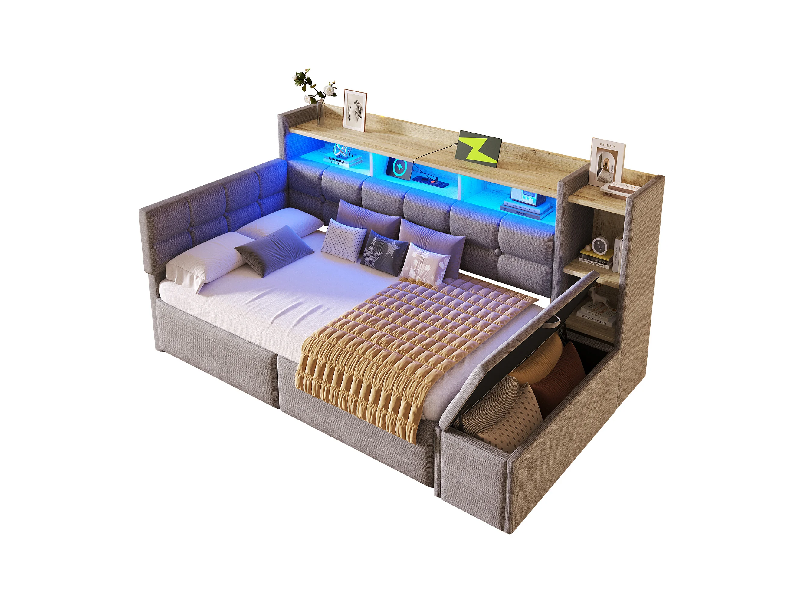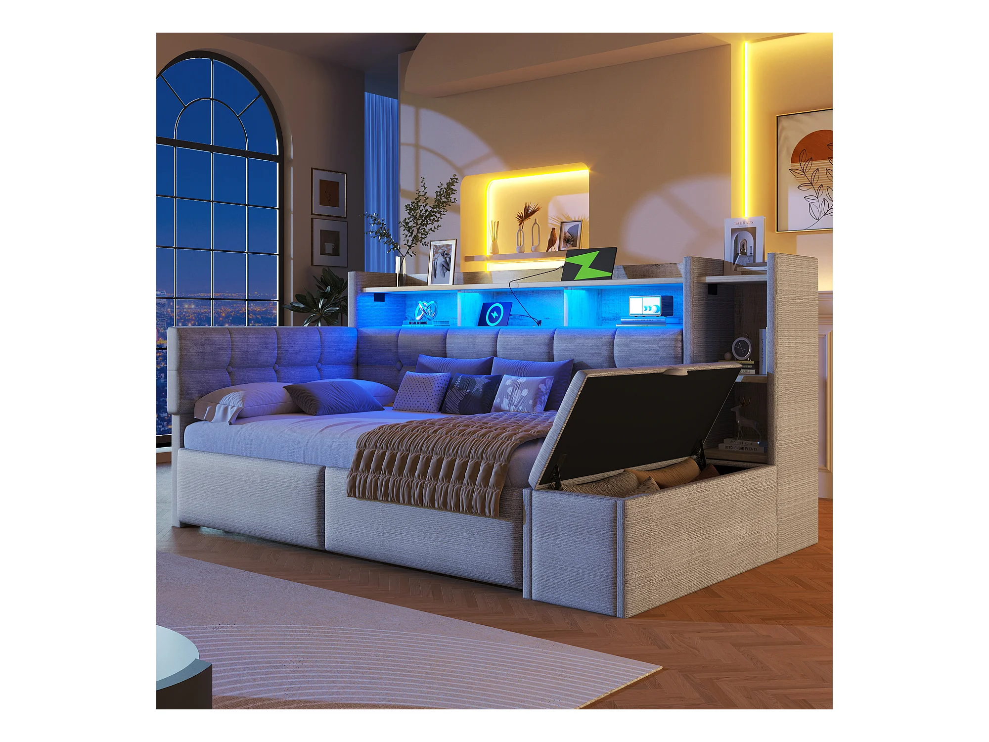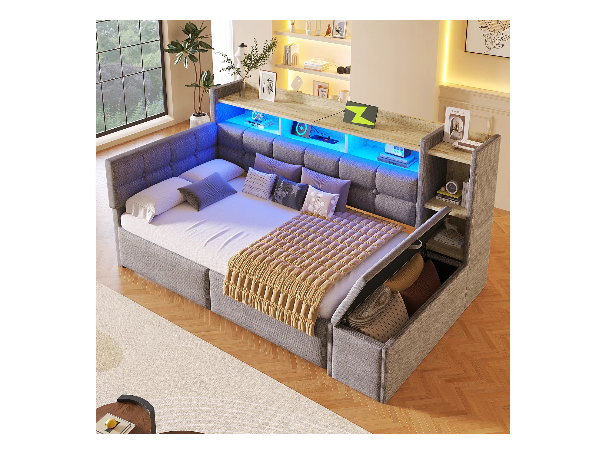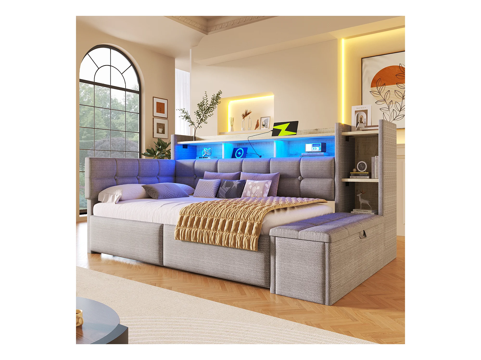 Canapé-lit 90 x 190 cm - avec 2 tiroirs + USB + étagère + banc de rangement + Leds - velours - gris