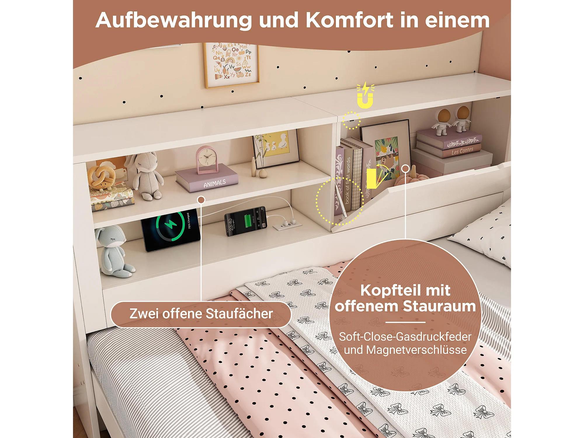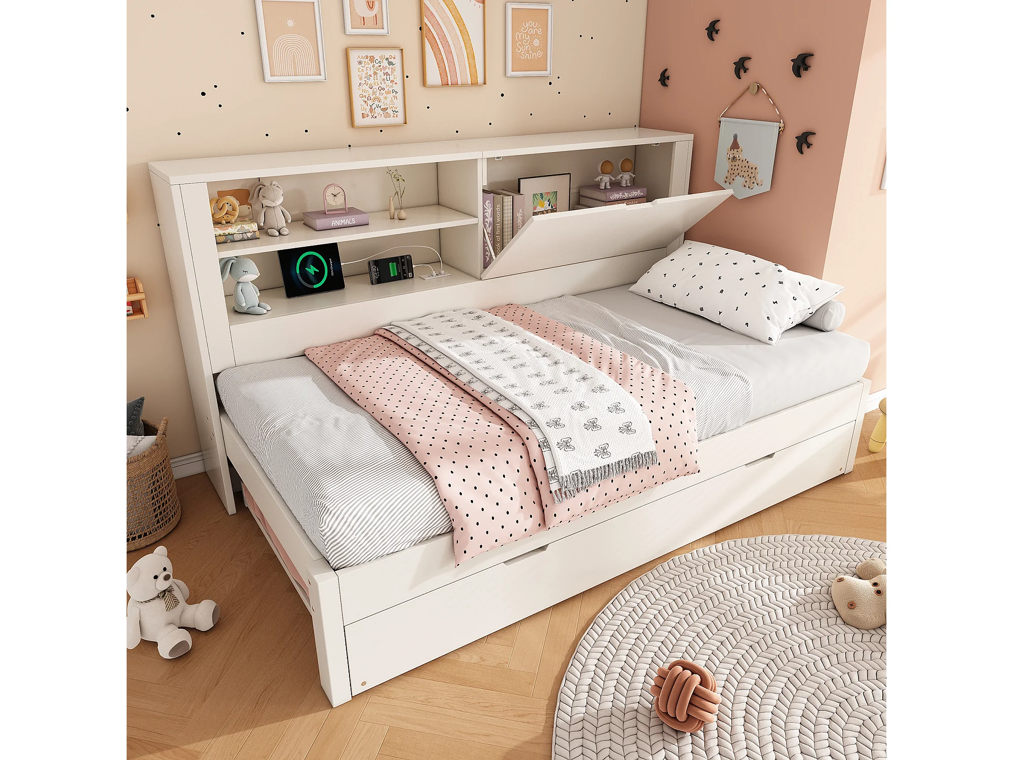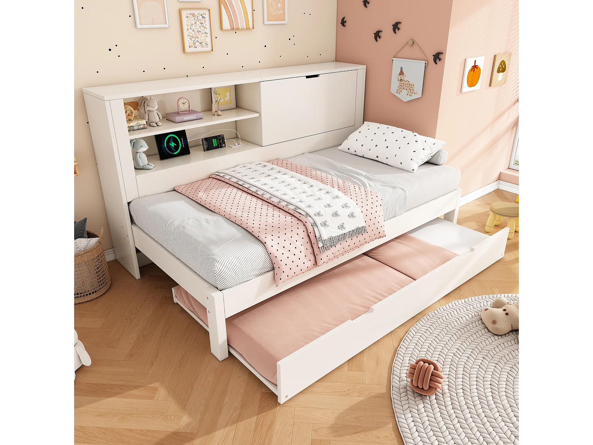 Canapé-lit 90 x 190 cm avec lit gigogne 90 x 190 cm - avec étagère + porte + panneau arrière de rangement + USB - bois - blanc