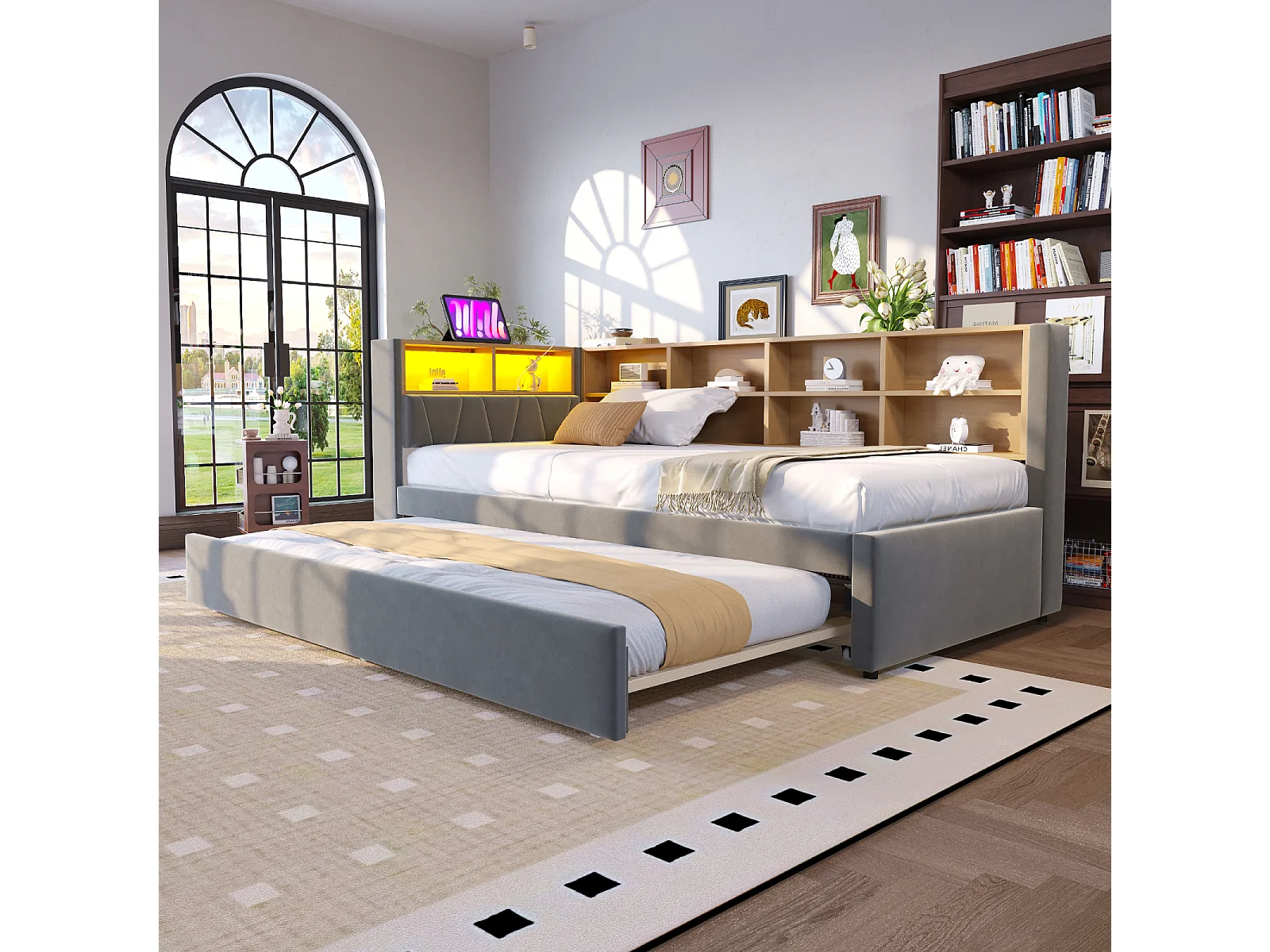 Canapé-lit 90x200 cm avec lit gigogne 90x190 cm, LED, prises, rangements – lit simple multifonction en flanelle gris foncé