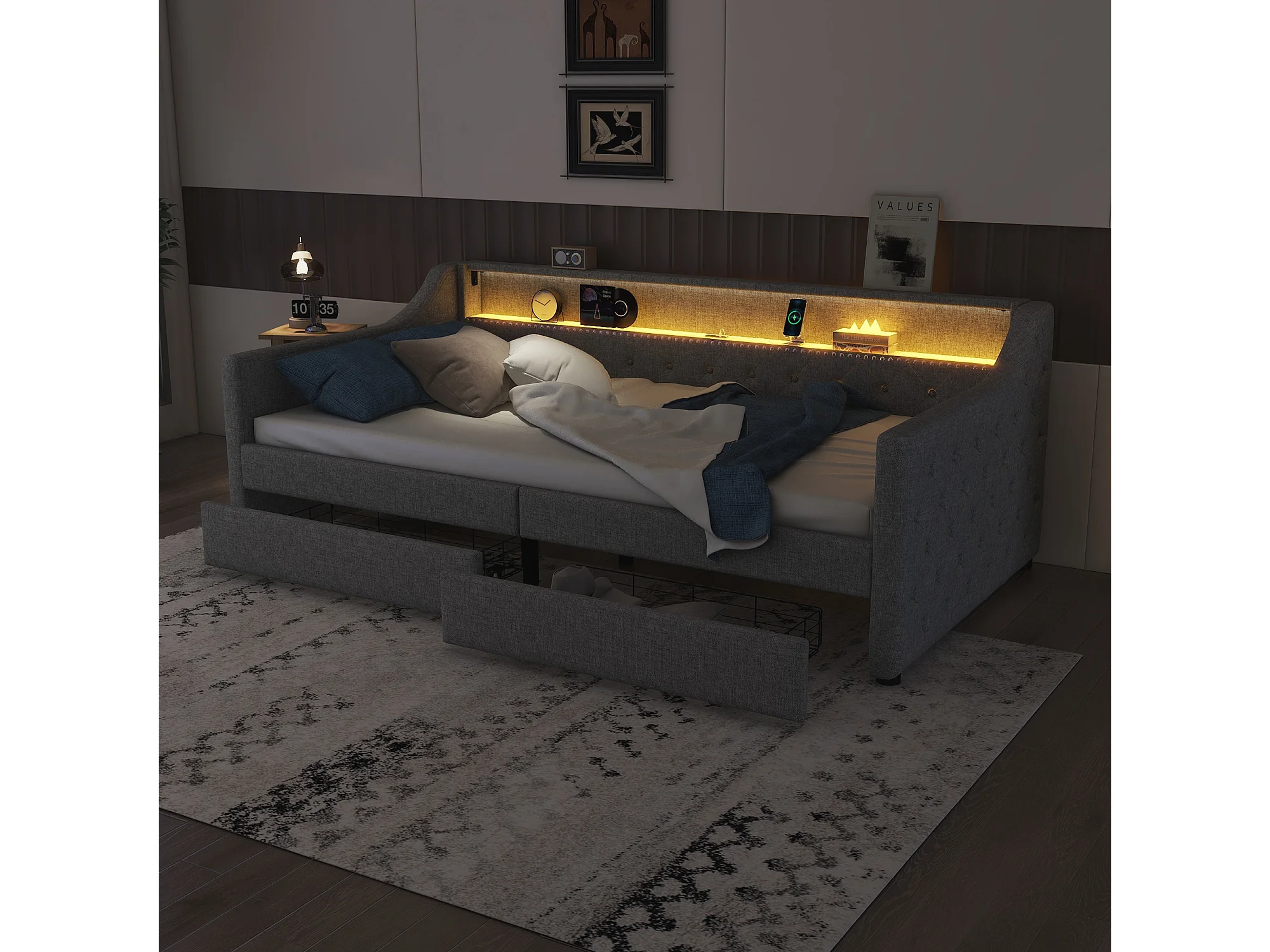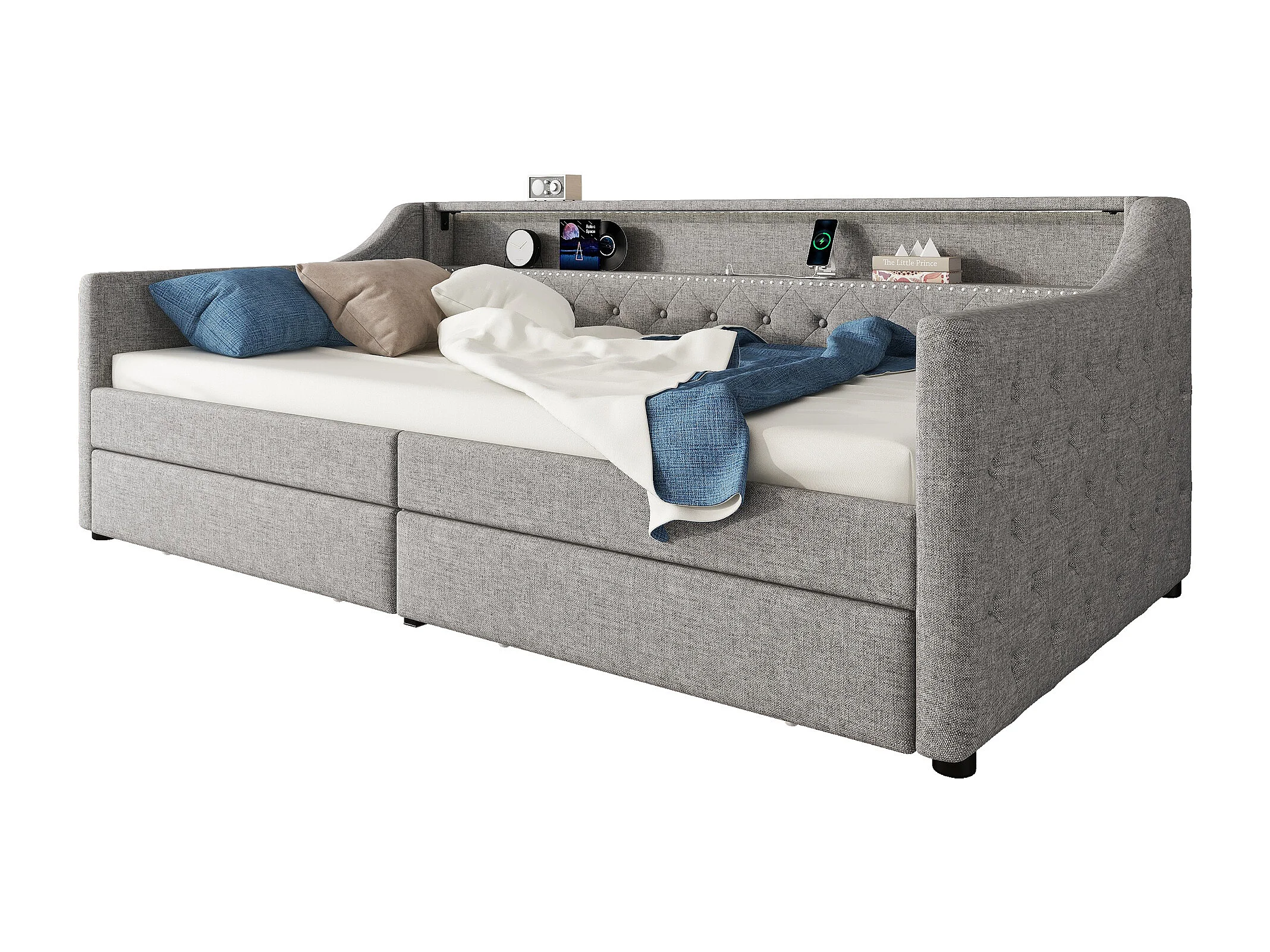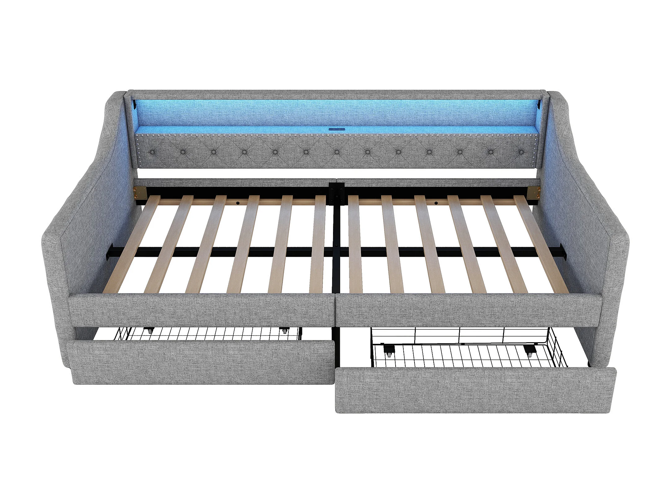 Canapé-lit 90x200 cm, lit de jour, sommier à lattes, éclairage ambiant, 2 tiroirs, prise USB, lin, gris (214x106x78.5 cm)