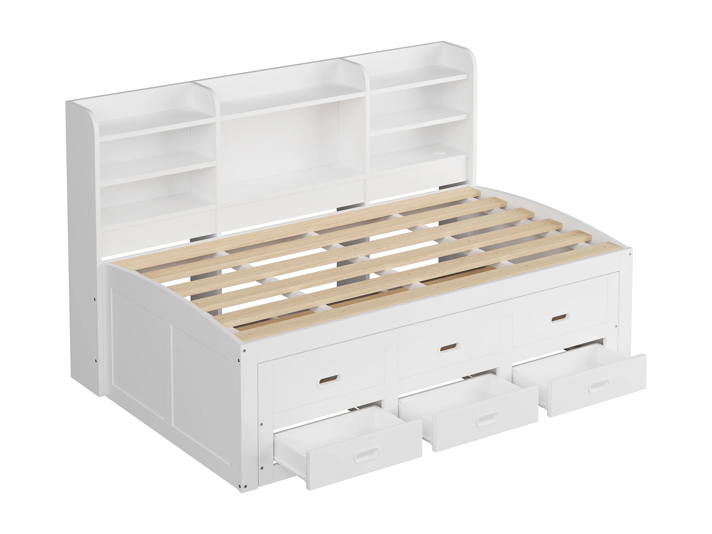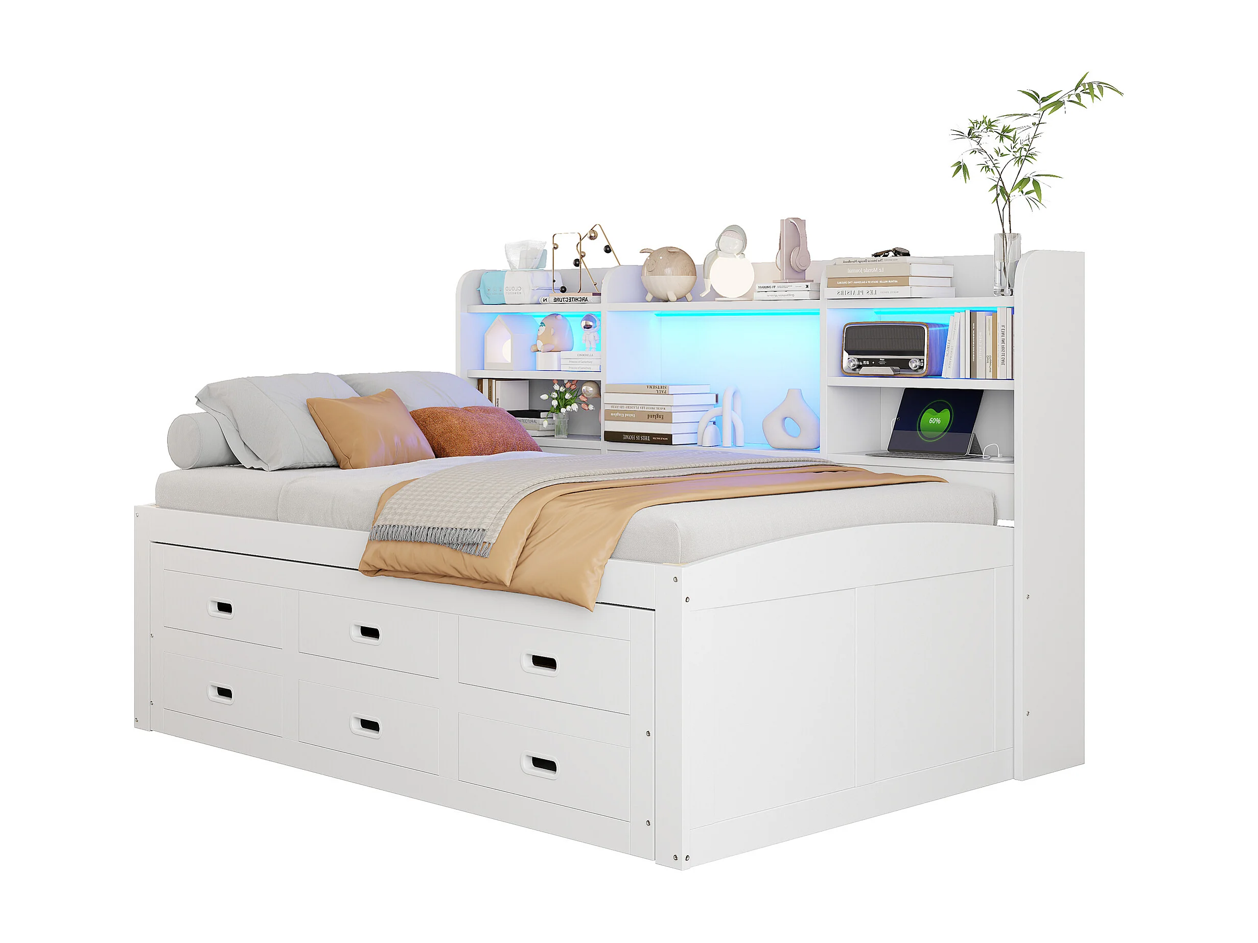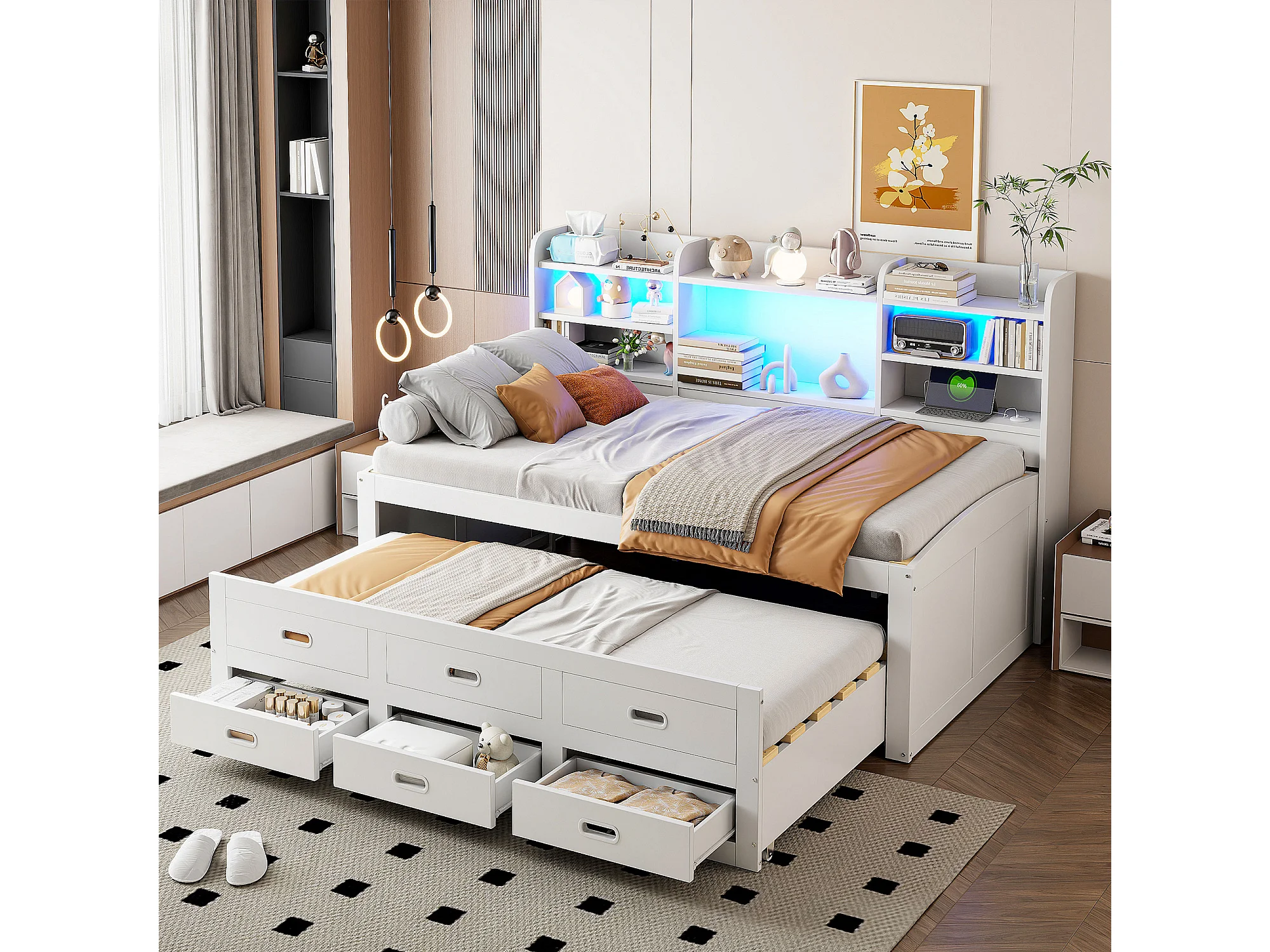 Canapé-lit 90x200cm - avec éclairage LED - 3 tiroirs - avec USB + Type-C - blanc (matelas non inclus)