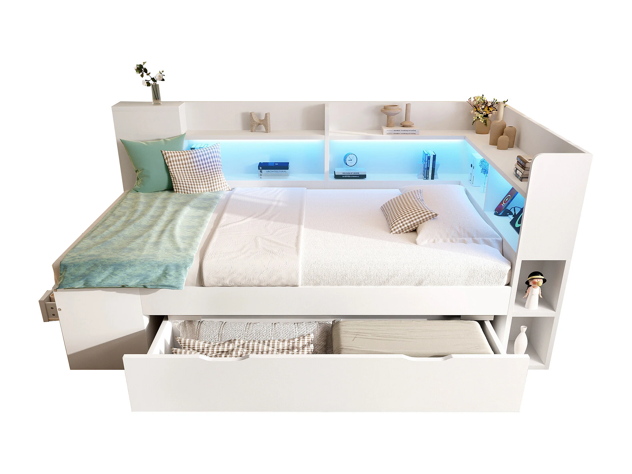 Canapé-lit 90x200cm - avec LED - avec USB/Type-C - avec des compartiments de rangement et des tiroirs - blanc (matelas non inclus)