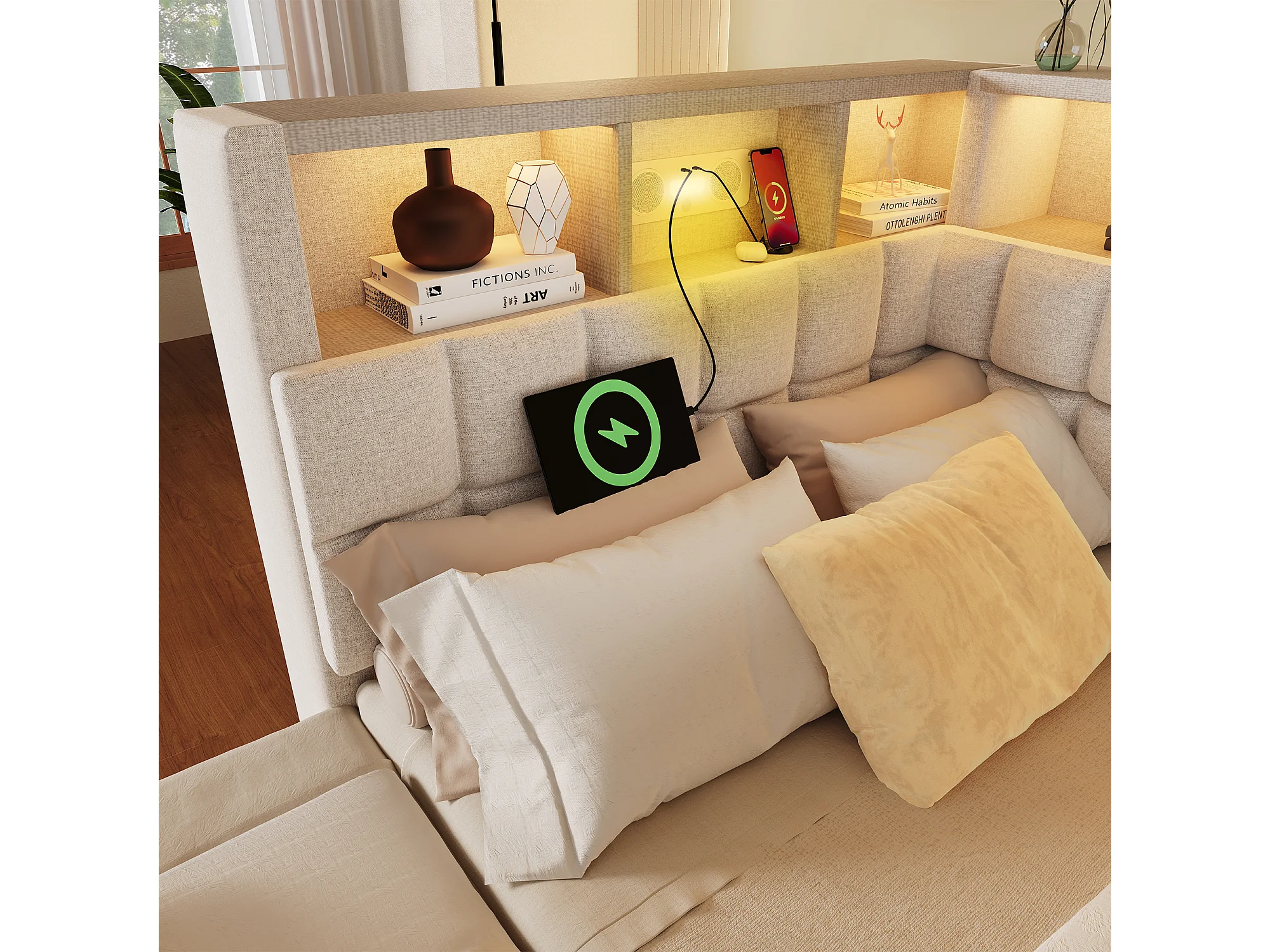 Canapé-lit 90x200cm - avec lit gigogne - avec éclairage LED - avec enceinte Bluetooth et port de chargement - tissu de lin - beige