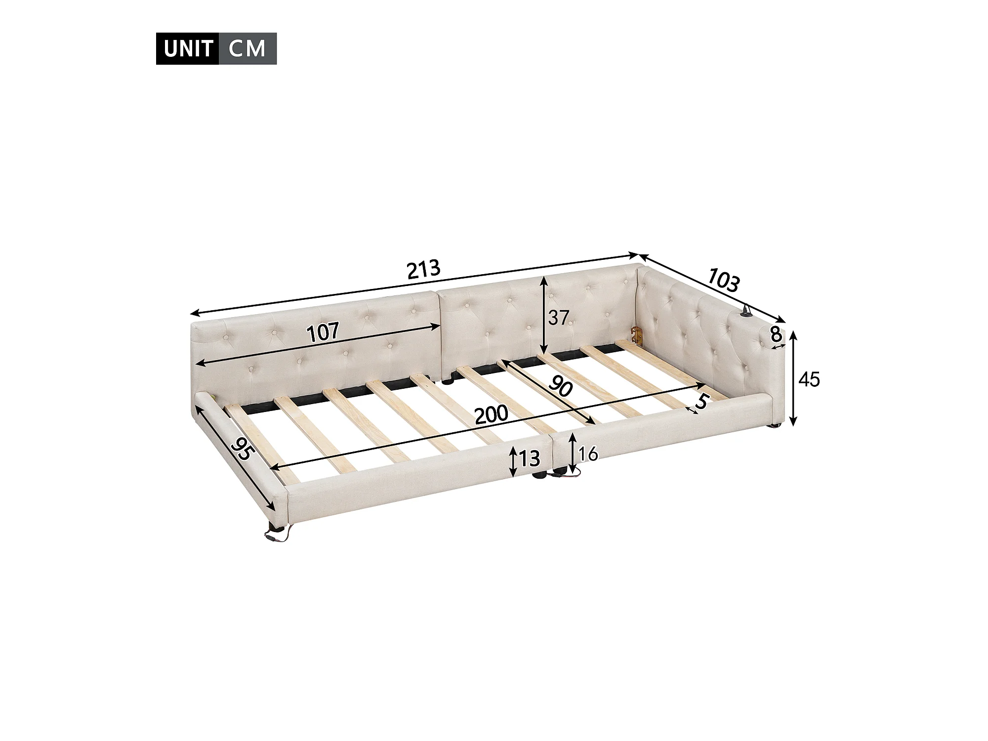 Canapé-lit 90x200cm, avec sommier à lattes, éclairage ambiant avec télécommande, tête de lit capitonnée, USB+Type-C, lin, beige (213x103x45 cm)