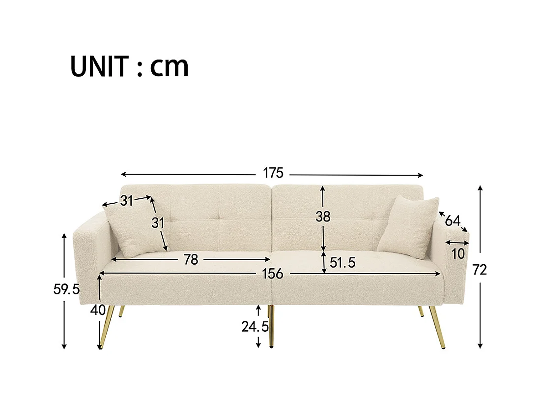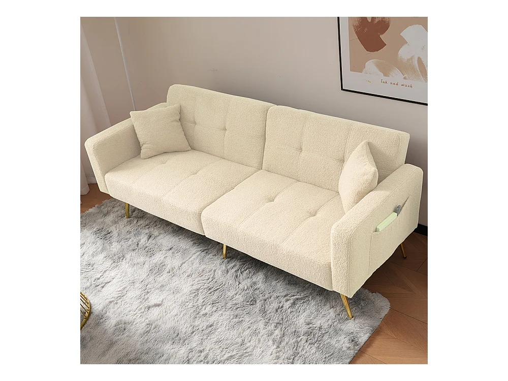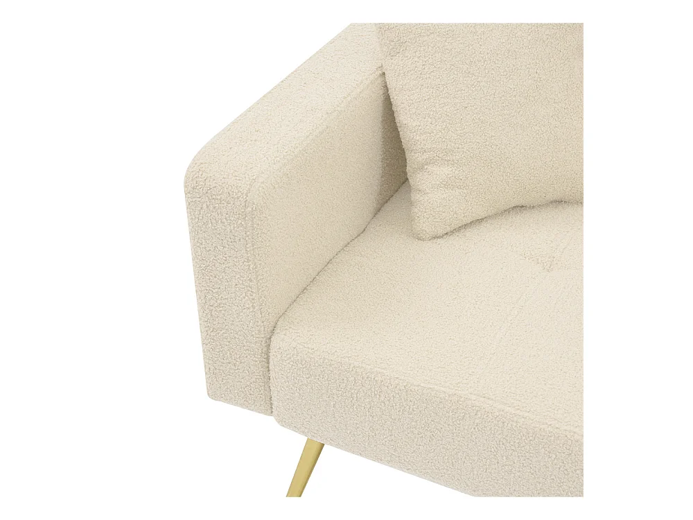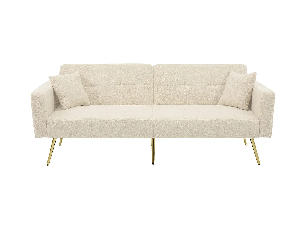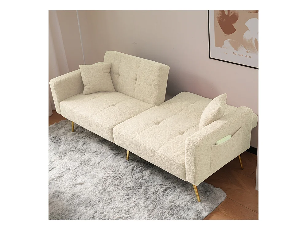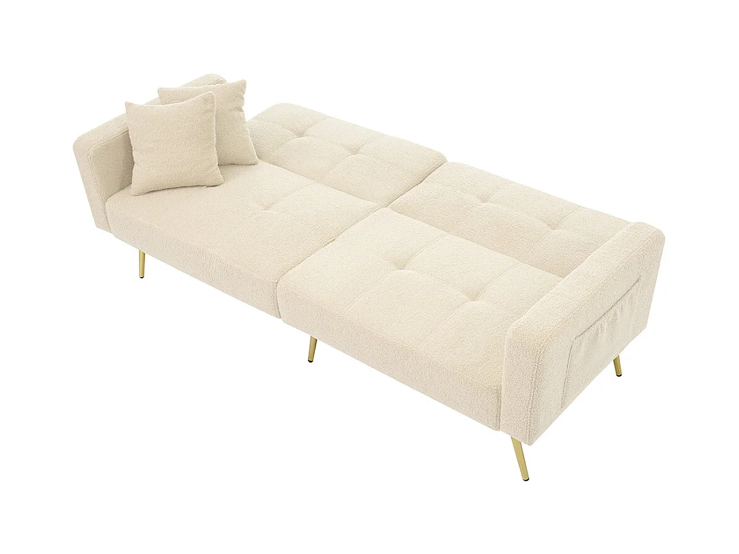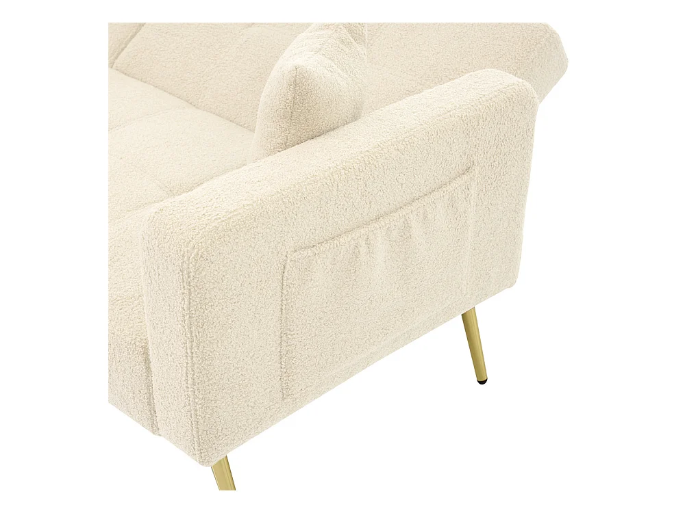 Canapé-lit avec fonction lit, angle réglable, pieds dorés, avec coussins et poches de rangement latérales, beige