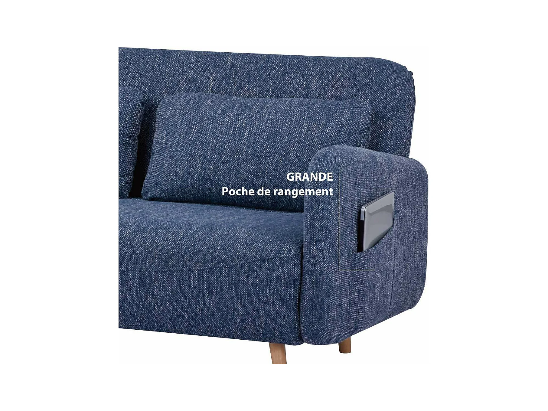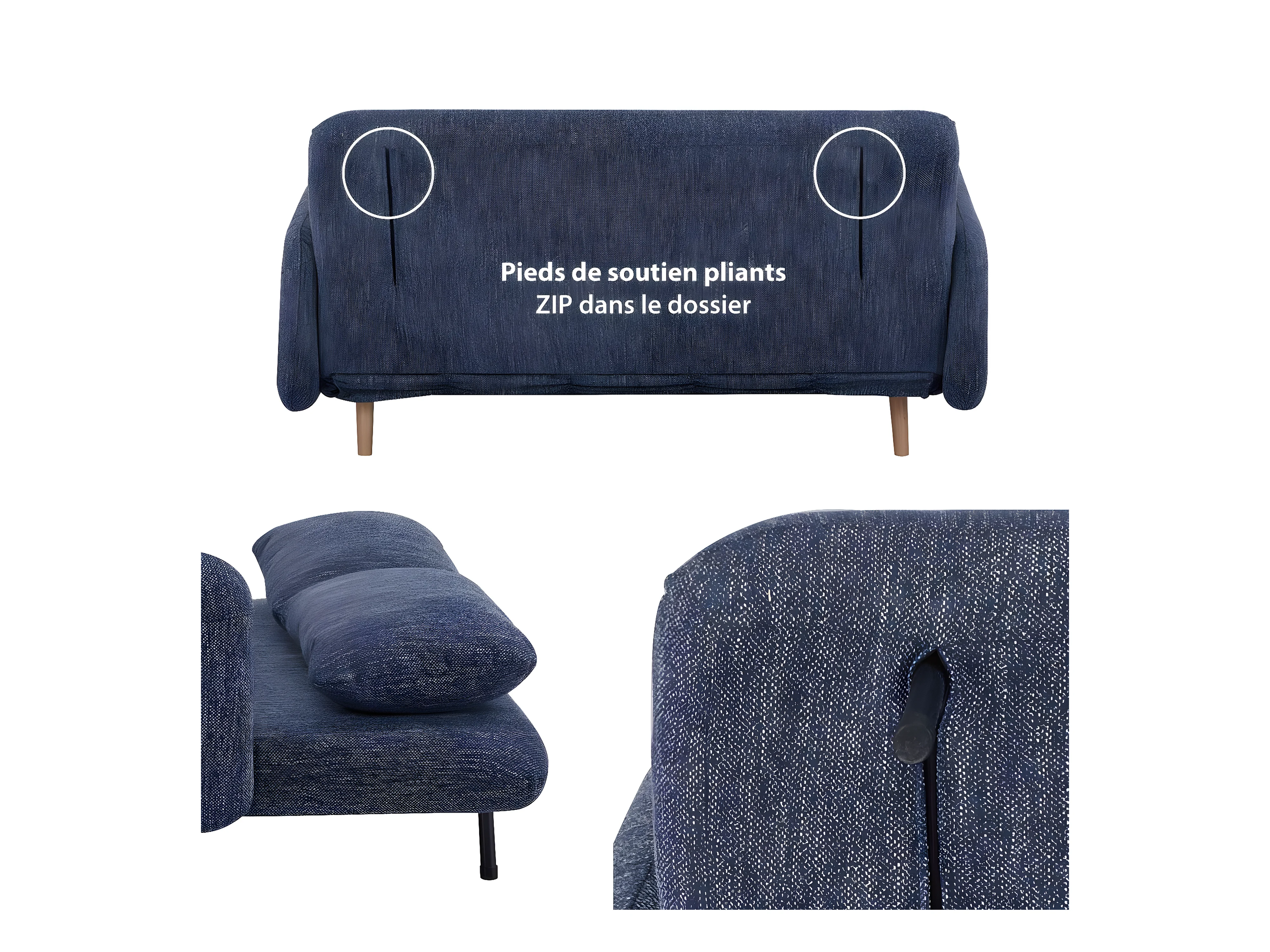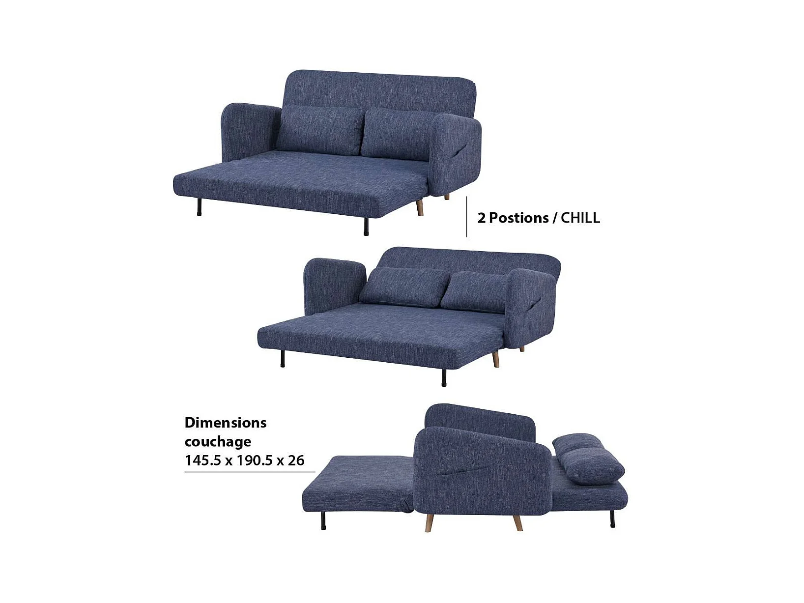 Canapé-lit BZ 2 places pour couchage d’appoint taille 145 x 190 cm en tissu bleu et pieds en bois massif - ARI