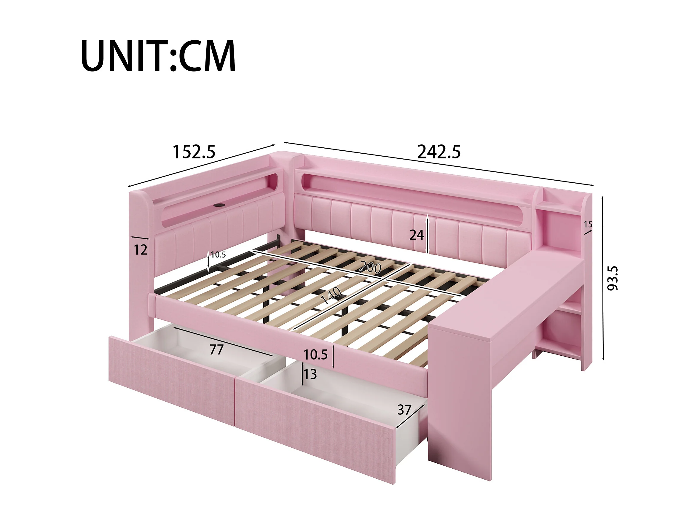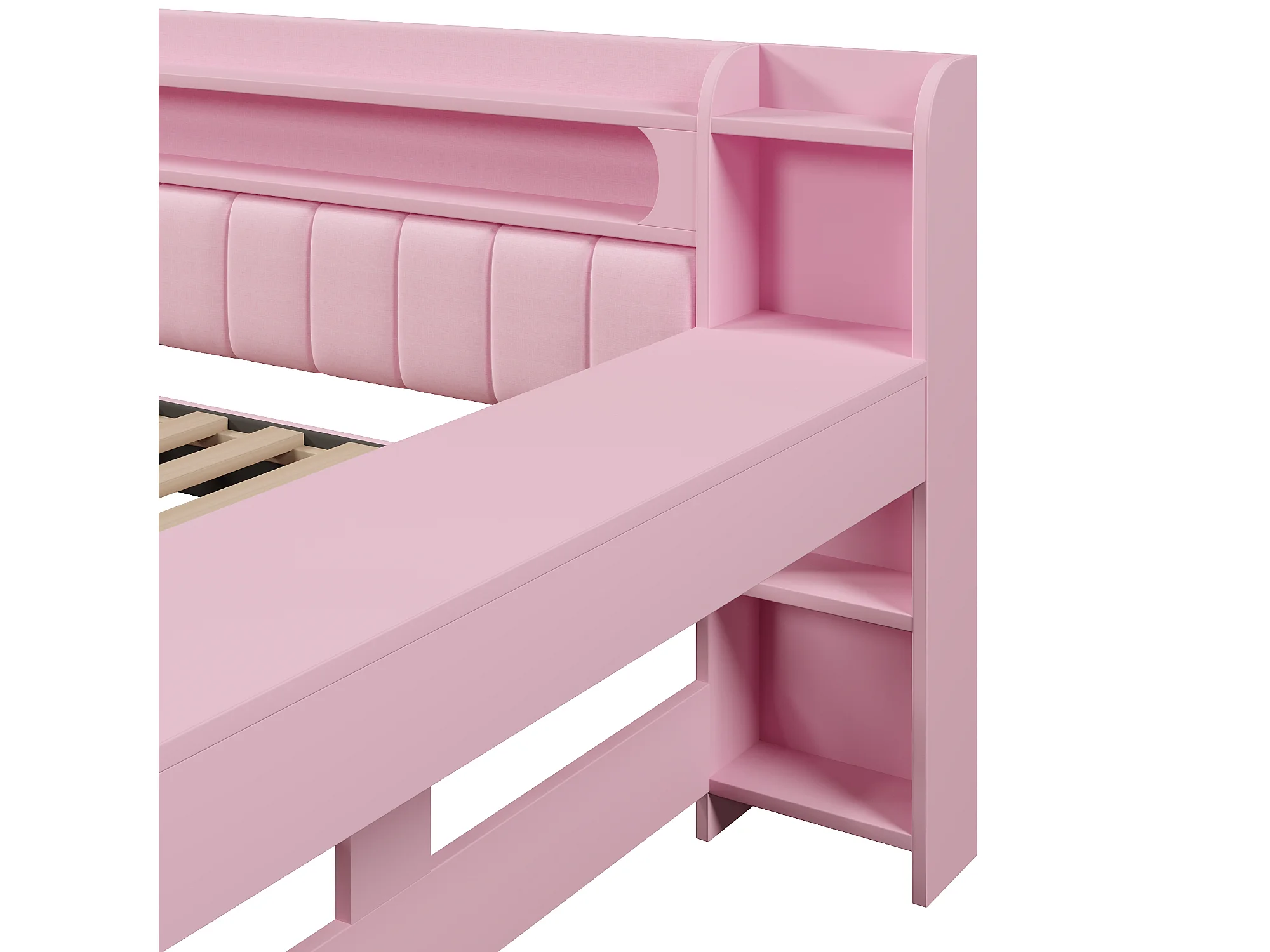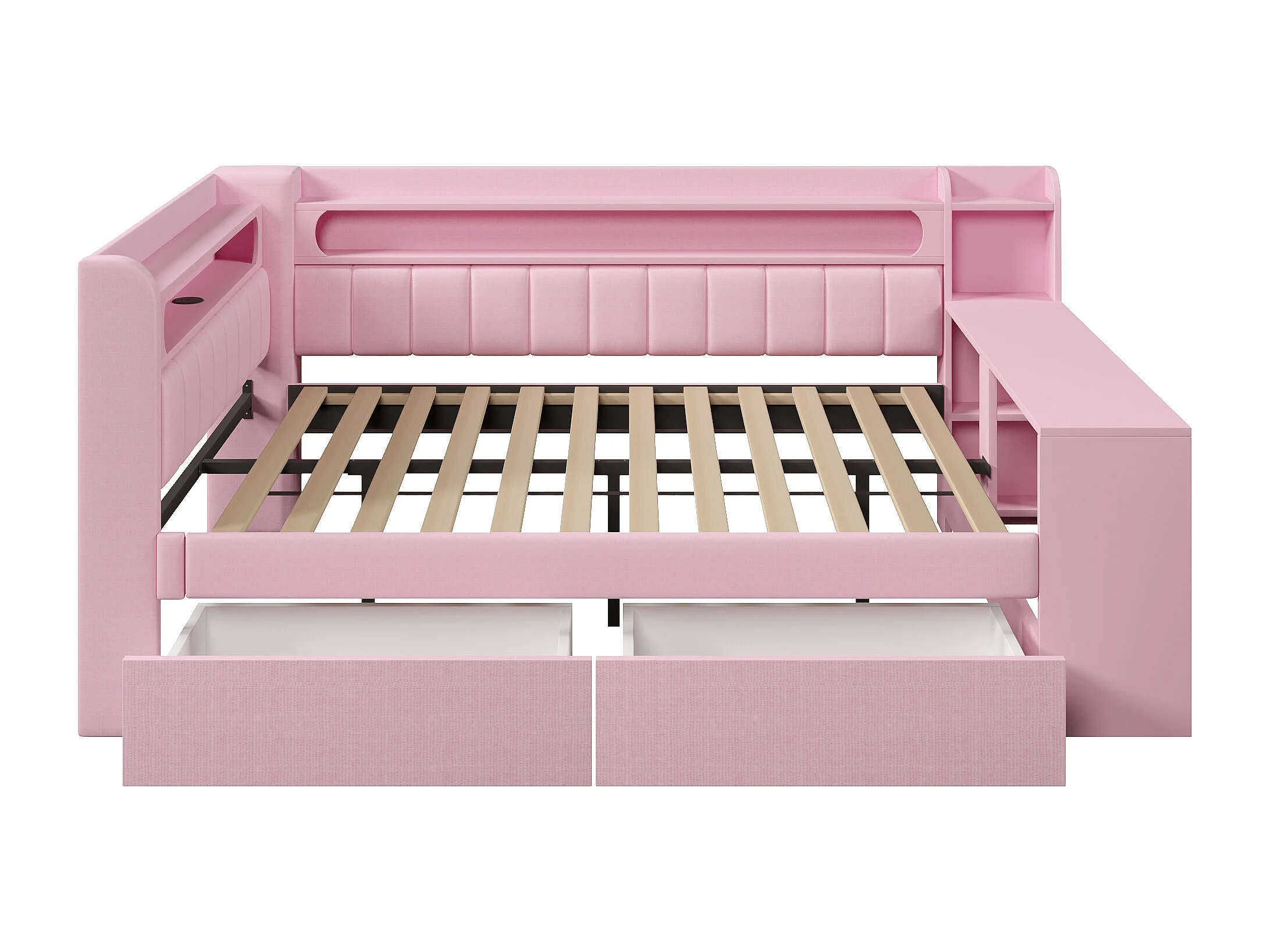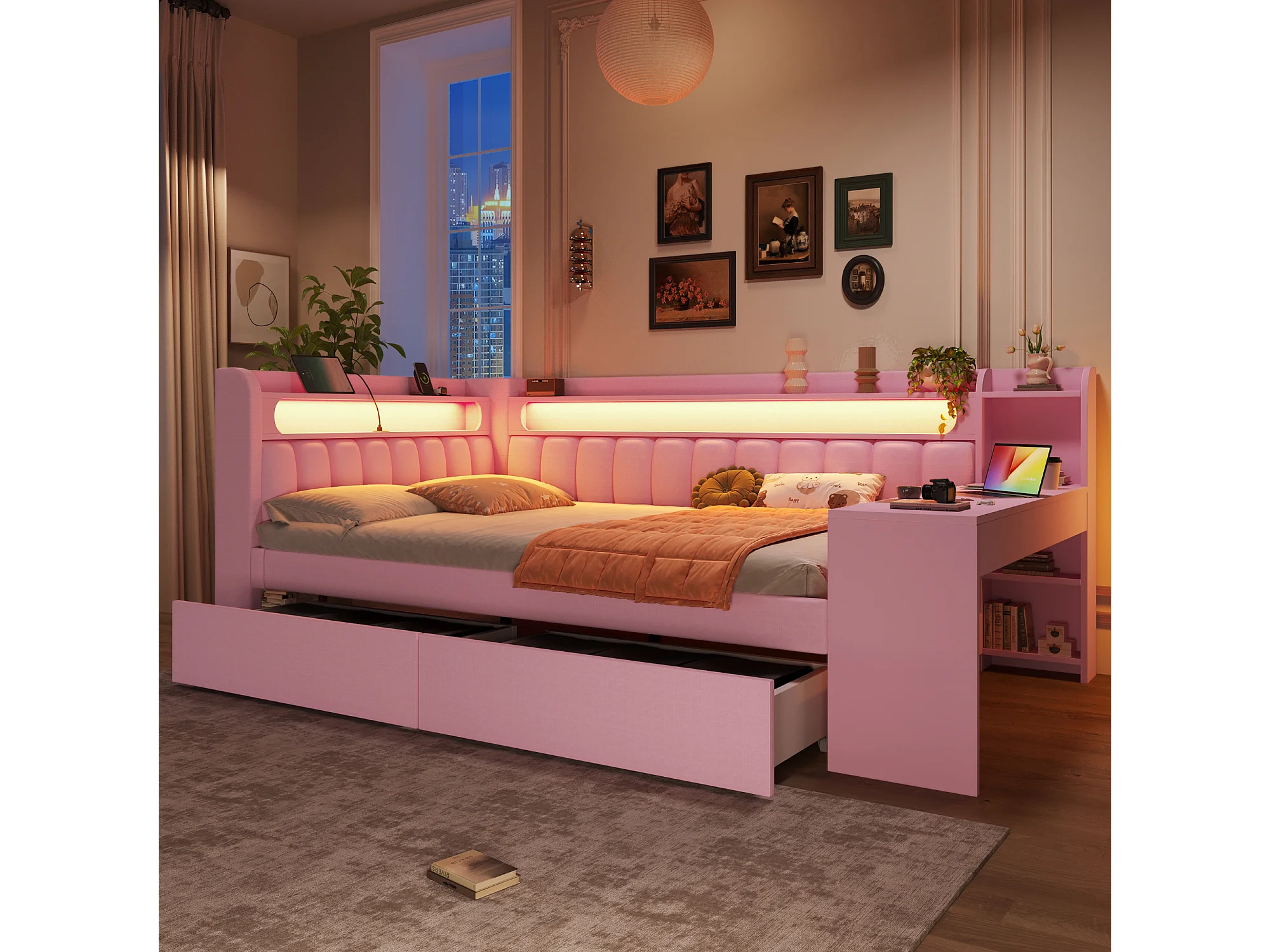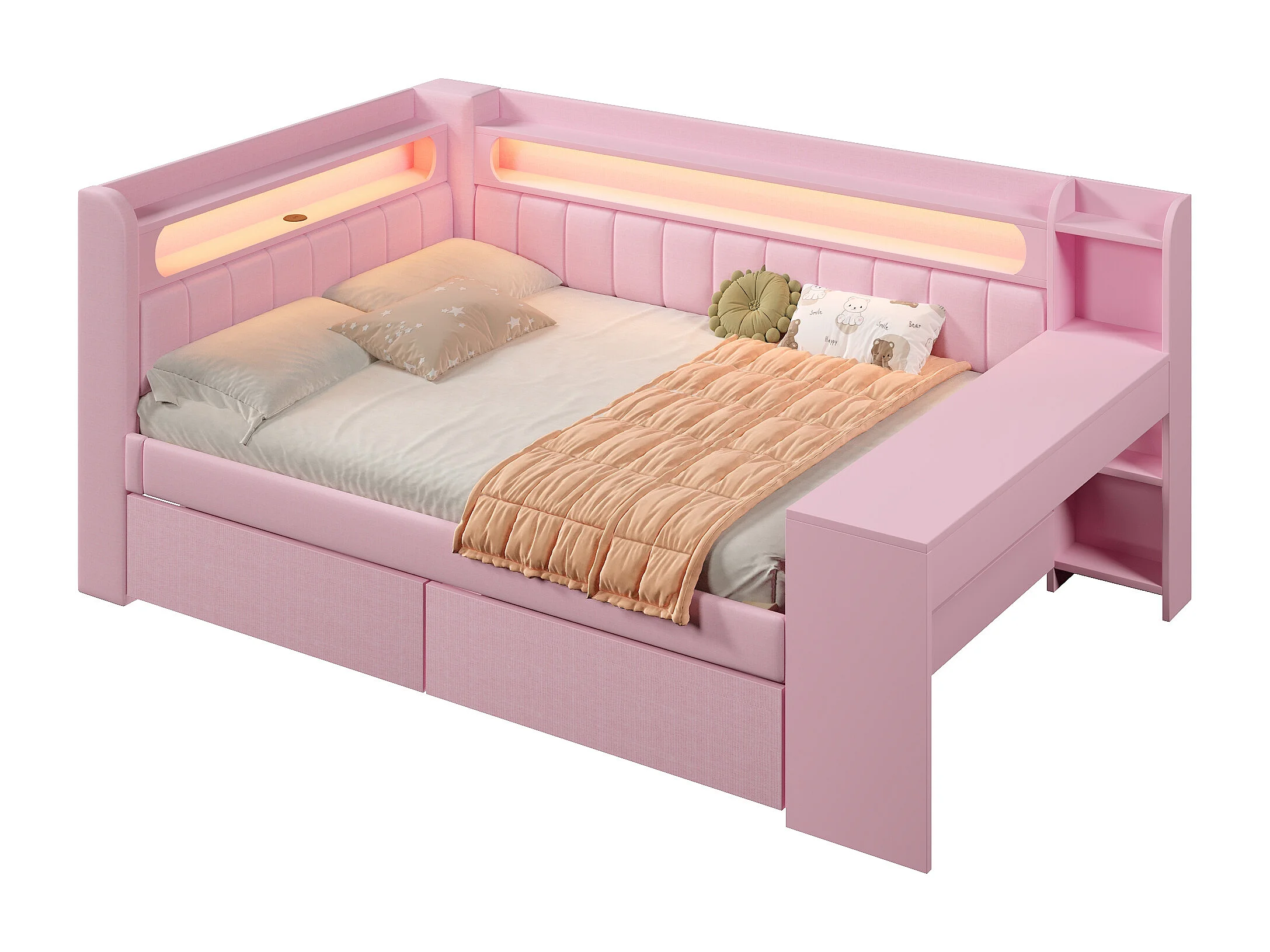 Canapé-lit capitonné 140 x 200 cm - avec LED et port USB - avec bureau et 2 tiroirs - Rose (Matelas non inclus)