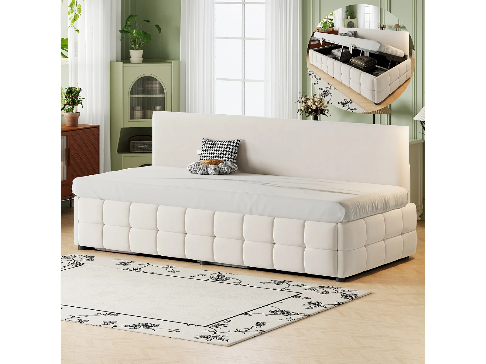 Canapé-lit capitonné 90 x 200 cm - avec rangement hydraulique - dossier sans accoudoirs - lit simple - velours - beige