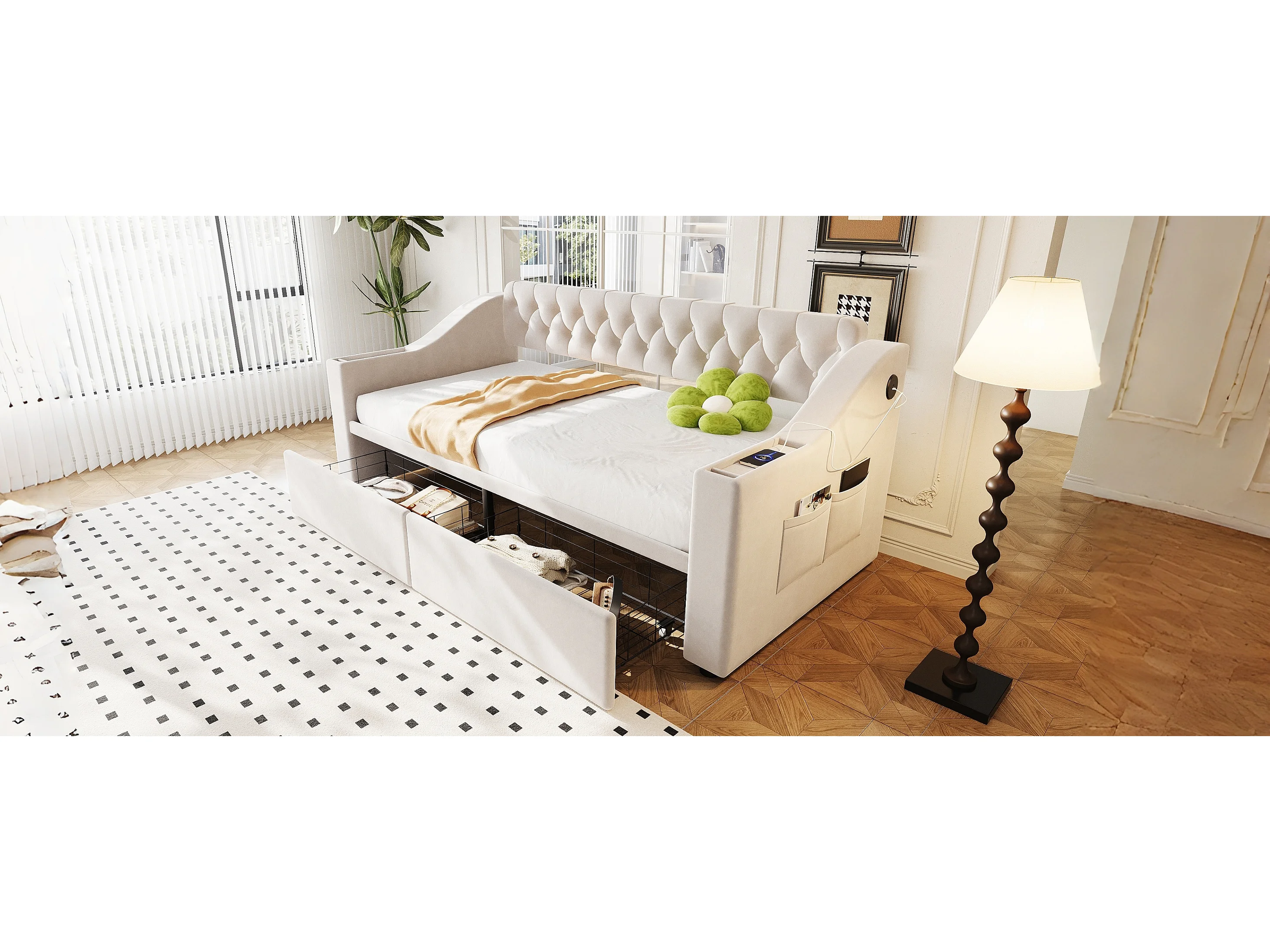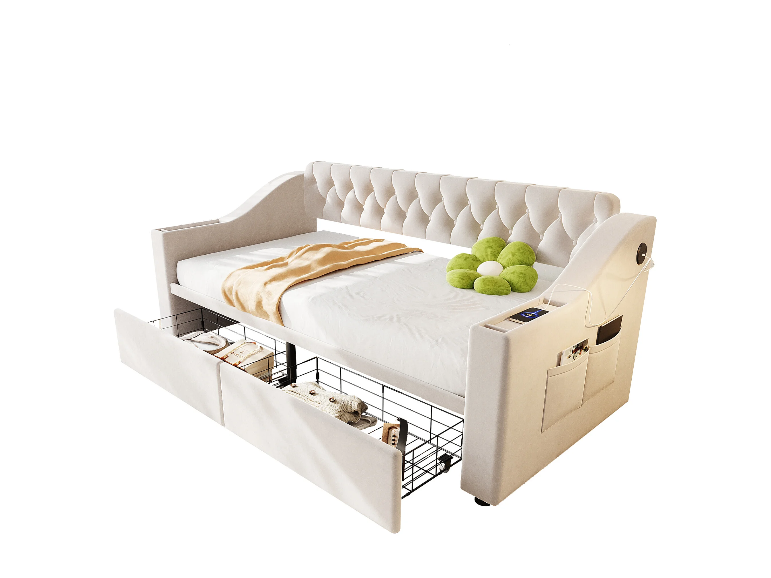 Canapé-lit capitonné enfant - 90 x 190 cm - avec accoudoirs de rangement + USB + 2 tiroirs - velours - beige