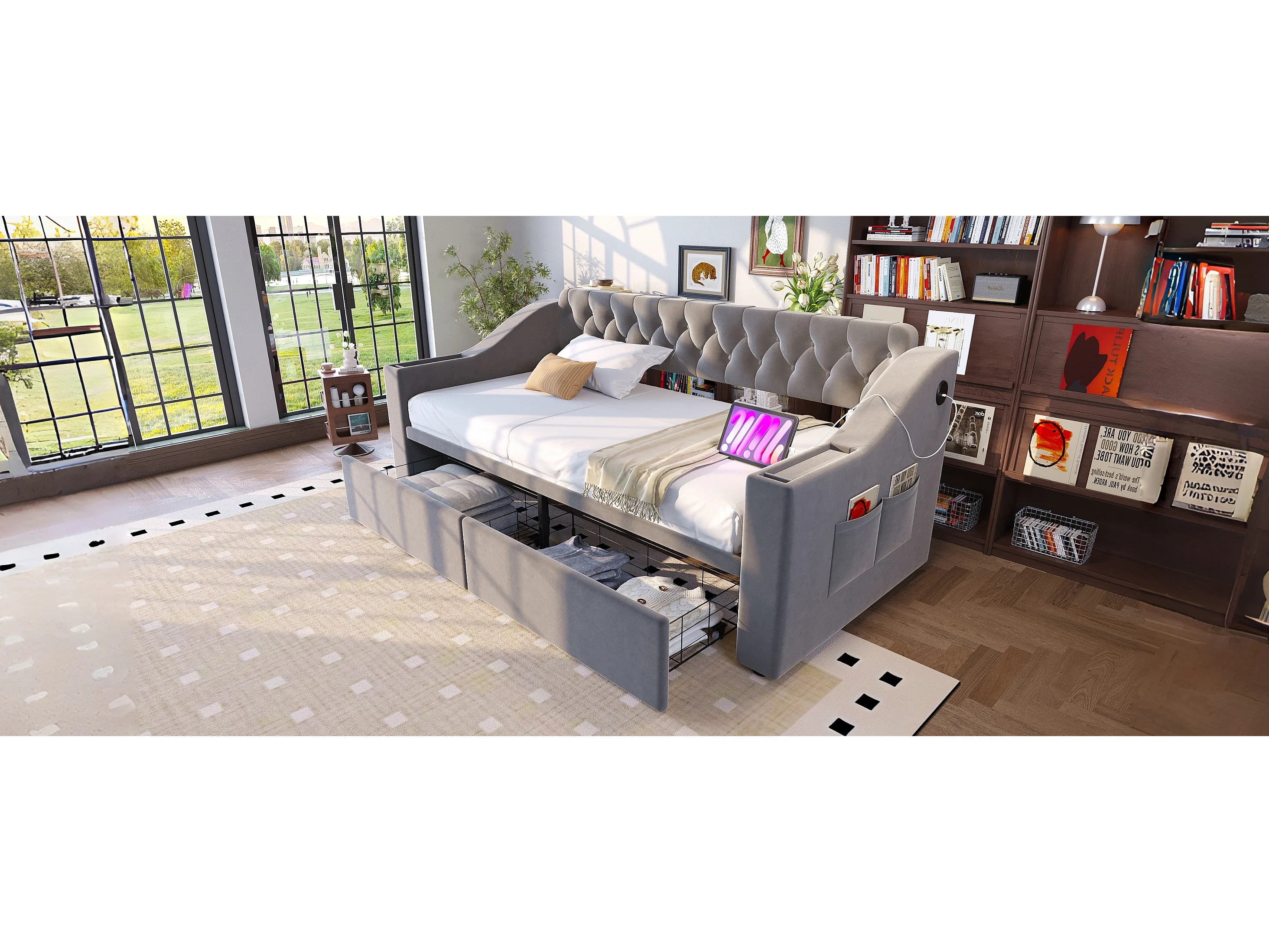 Canapé-lit capitonné enfant - 90 x 190 cm - avec accoudoirs de rangement + USB + 2 tiroirs - velours - gris clair