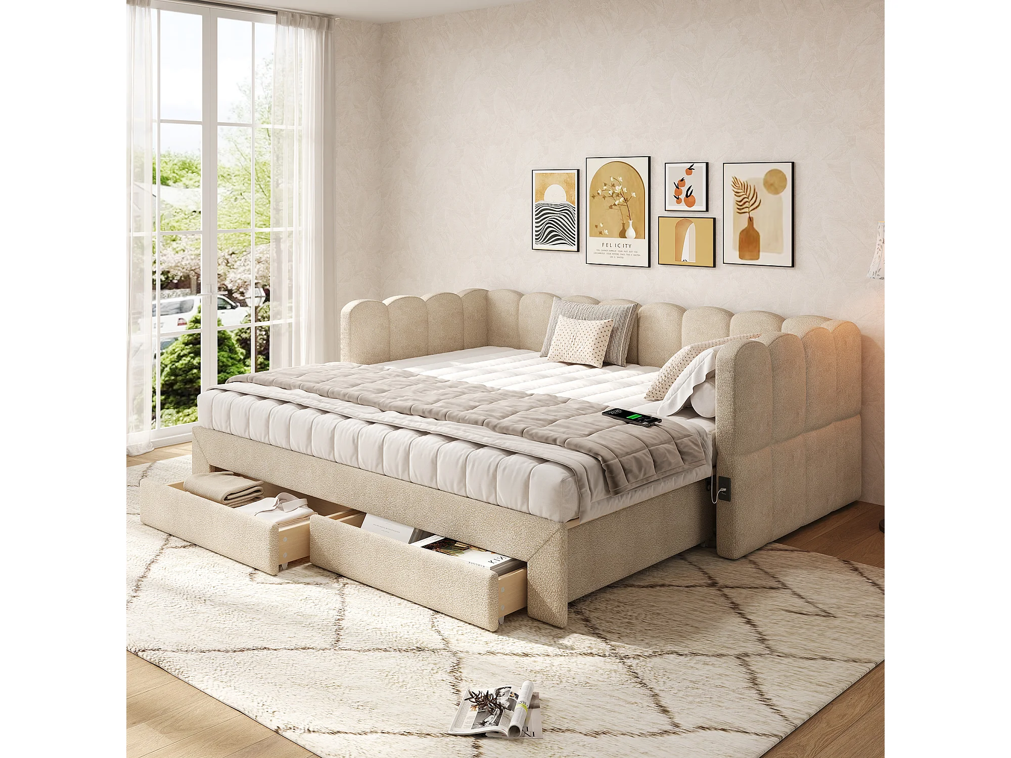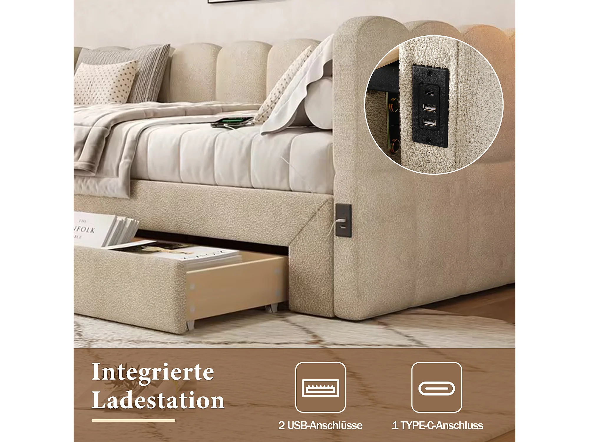 Canapé-lit capitonné pour enfant - 90/180 x 190 cm - avec 2 tiroirs + port USB - Chenille - beige