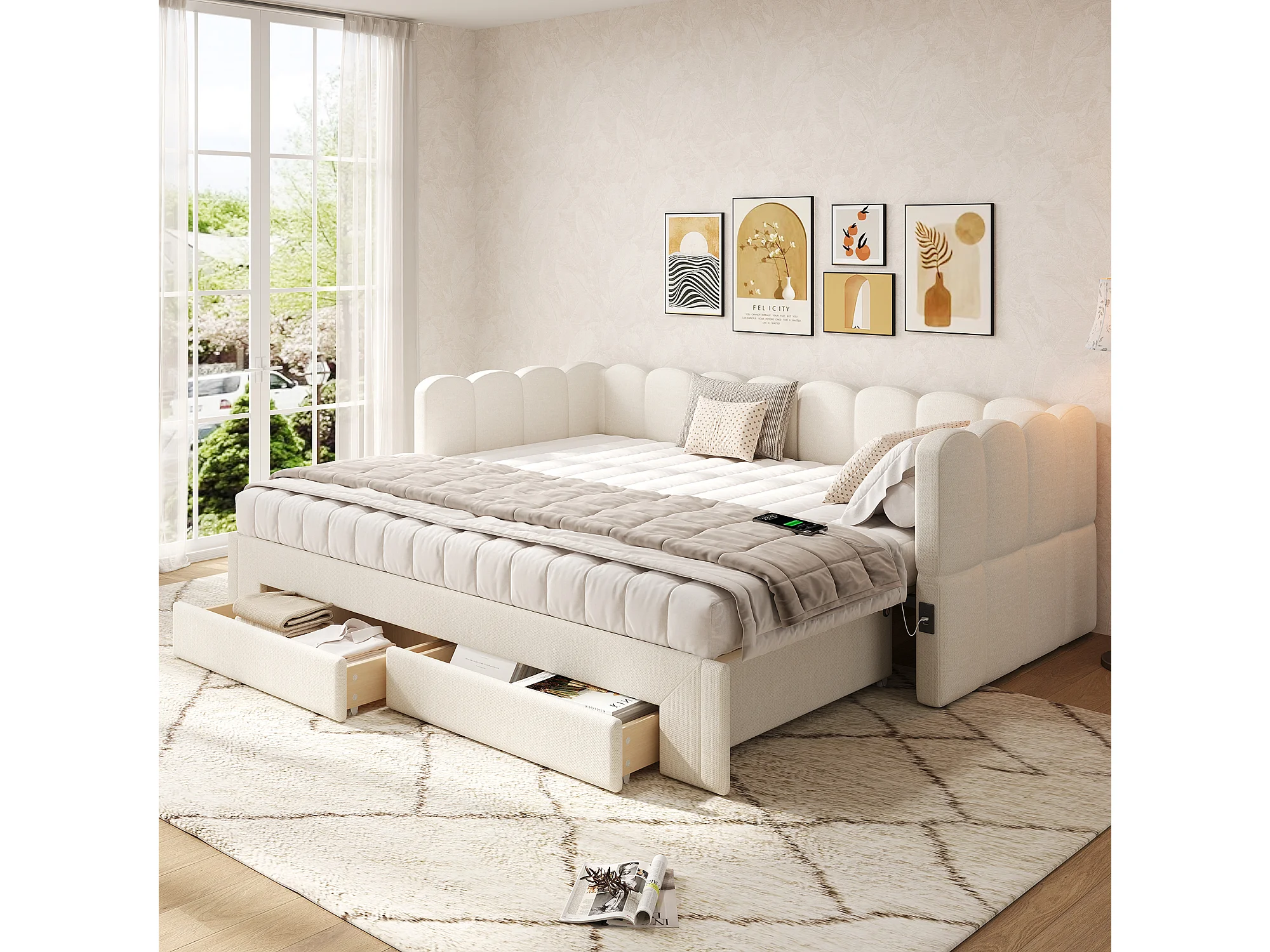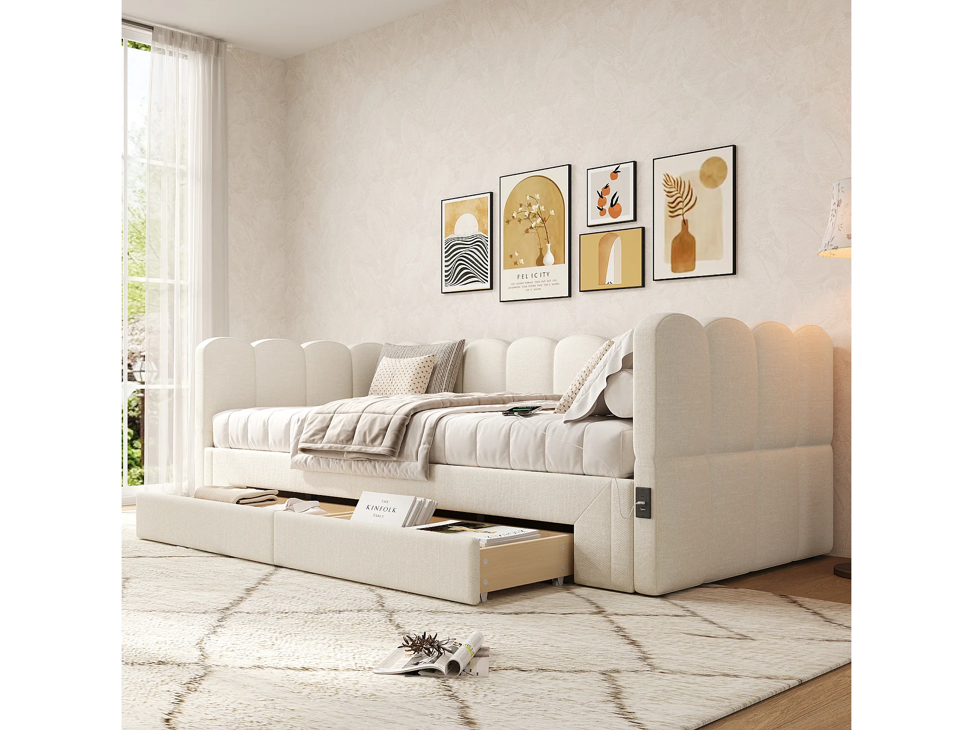 Canapé-lit capitonné pour enfant - 90/180 x 200 cm - avec 2 tiroirs + port USB - lin - beige