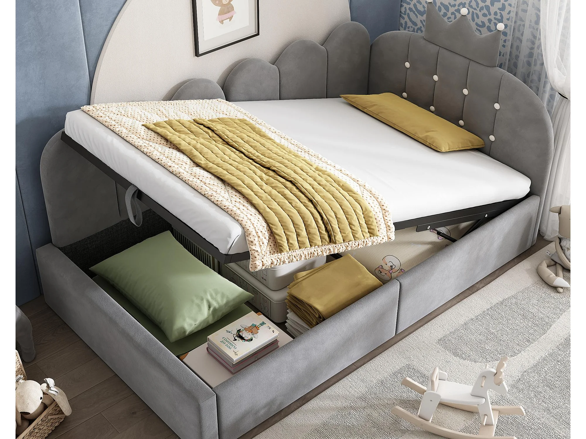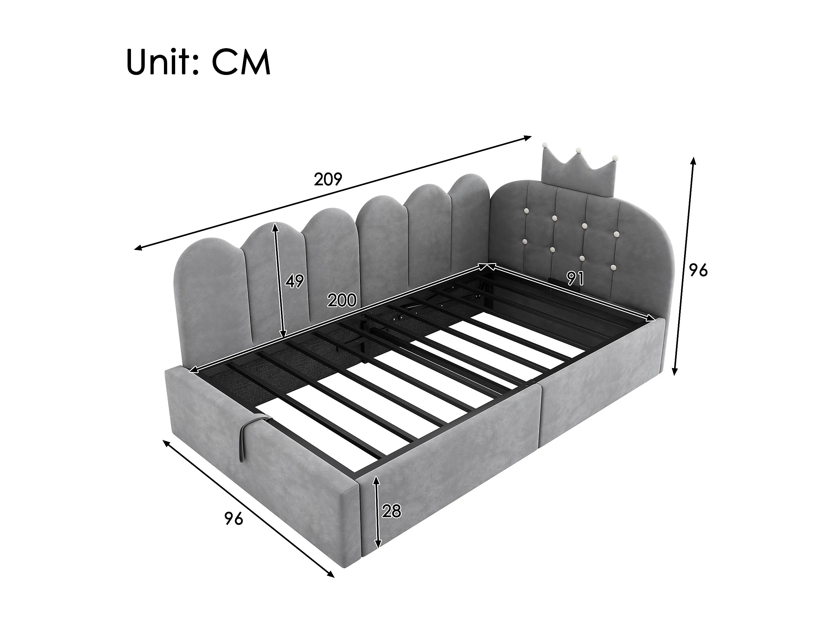 Canapé-lit coffre 90x200 cm - avec rangement - velours - comporte une décoration en forme de couronne - Gris(sans matelas)