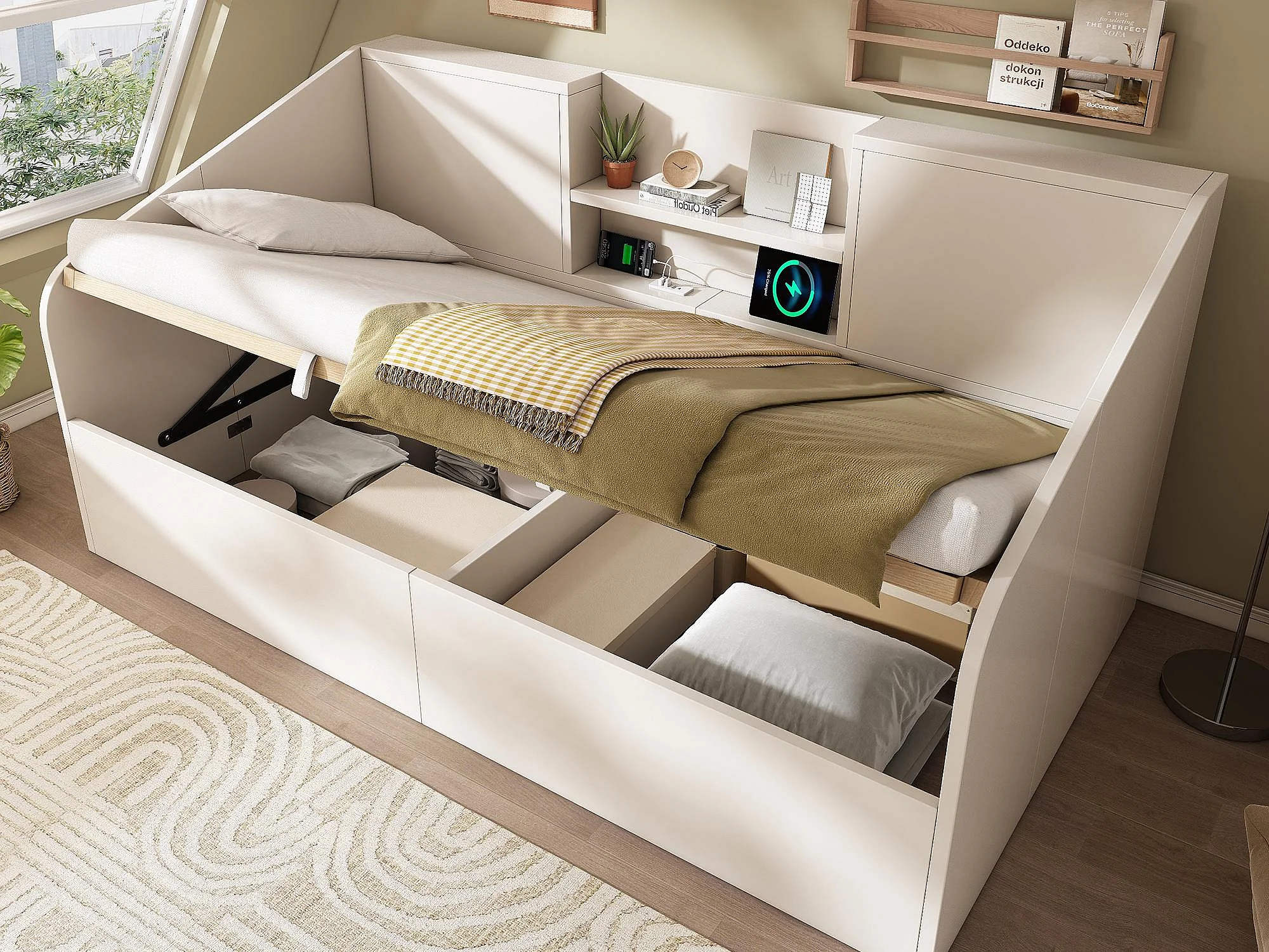 Canapé-lit coffre 90x200cm - avec USB/Type-C - avec 2 étagères - MDF + bois massif - blanc (matelas non inclus)