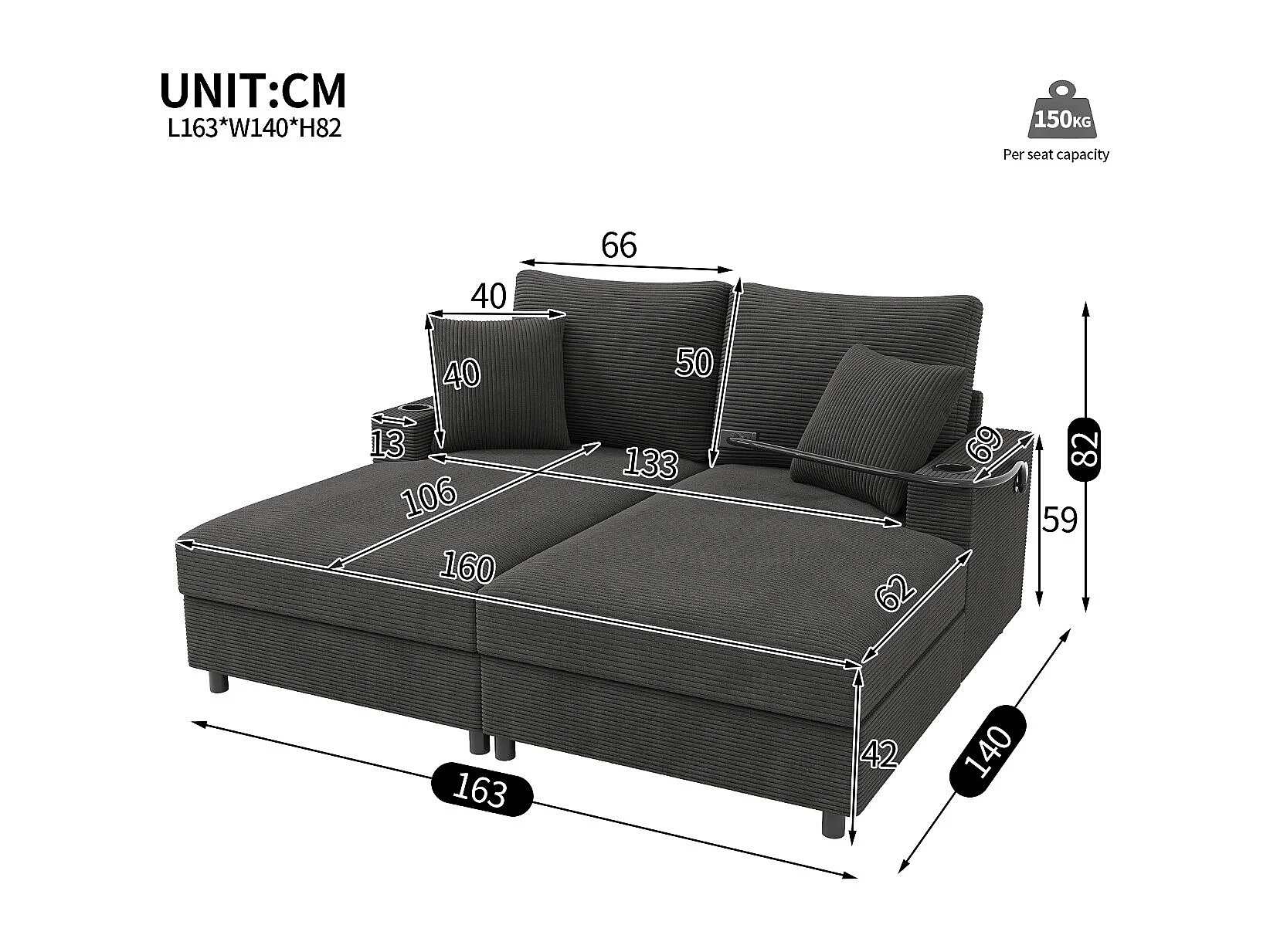 Canapé-lit double convertible avec ports USB et porte-gobelets Gris - Confort moderne avec fonctionnalités pratiques