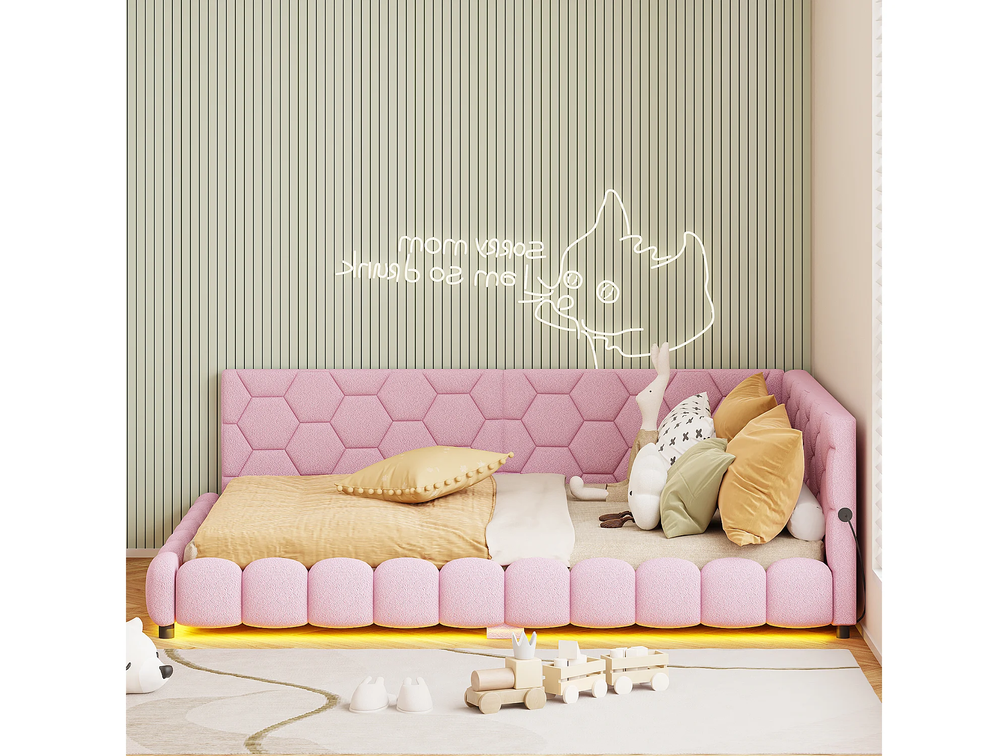 Canapé-lit double rembourré 140 x 200 cm avec LED et USB, cadre de lit avec sommier à lattes, rose