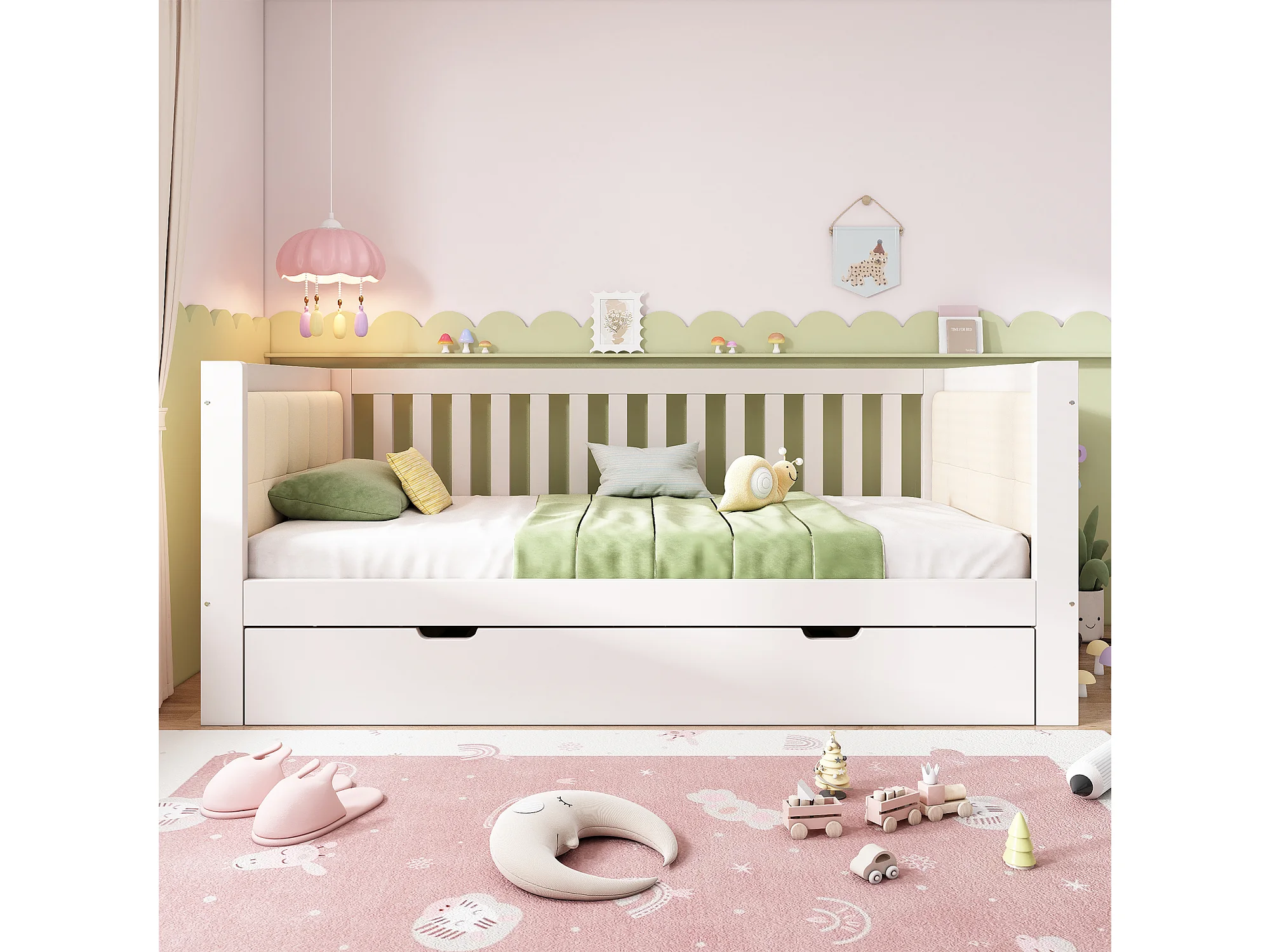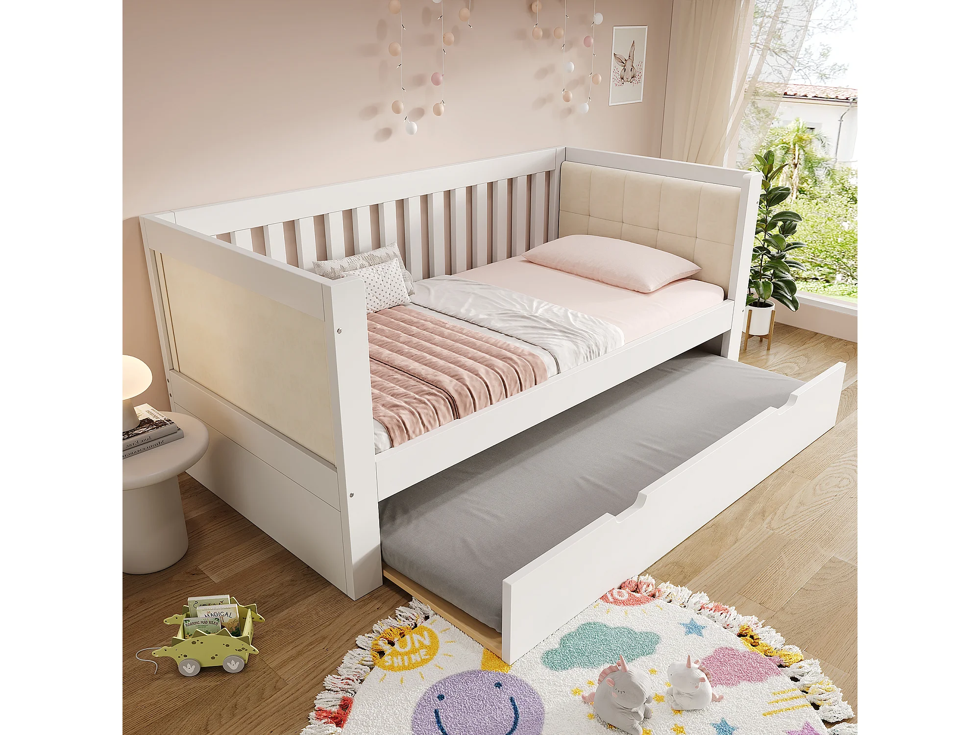 Canapé-lit en bois - 90 x 190 cm - avec lit gigogne 90 x 190 cm + accoudoirs et dossier - blanc