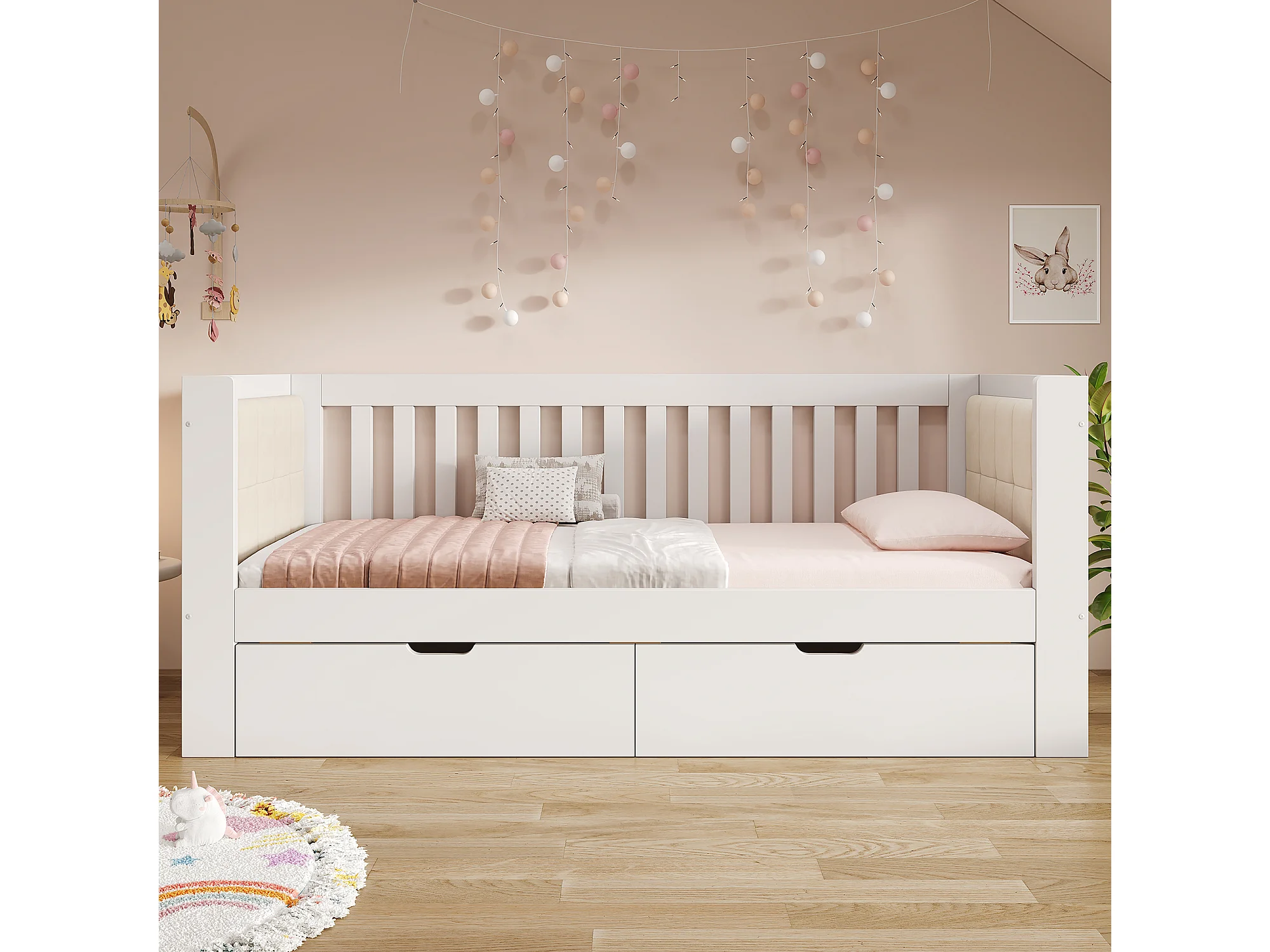 Canapé-lit en bois - 90 x 200 cm - avec 2 tiroirs + accoudoirs et dossier - blanc