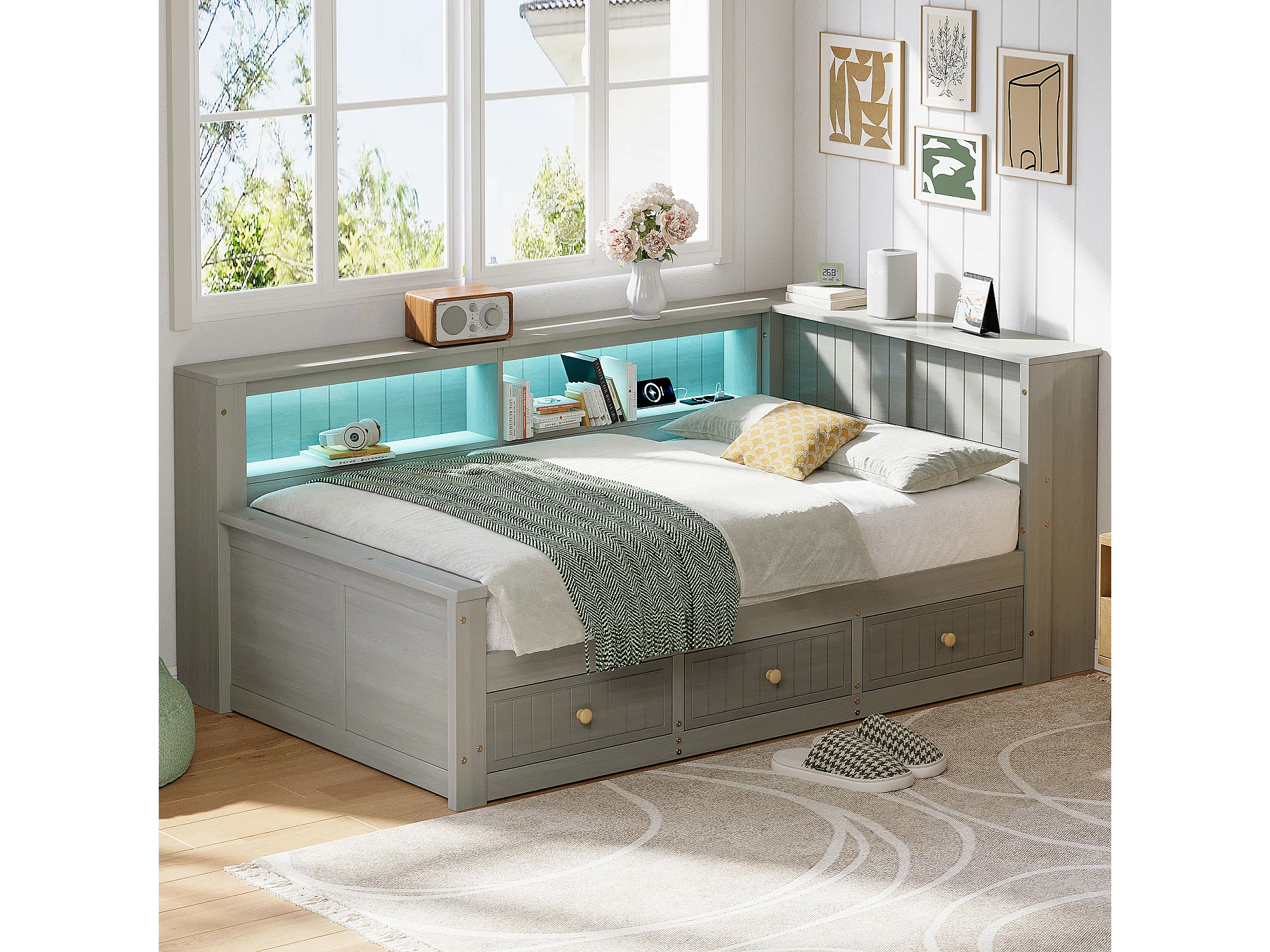 Canapé-lit en bois 90x200 cm - avec éclairage LED - 3 tiroirs - Étagères de rangement - MDF - Gris (matelas non inclus)