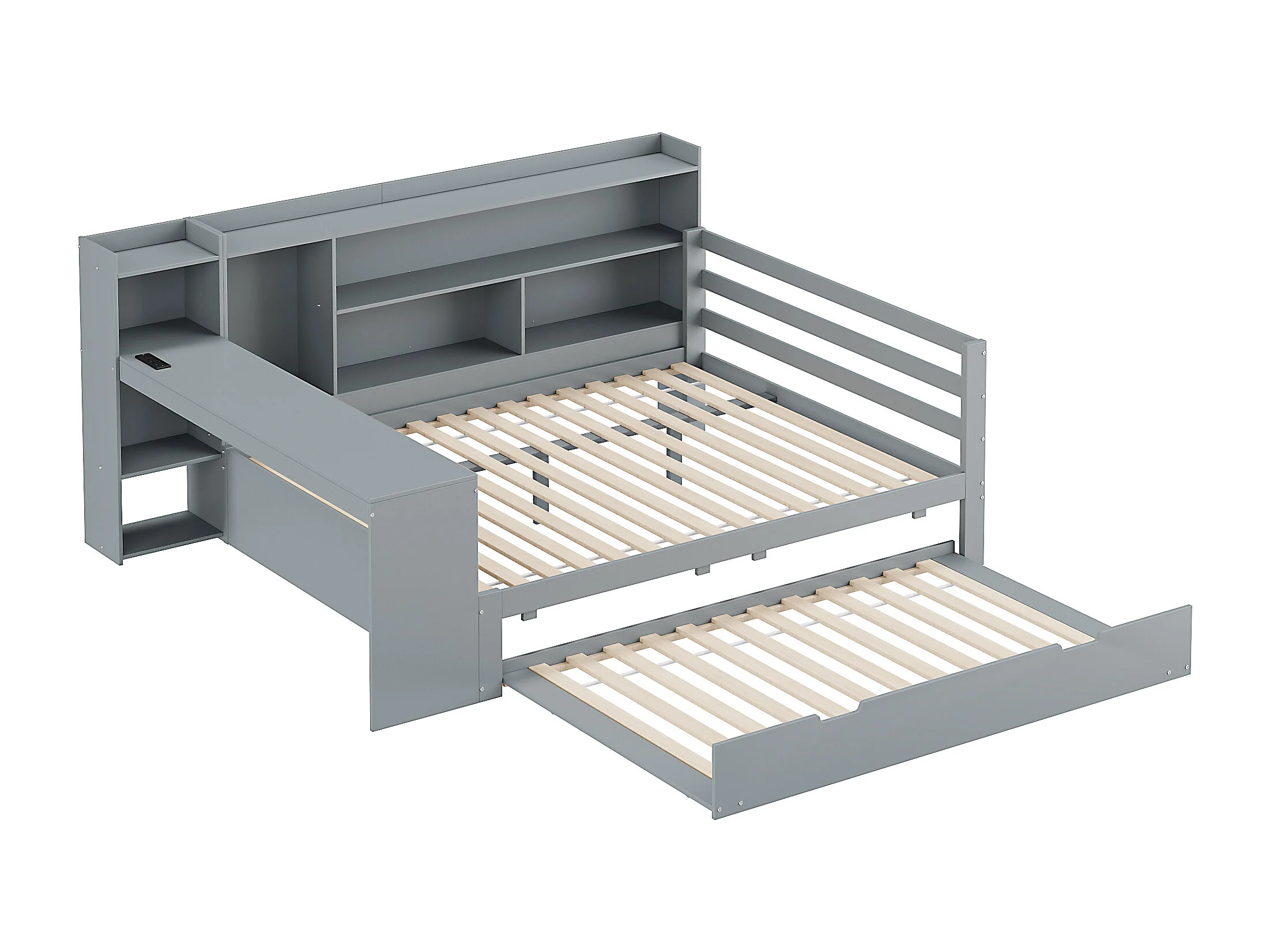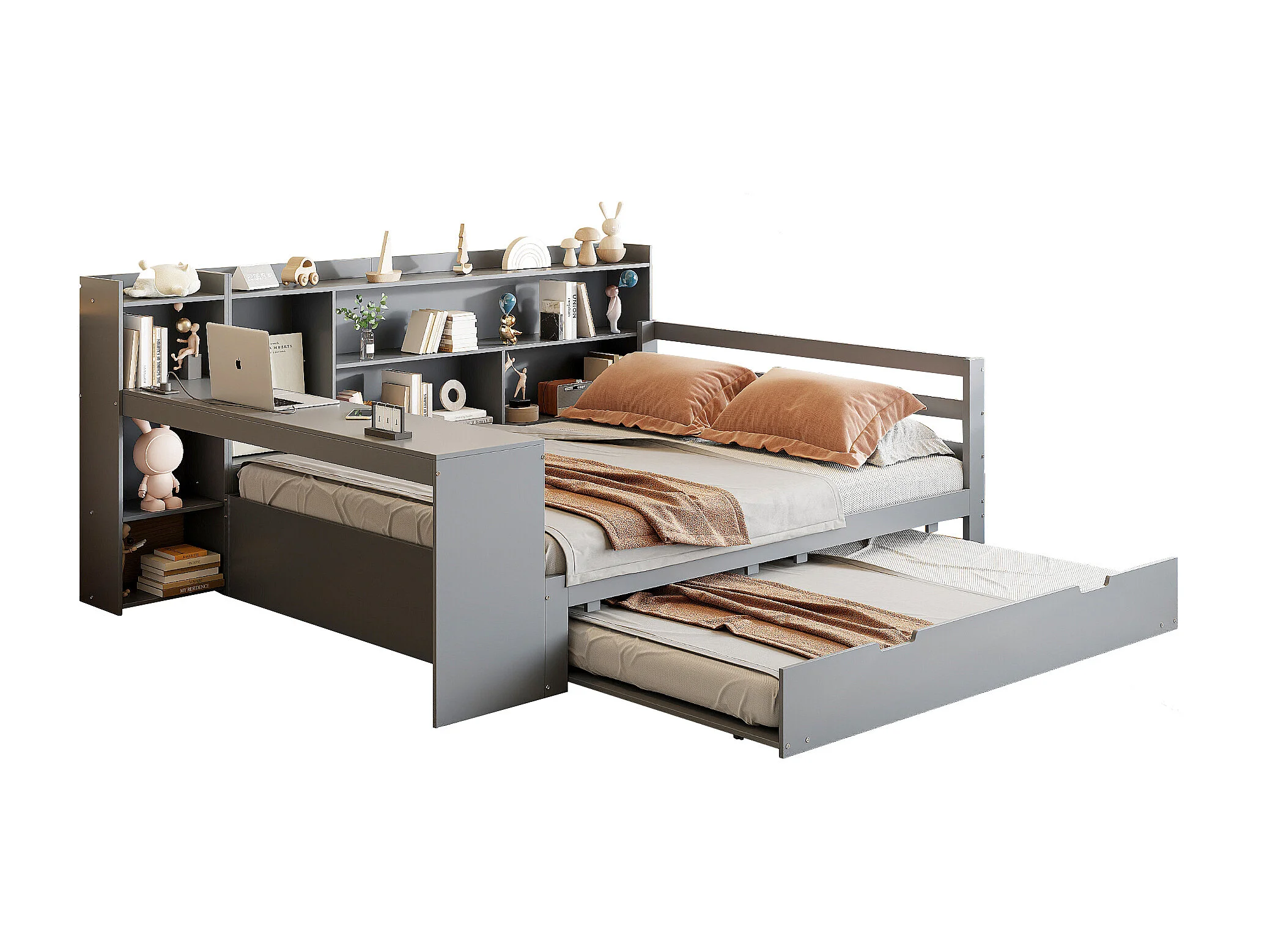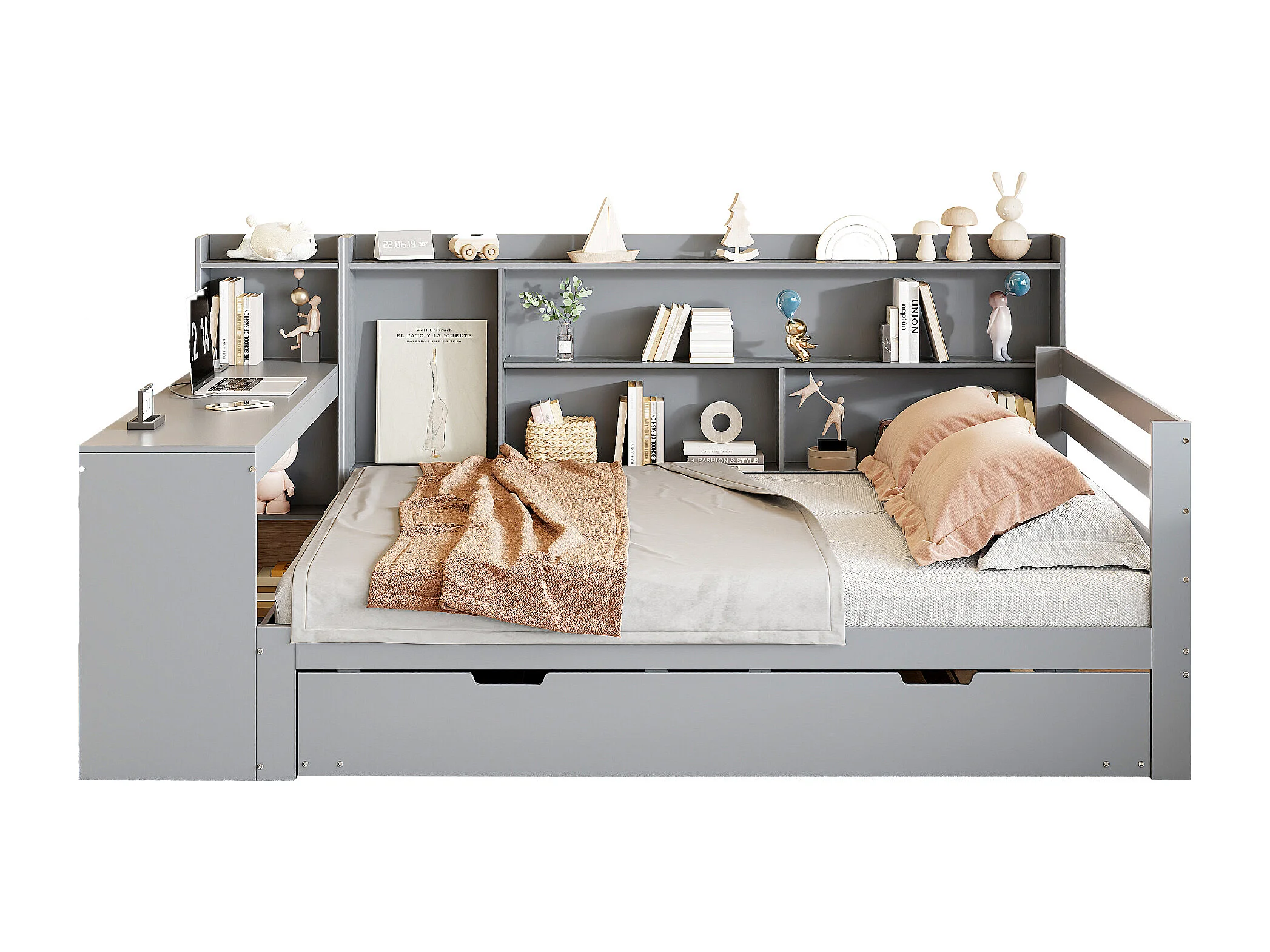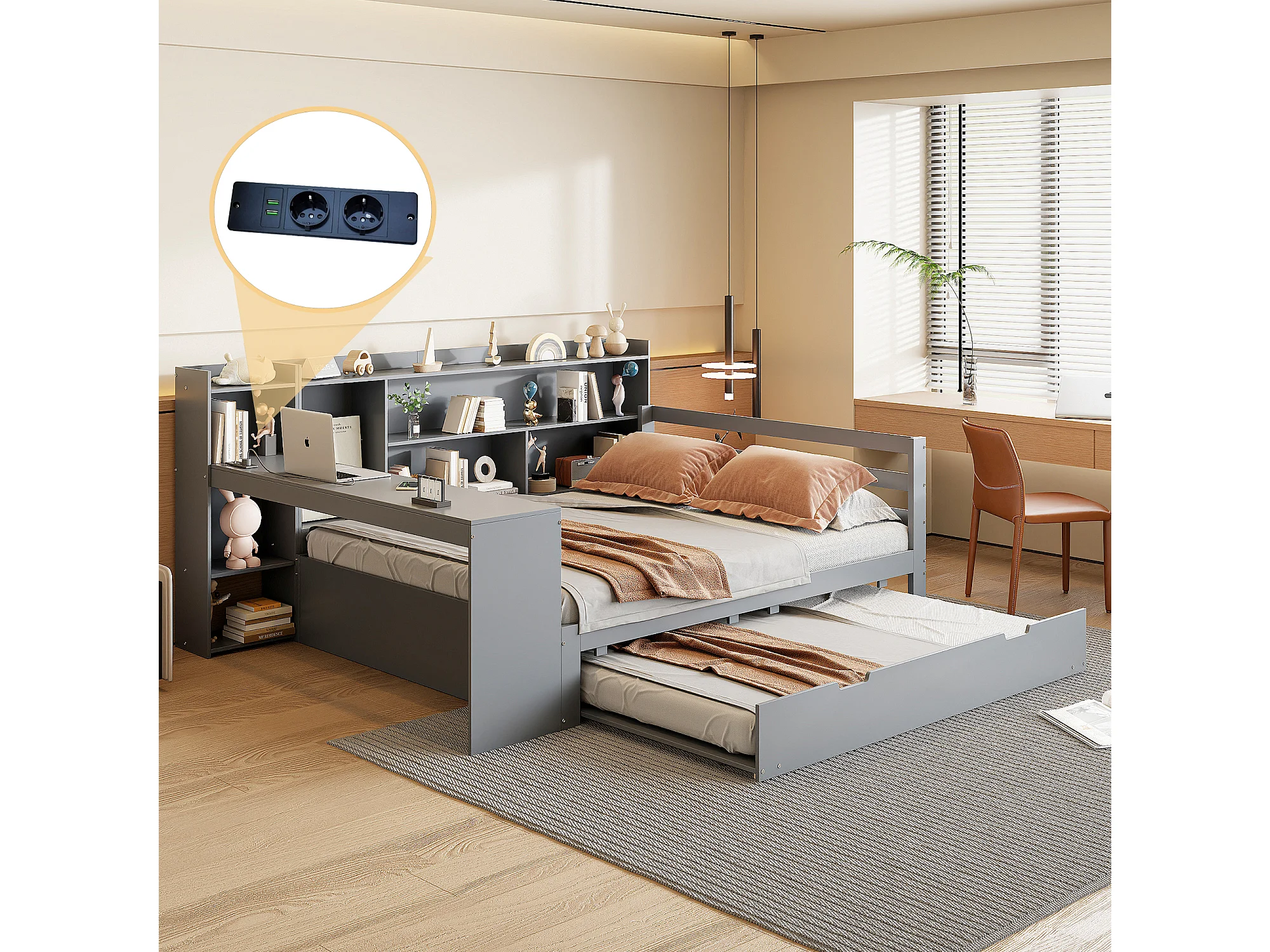 Canapé-lit en bois massif avec bureau et étagères, avec prise USB et lit escamotable, gris (245.5x165x100 cm)
