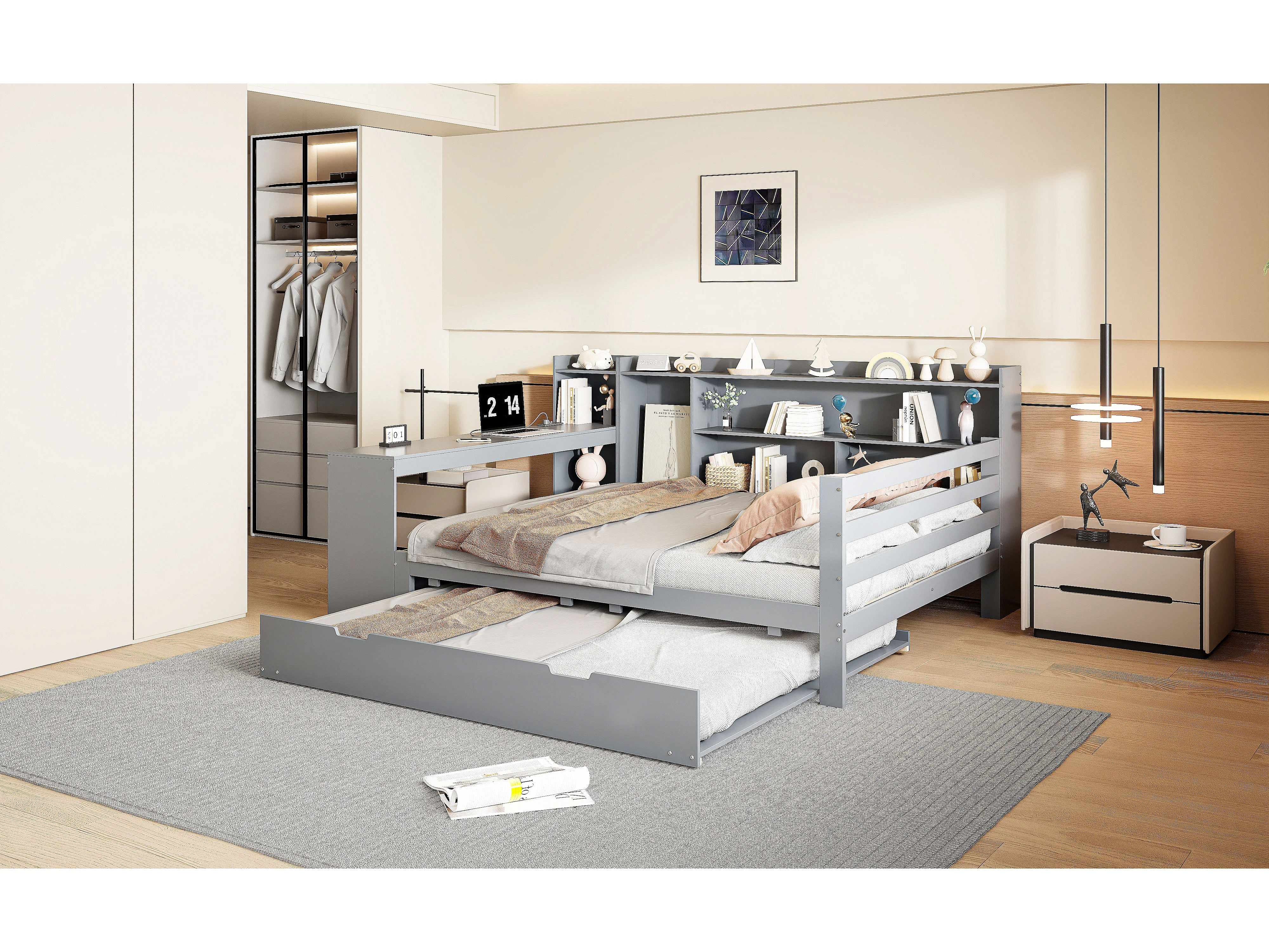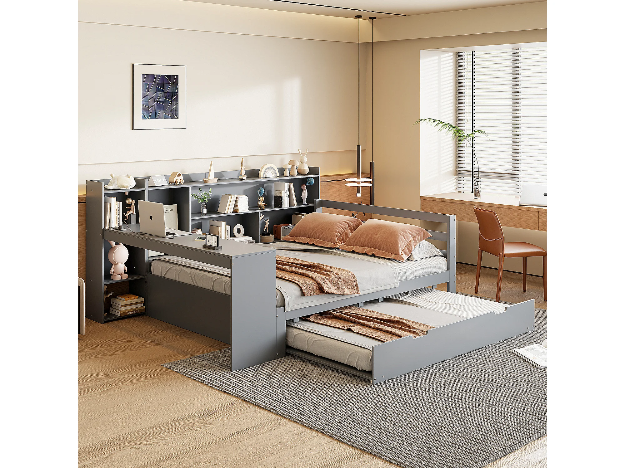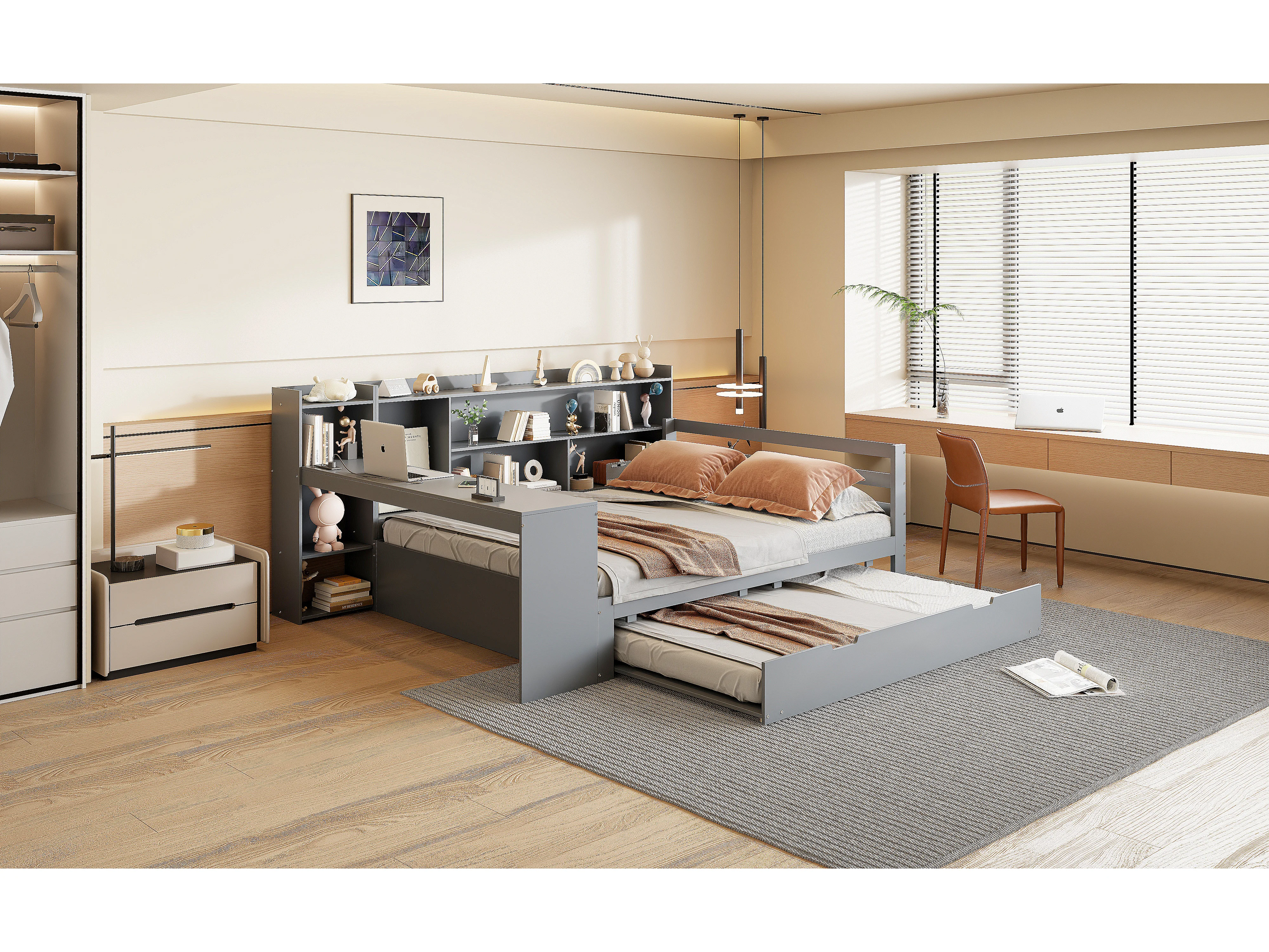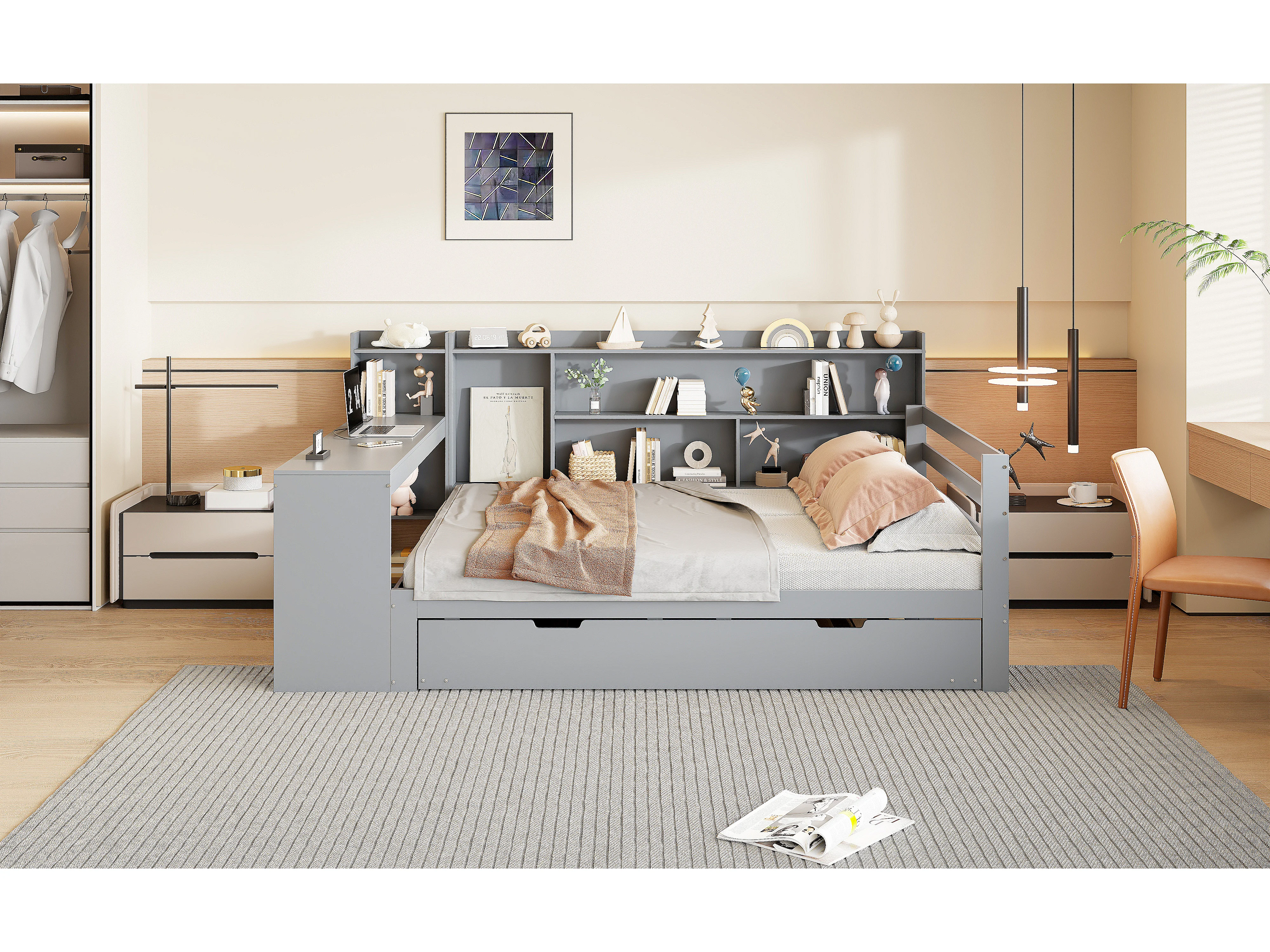 Canapé-lit en bois massif avec bureau et étagères, avec prise USB et lit escamotable, gris (245.5x165x100 cm)