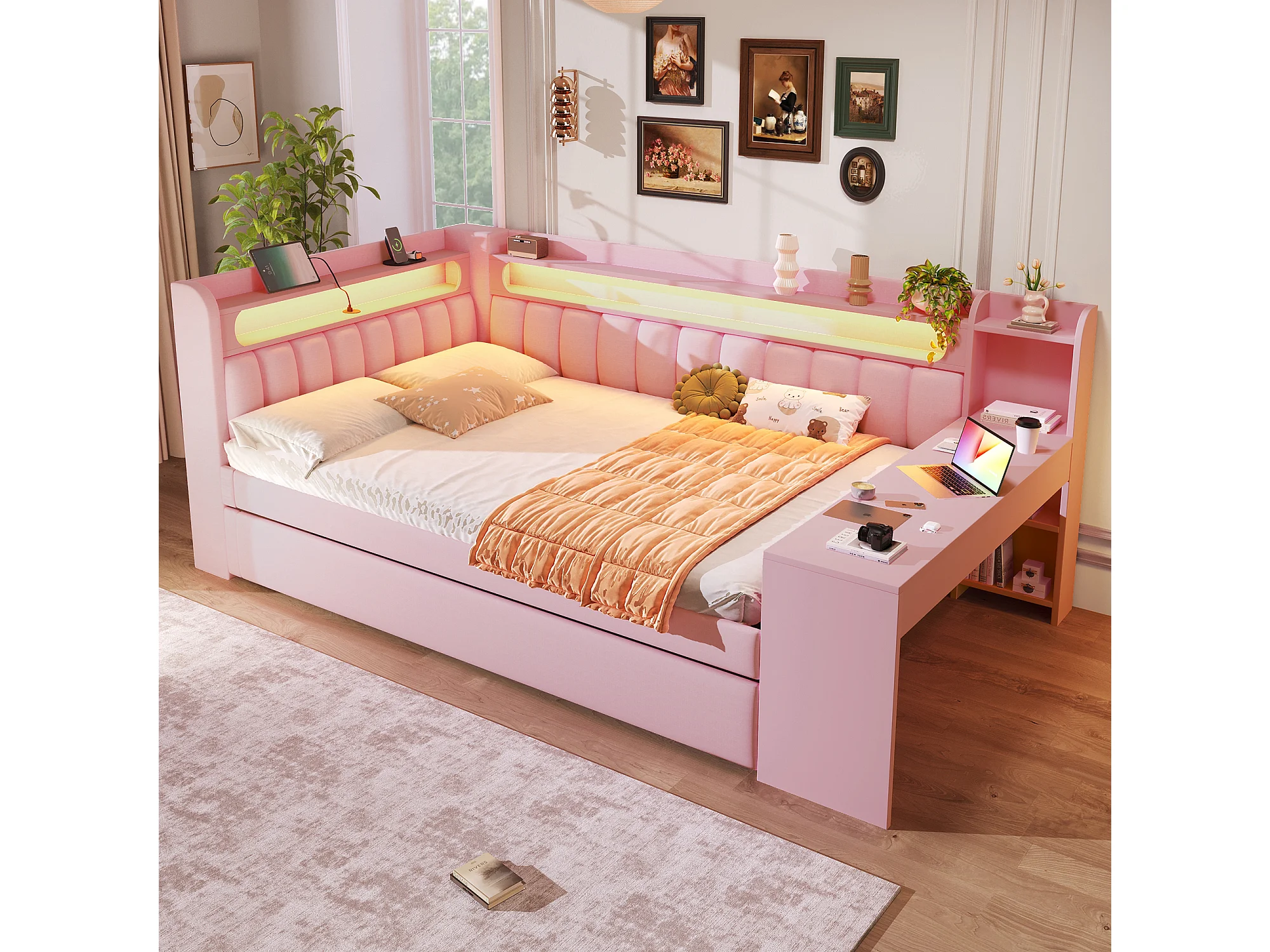 Canapé-lit enfant - 140 x 200 - avec lit gigogne 90 x 190 cm + avec Leds + bureau + rangement - MDF + lin - rose