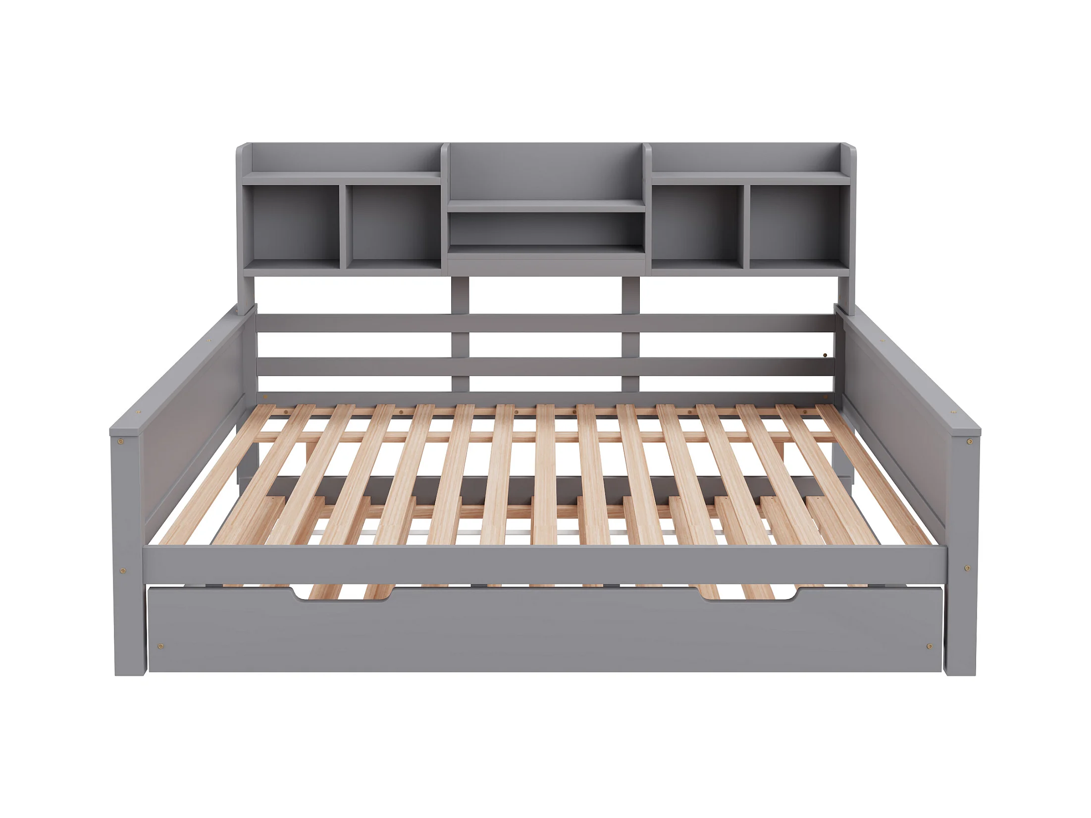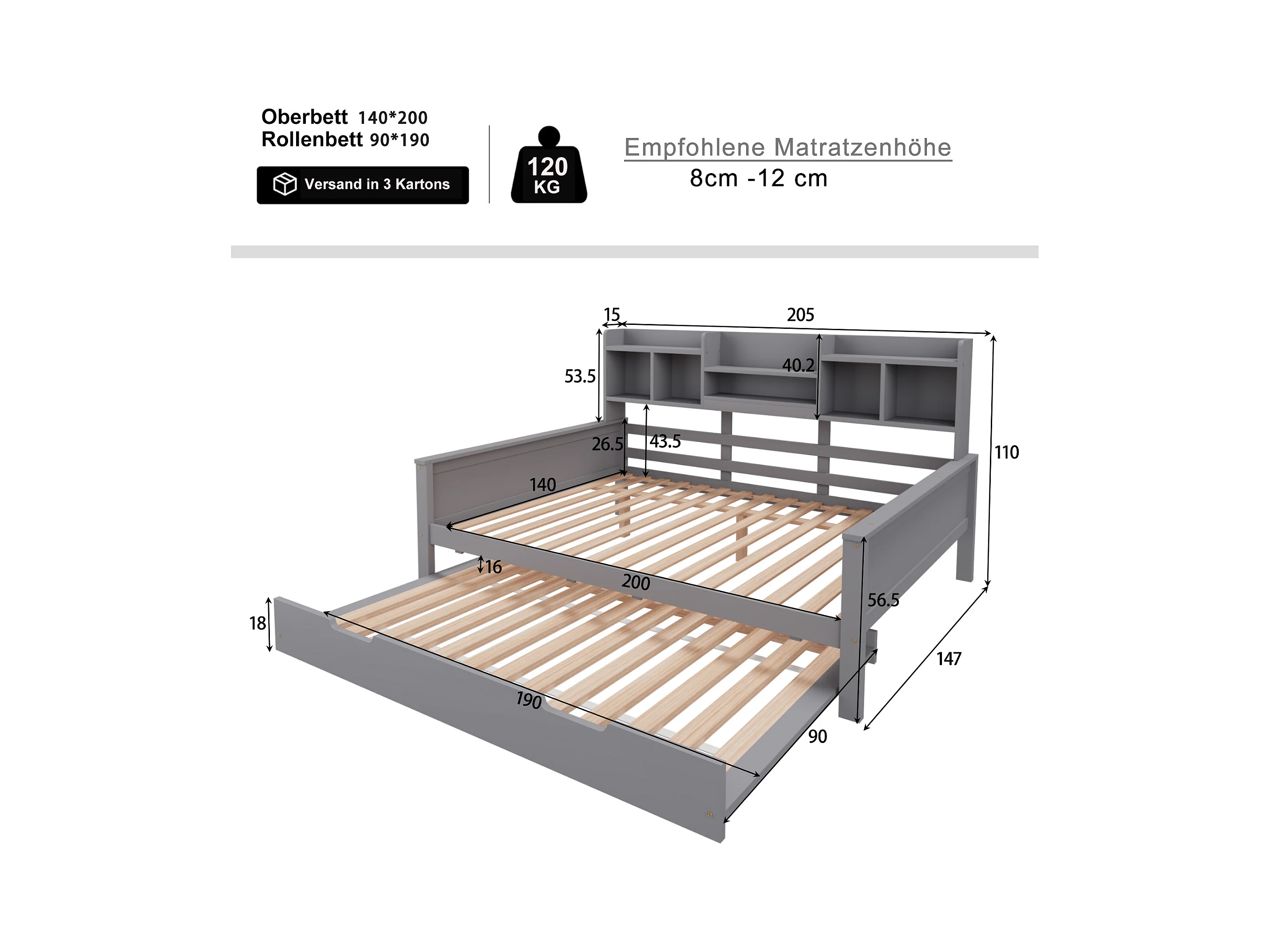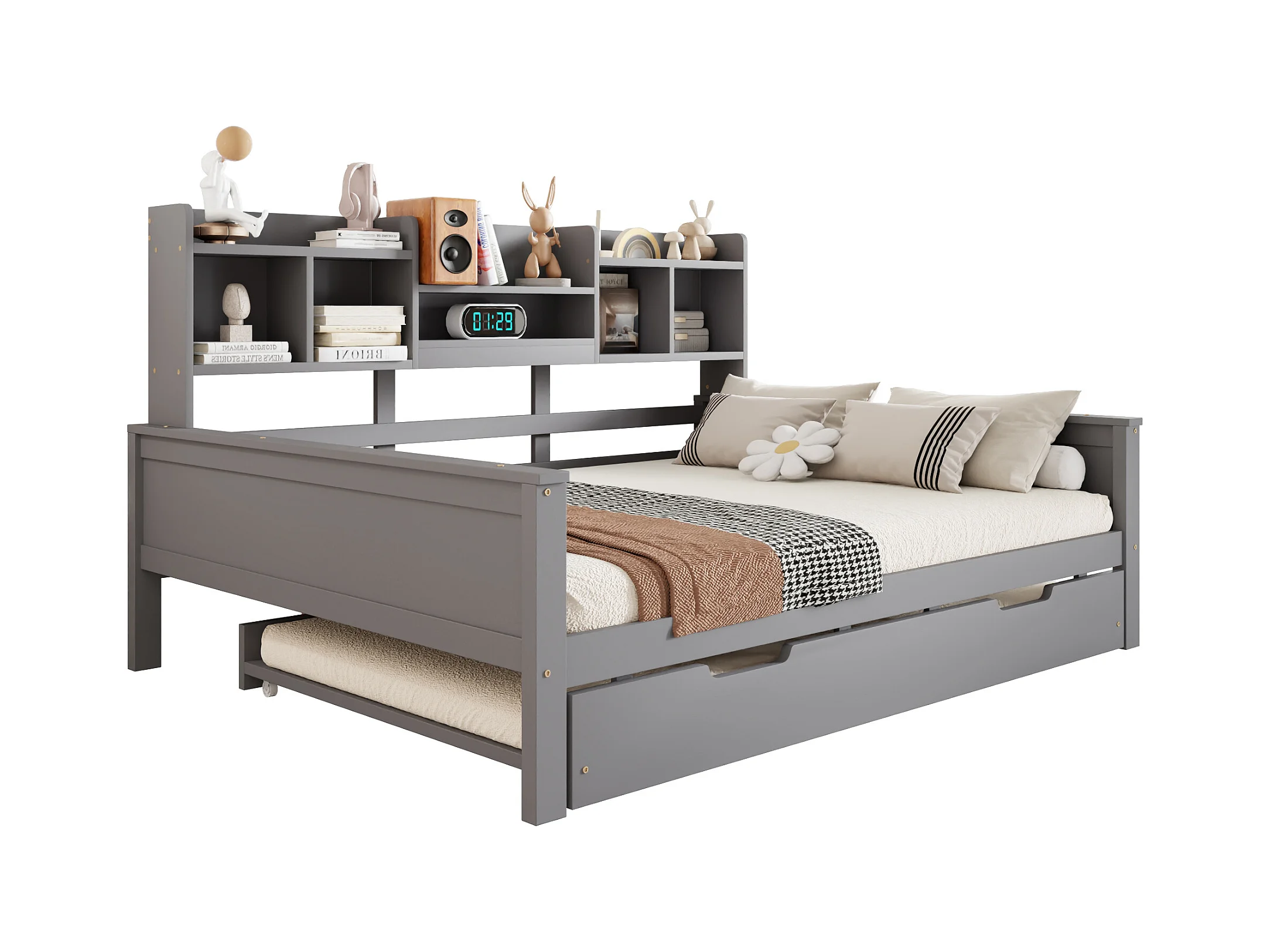 Lit enfant extensible 140x200 cm avec lit gigogne 90x190 cm –cadre en pin avec étagère, gris (sans matelas)