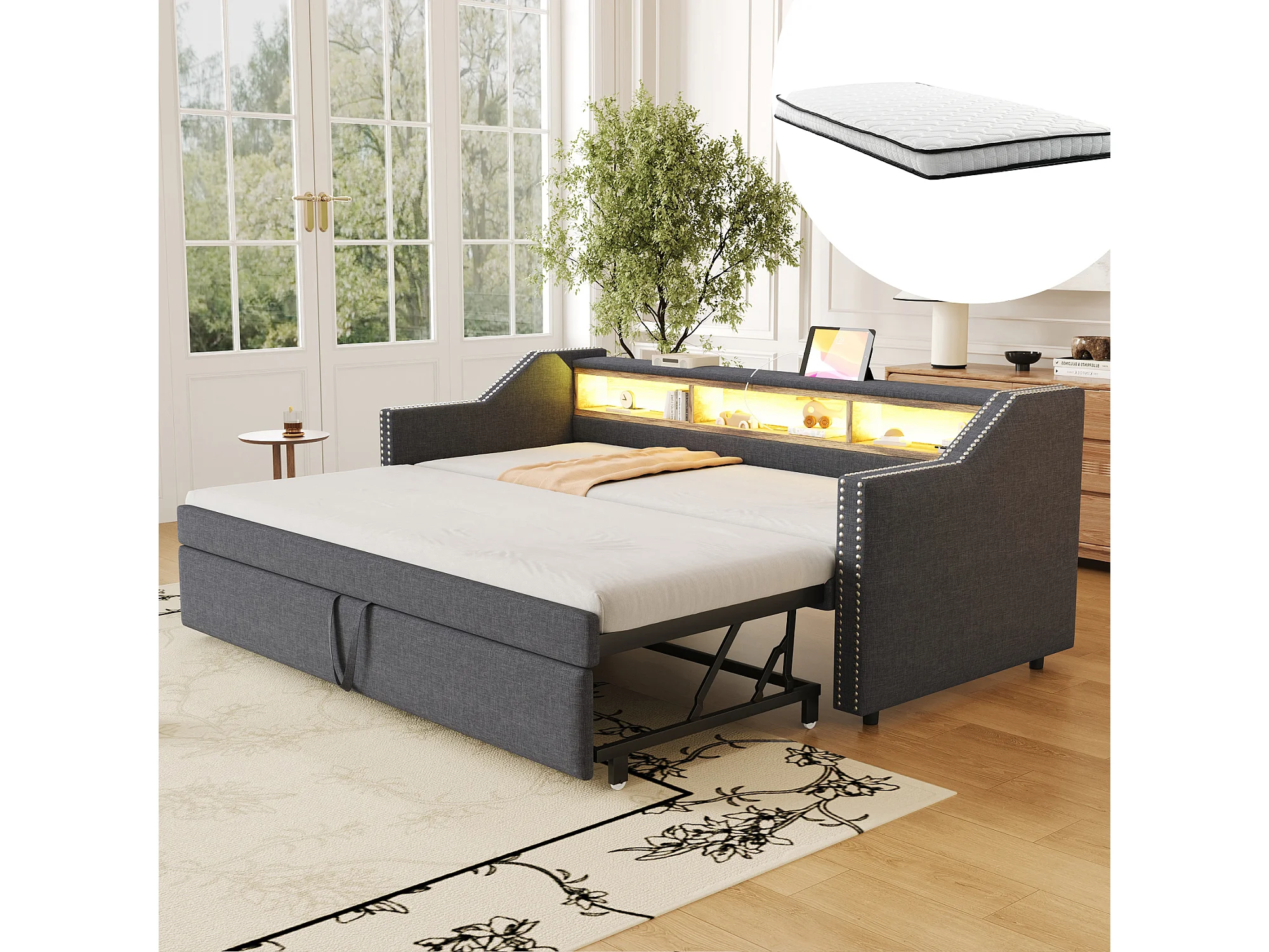 Canapé-lit extensible - 90/180 x 190 cm - avec étagères de rangements + Leds + USB - lin + MDF - gris foncé (avec 2 matelas)