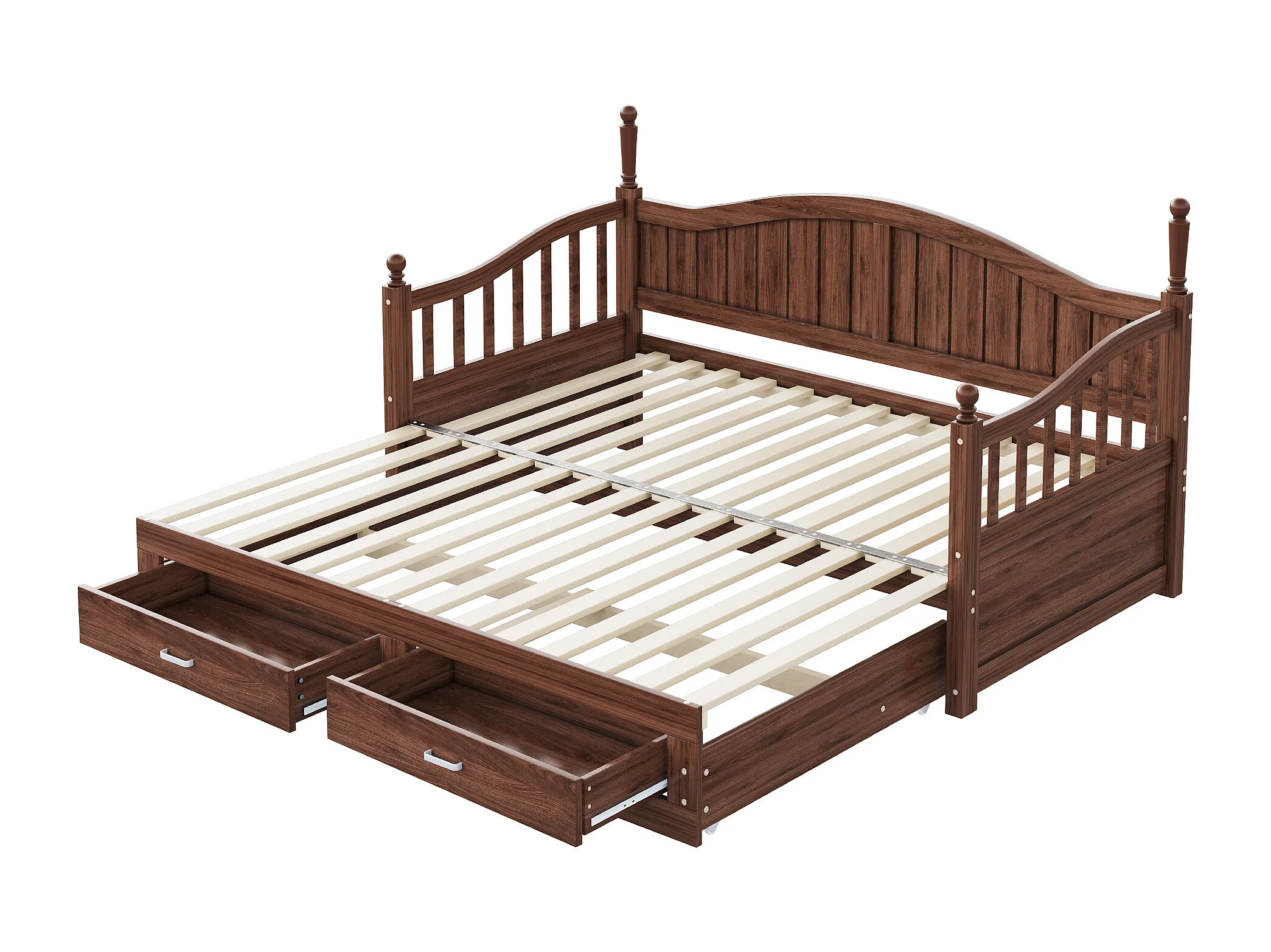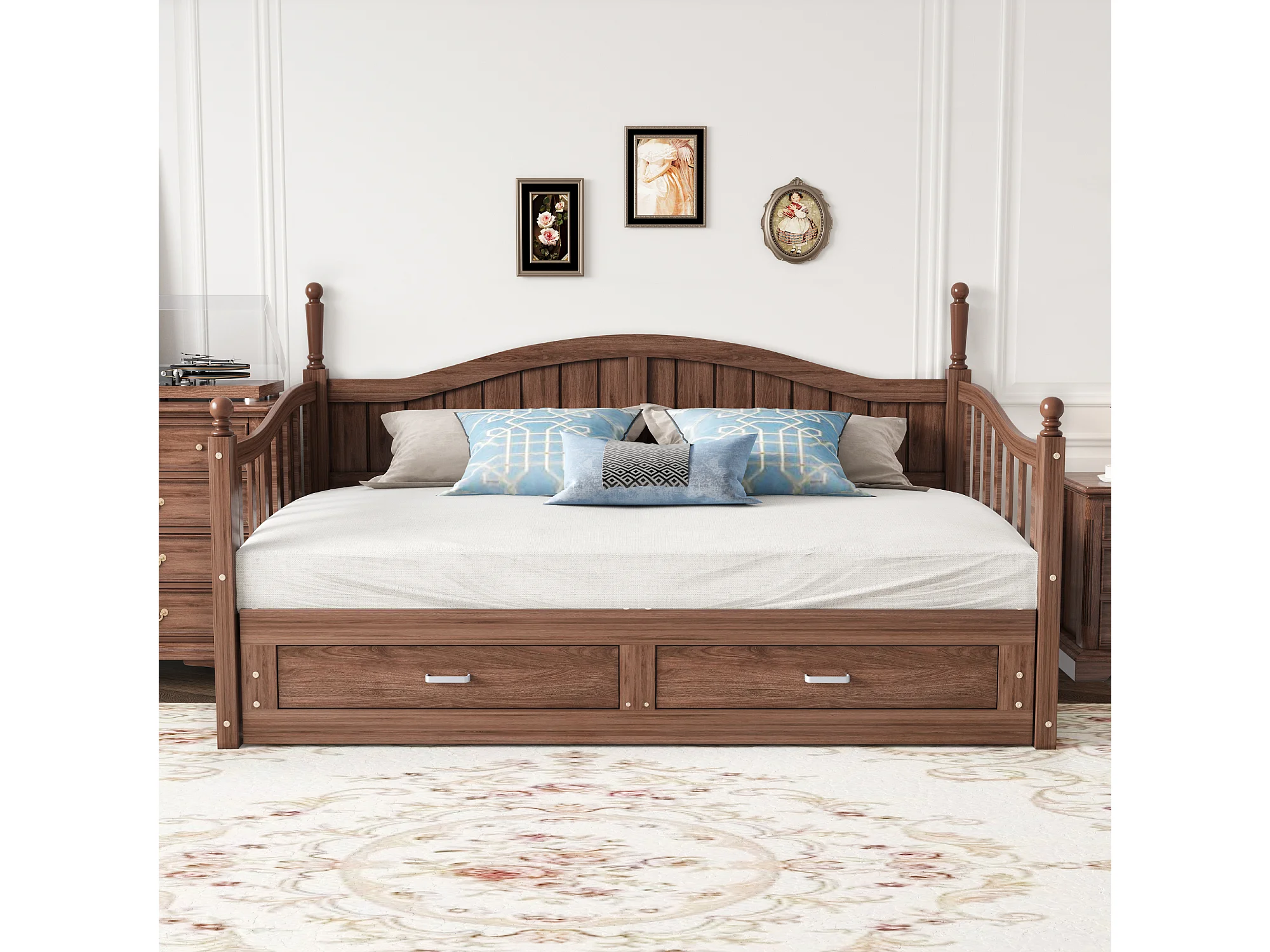 Canapé-lit extensible 90/180x190 en bois massif, colonnes romaines, dossier incurvé, tiroirs, sommier inclus, noyer