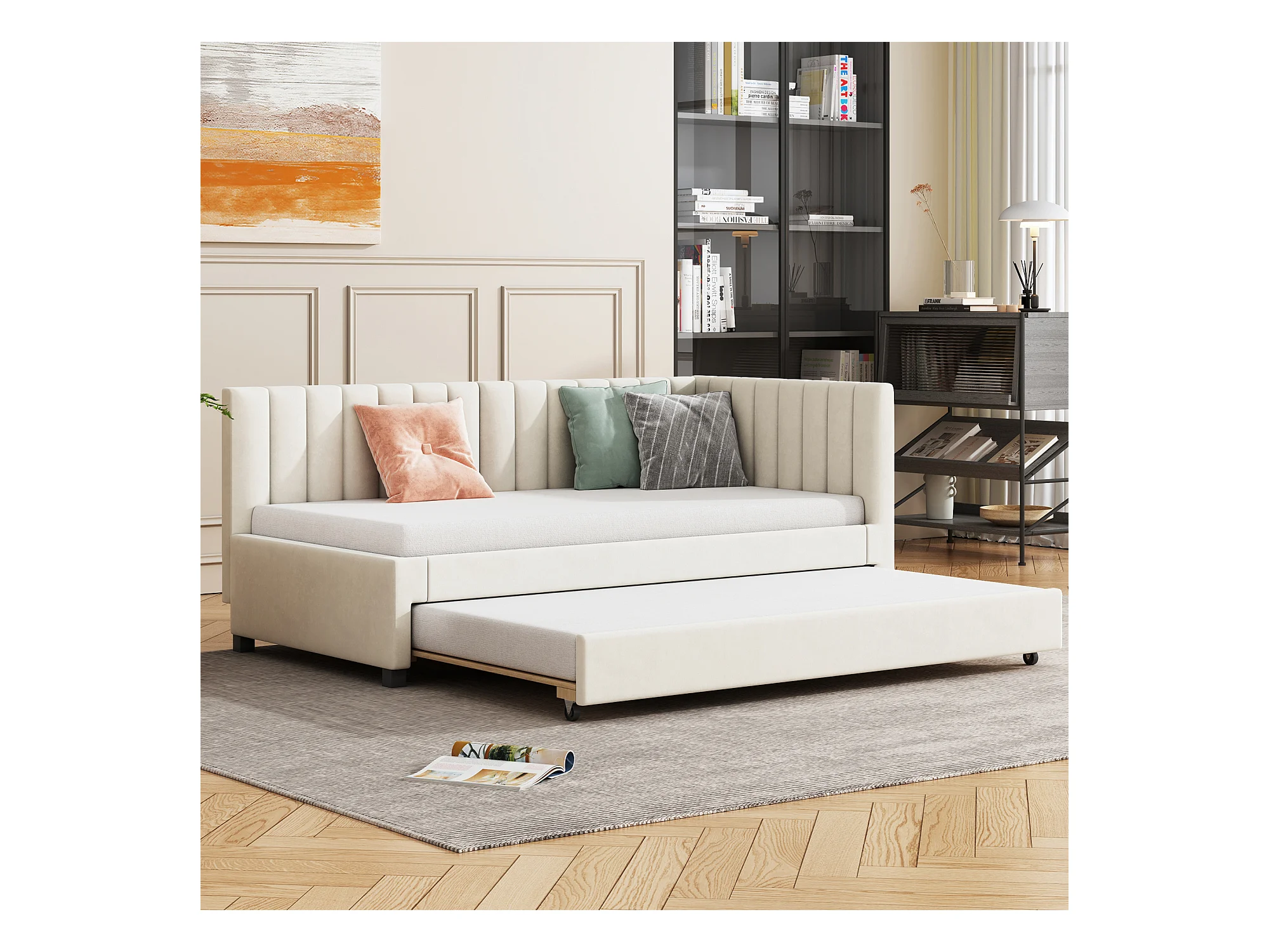 Canapé-lit extensible 90*200, Lit multifonctionnel avec sommier à lattes, Lit pour adolescent, Beige, Tissu velours