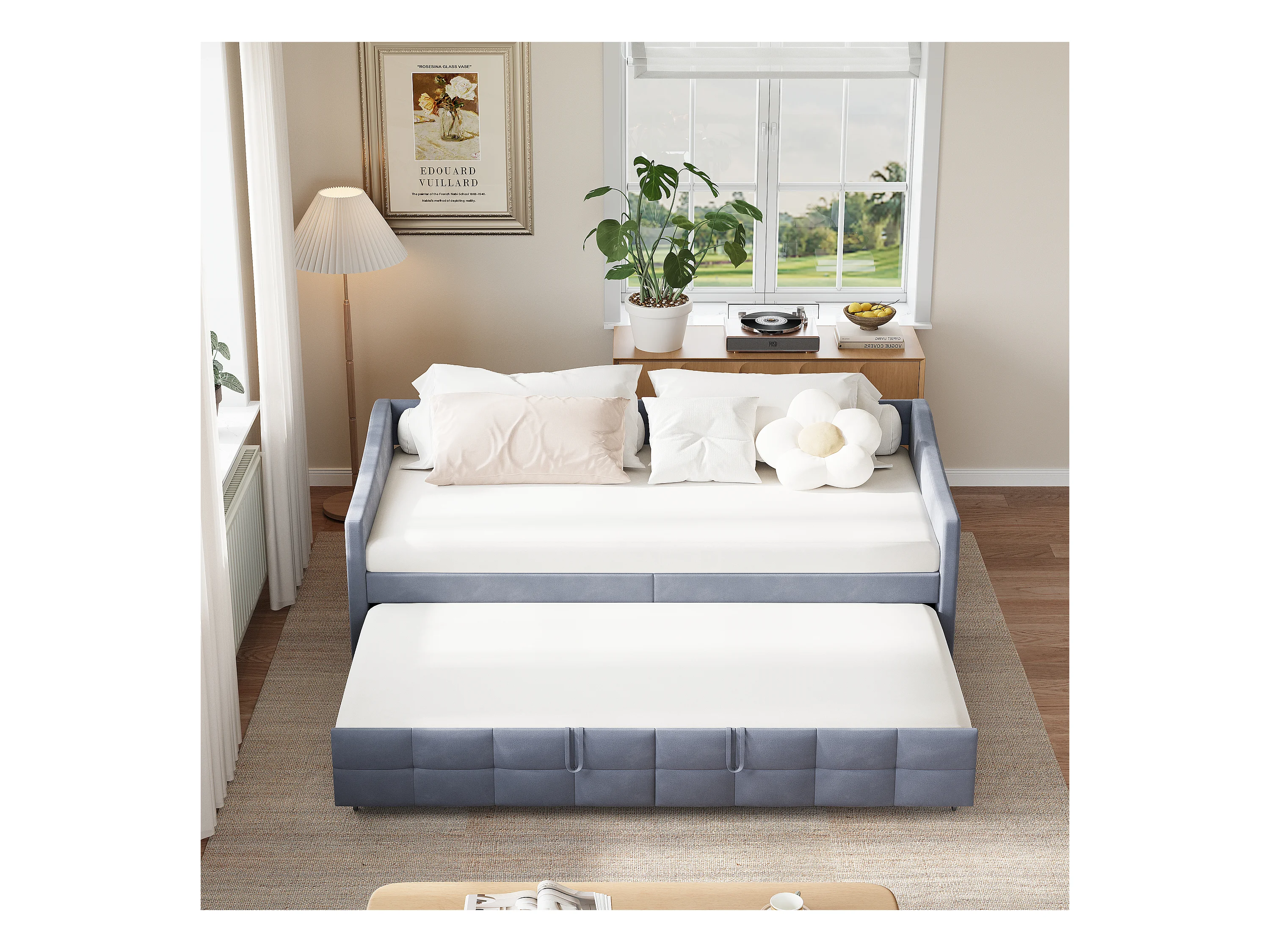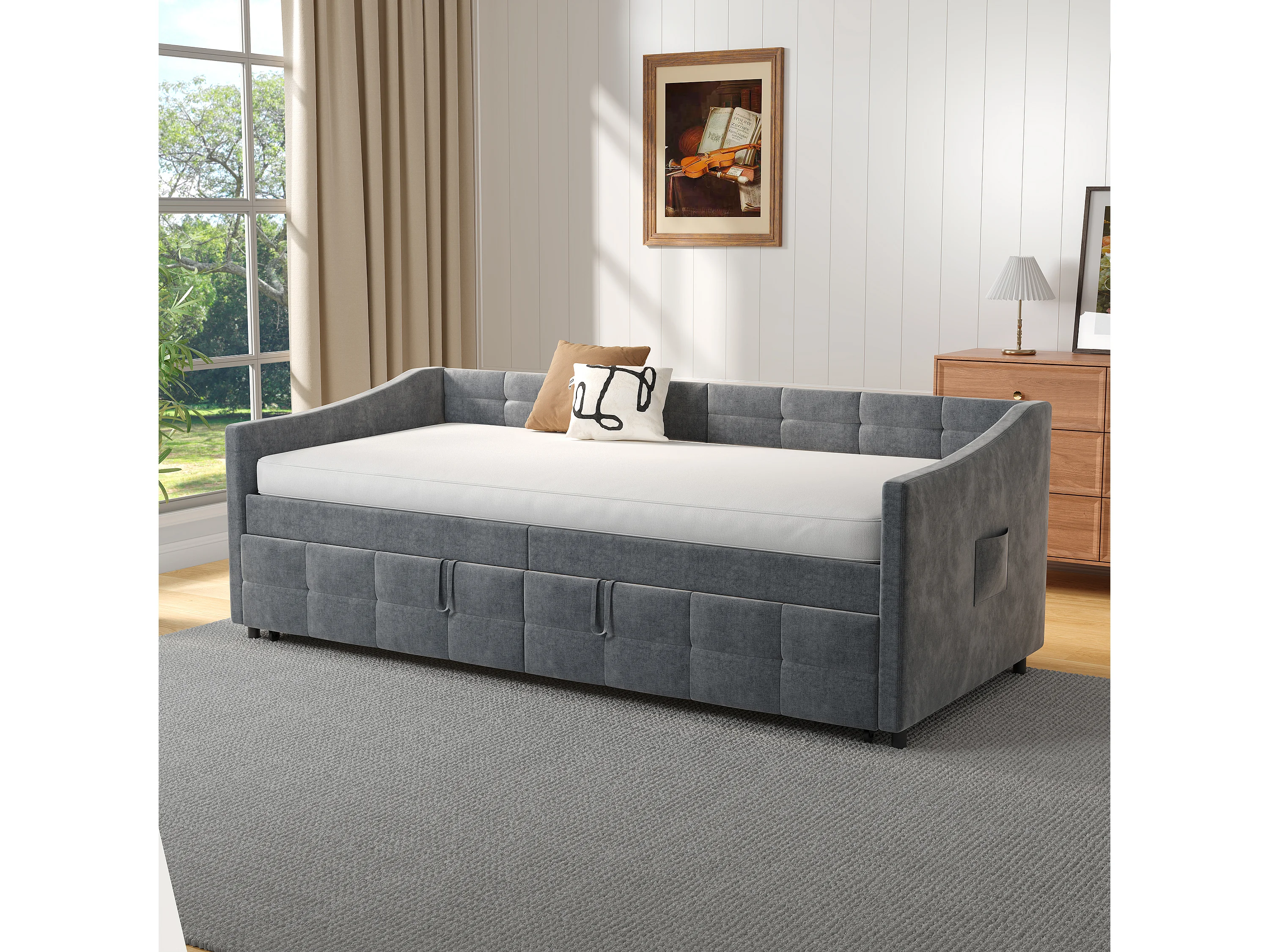 Canapé-lit extensible en velours gris 90x200 cm, convertible 180x200 cm avec mécanisme hydraulique, structure bois et métal, poche latérale pratique
