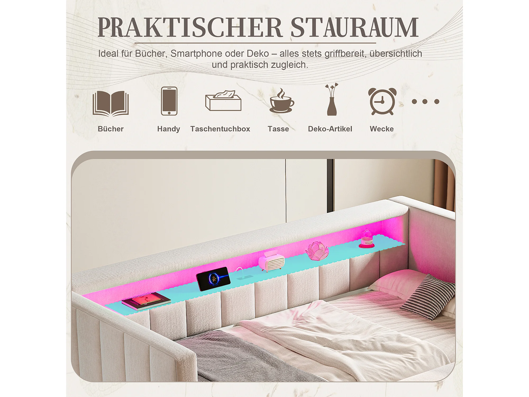 Canapé-lit gigogne - 90/180 x 190 cm - avec + USB + Leds + espace de rangemenle - velours - beige