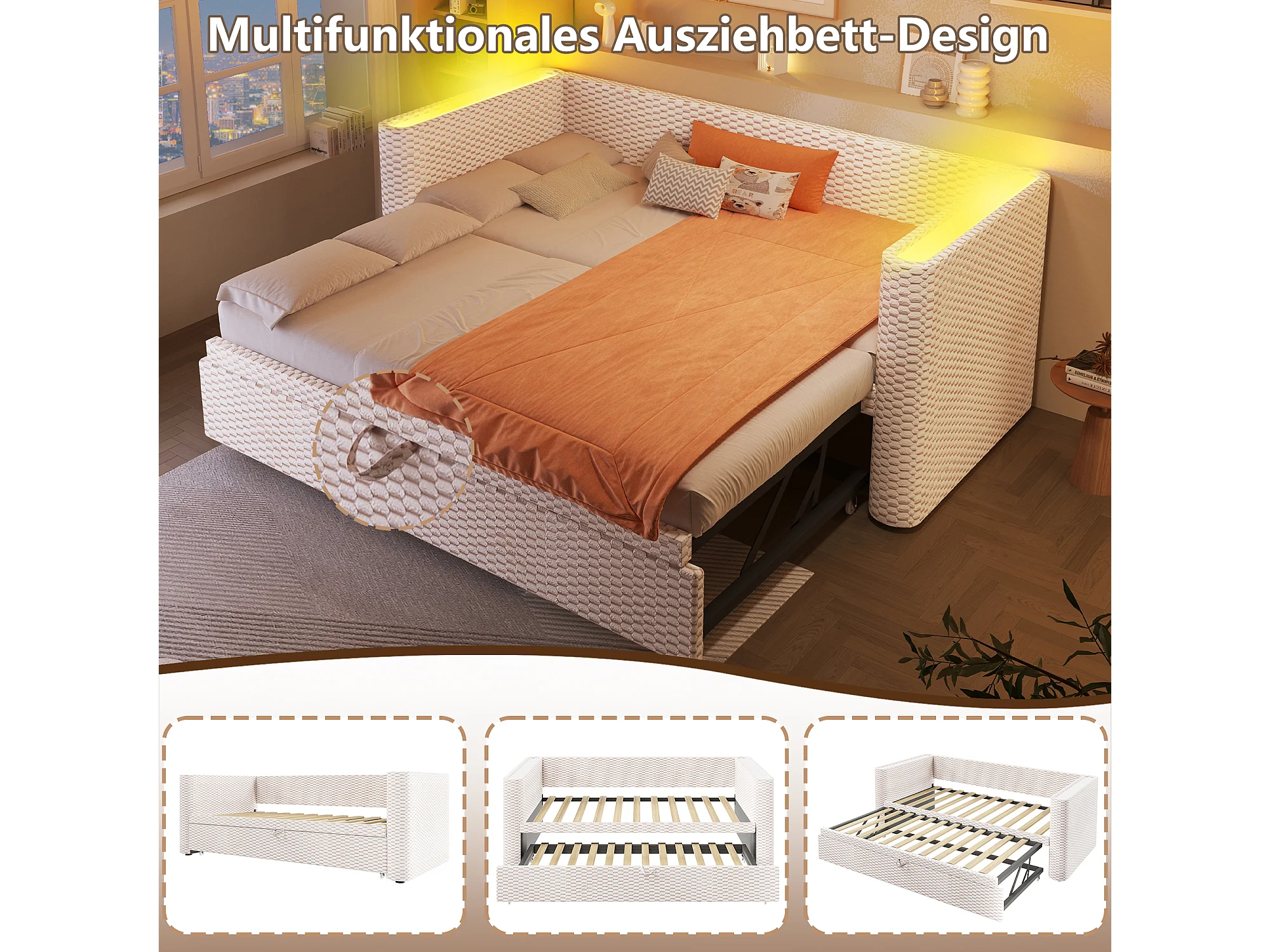 Canapé-lit gigogne pour enfant - 90/180 x 200 cm - avec Leds + sommier à lattes - velours - beige