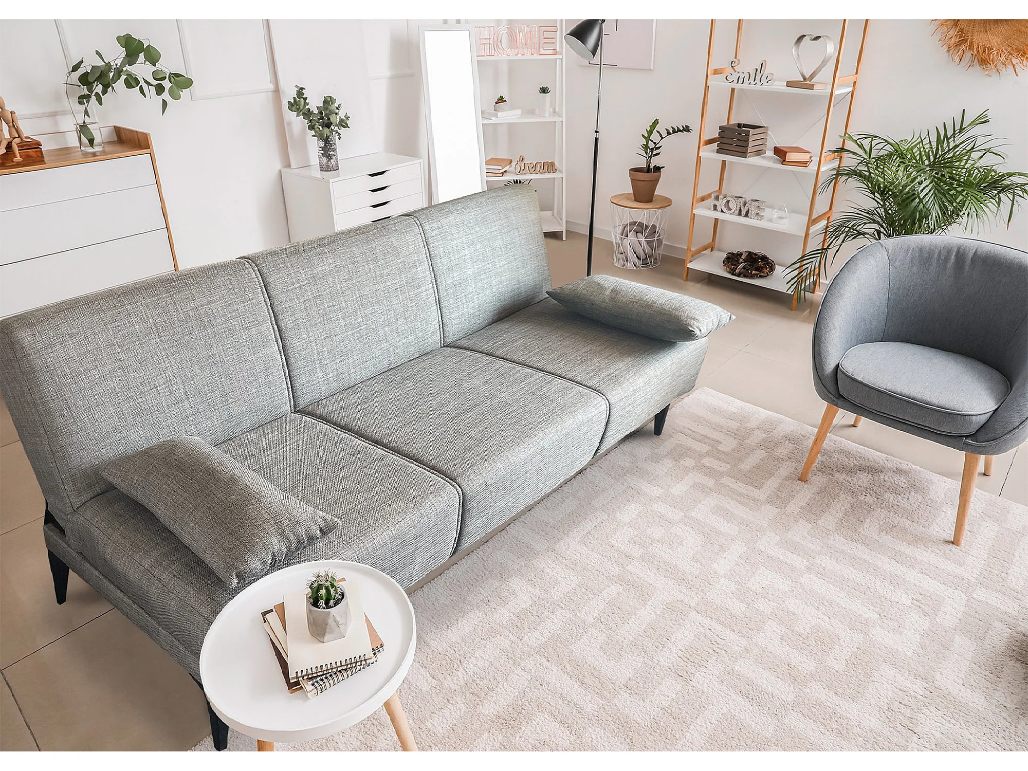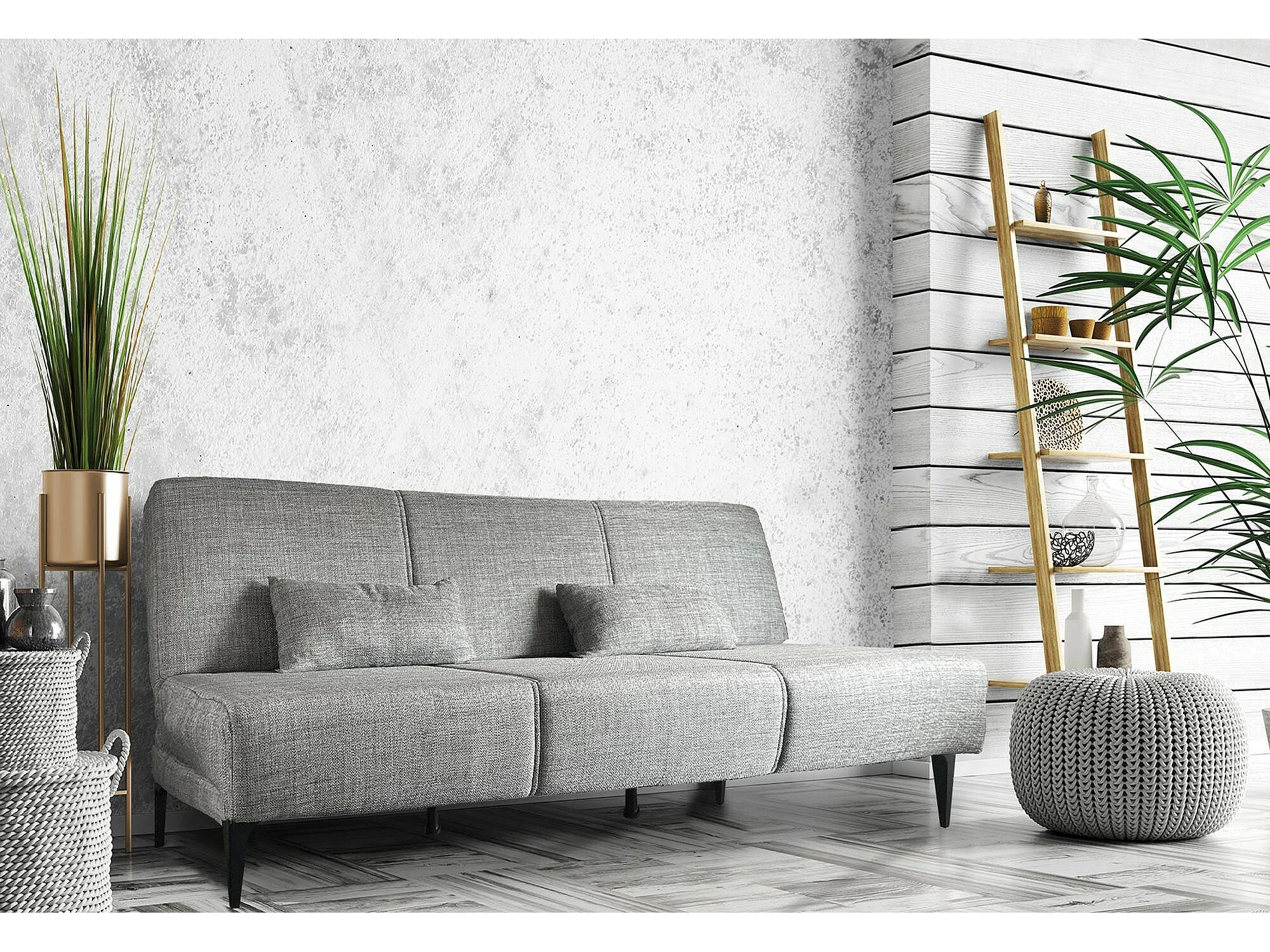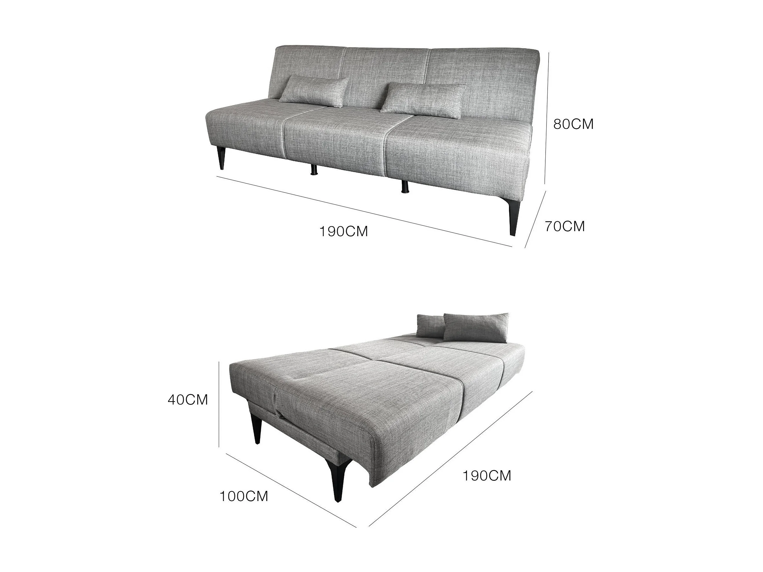 Canapé lit Hugo, Canapé lit en tissu, Canapé lit avec mécanisme d'ouverture par clic, Canapé lit avec coussins, 190x70h80 cm, Grey