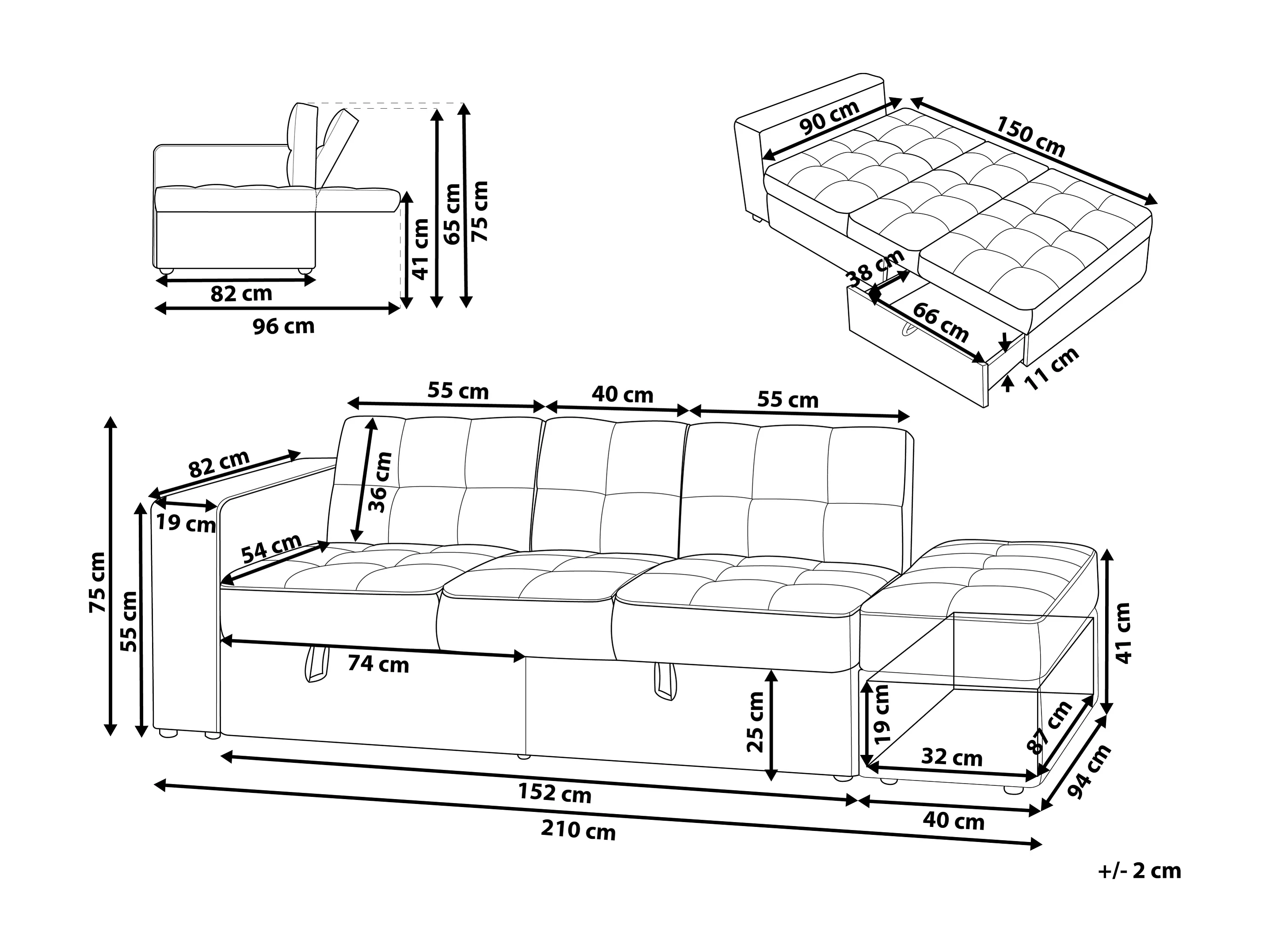 Canapé-lit 3 places FALSTER Tissu Noir avec rangement