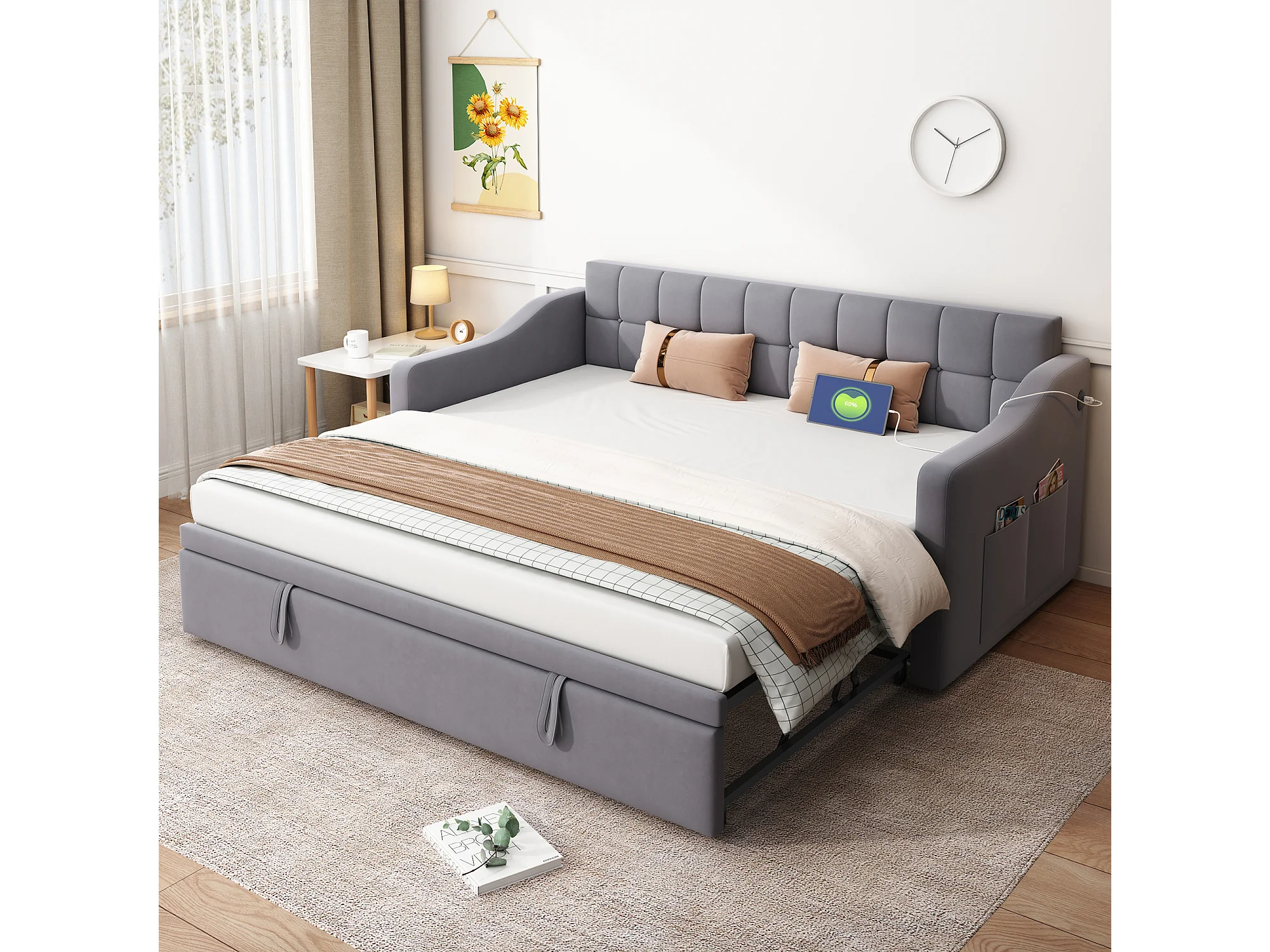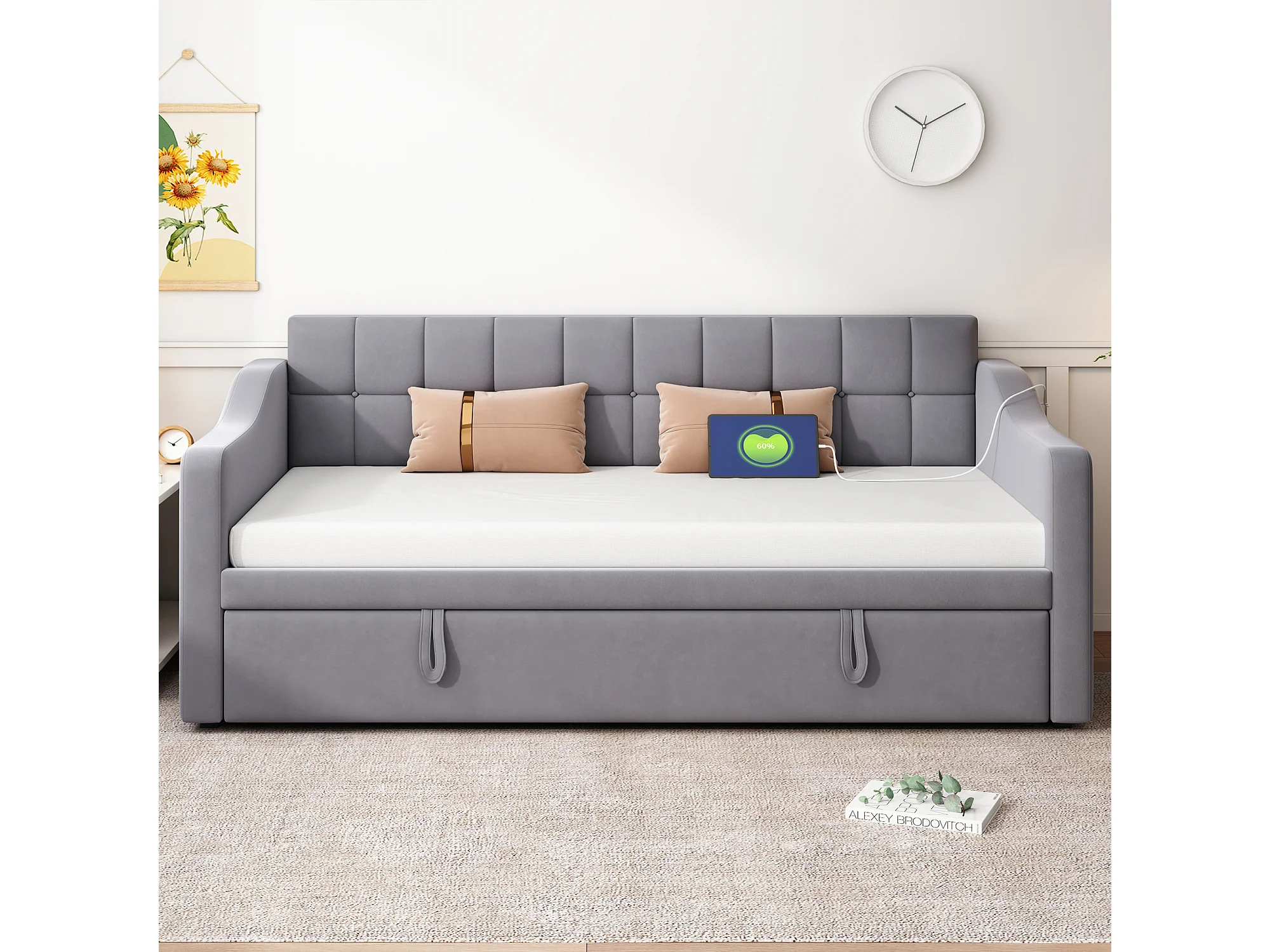 Canapé-lit multifonction 2 en 1 90/180 cm, en velours gris, avec prise USB et poche de rangement latérale
