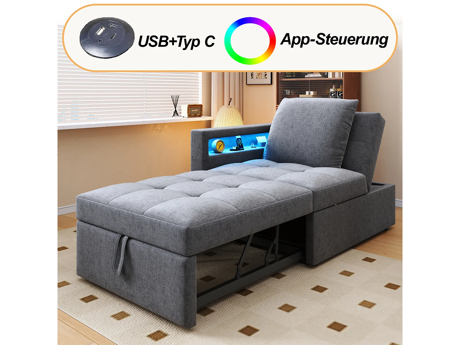 Canapé-lit multifonctionnel 3 en 1 avec dossier réglable, accoudoirs avec bandes lumineuses LED et ports USB/Type-C, canapé inclinable,Gris clair