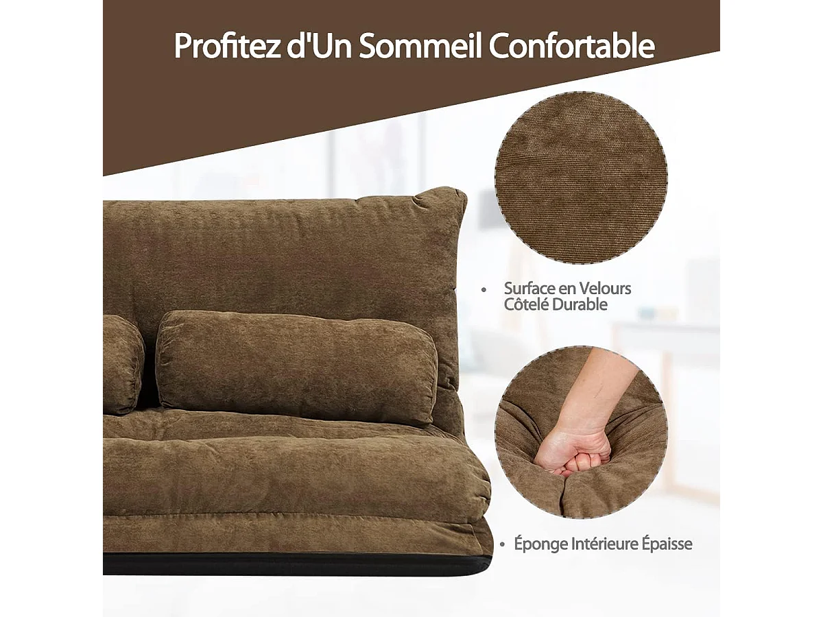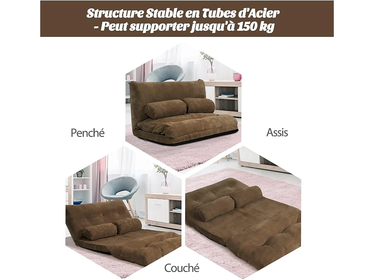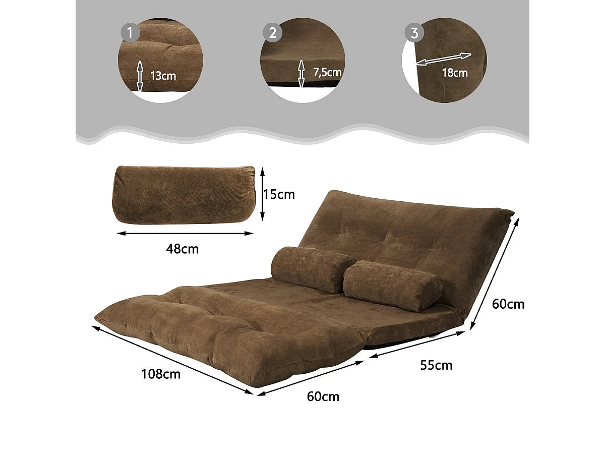 Canapé-lit Paresseux Pliable, Canapé de Sol Réglable 90°-180° à 6 Positions avec 2 Oreillers Café