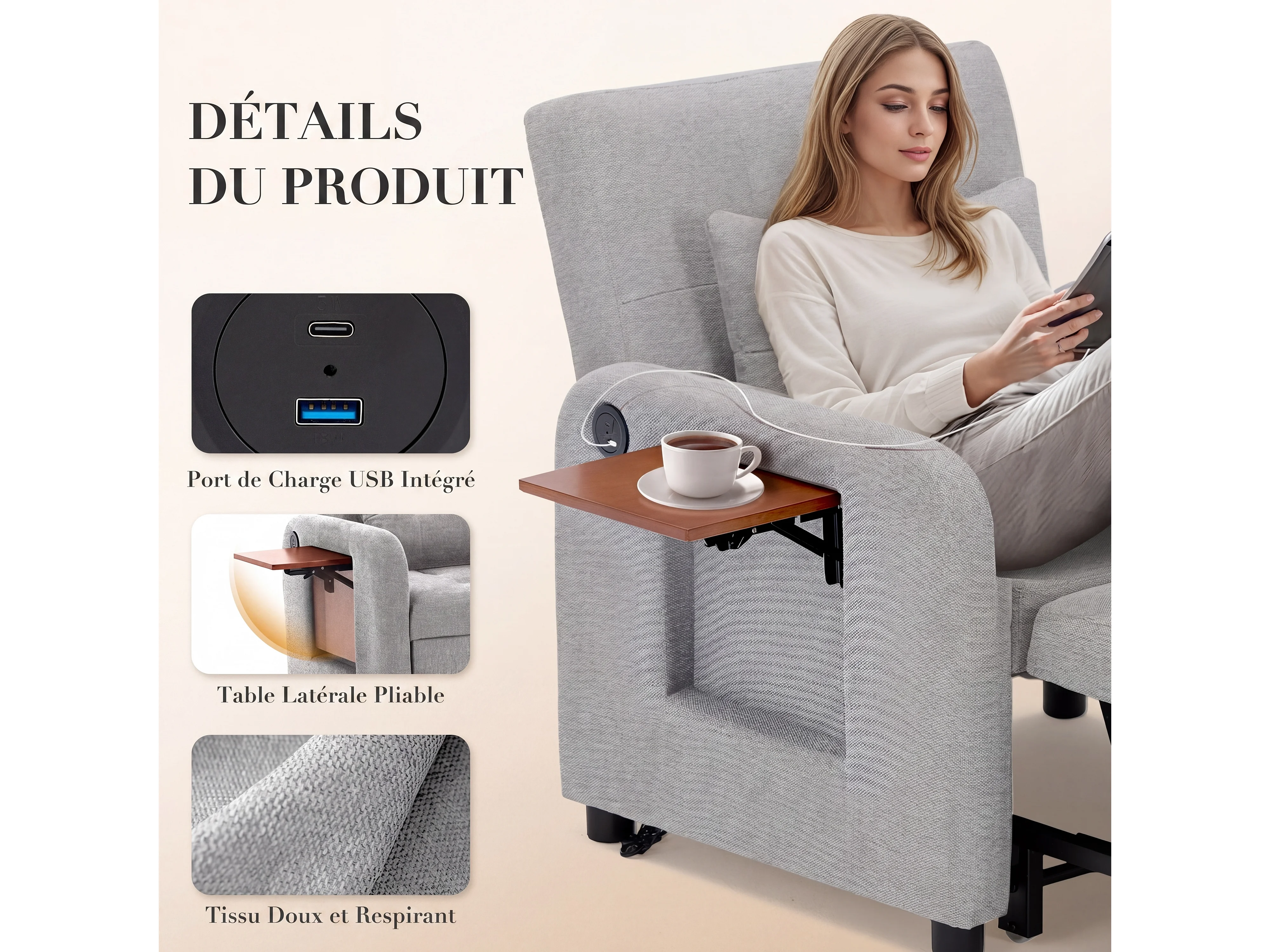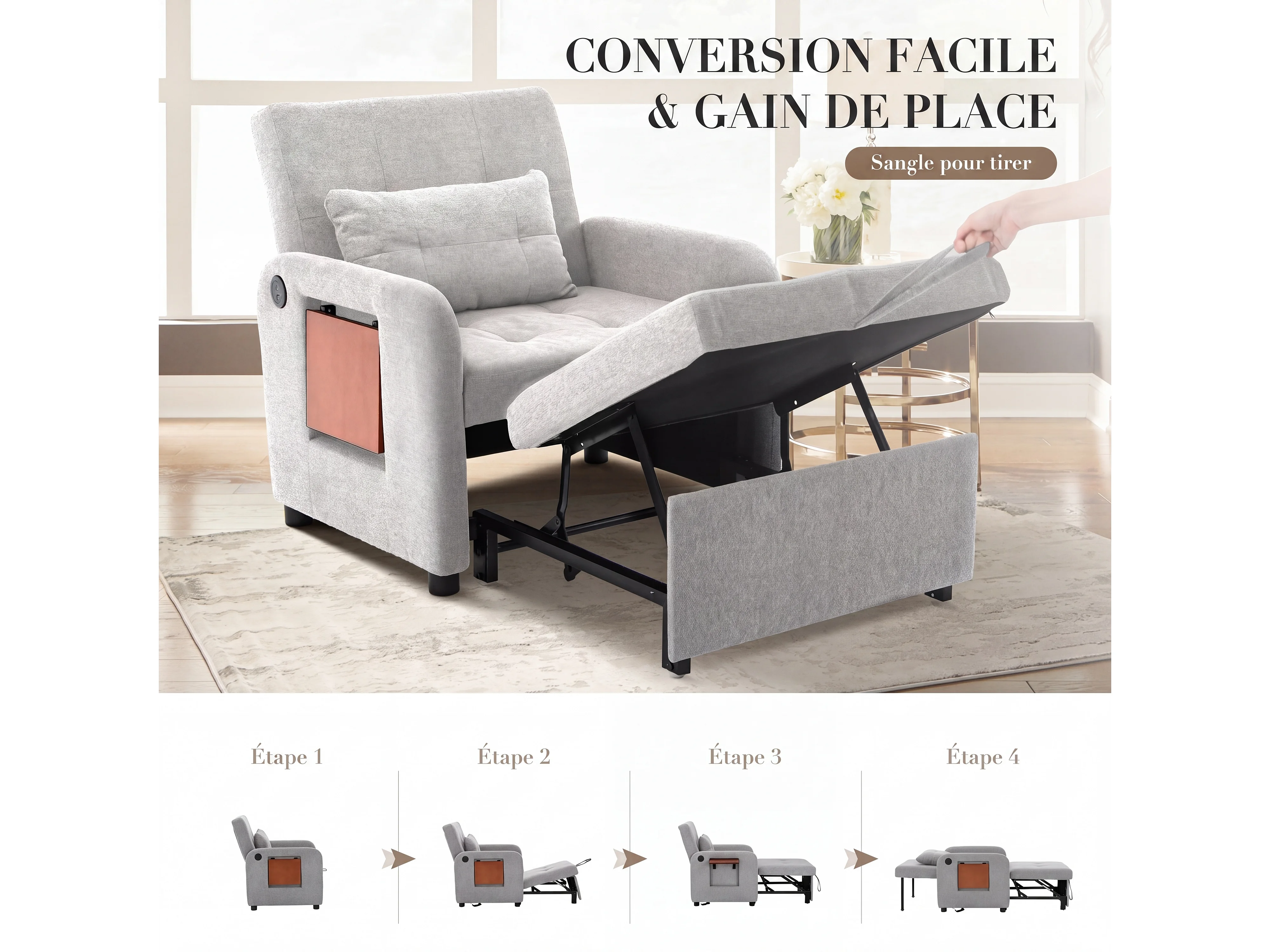 Canapé-lit pliable gris clair – tissu multifonction, convertible assise/allongée, USB, table pliante, coussin, dossier réglable