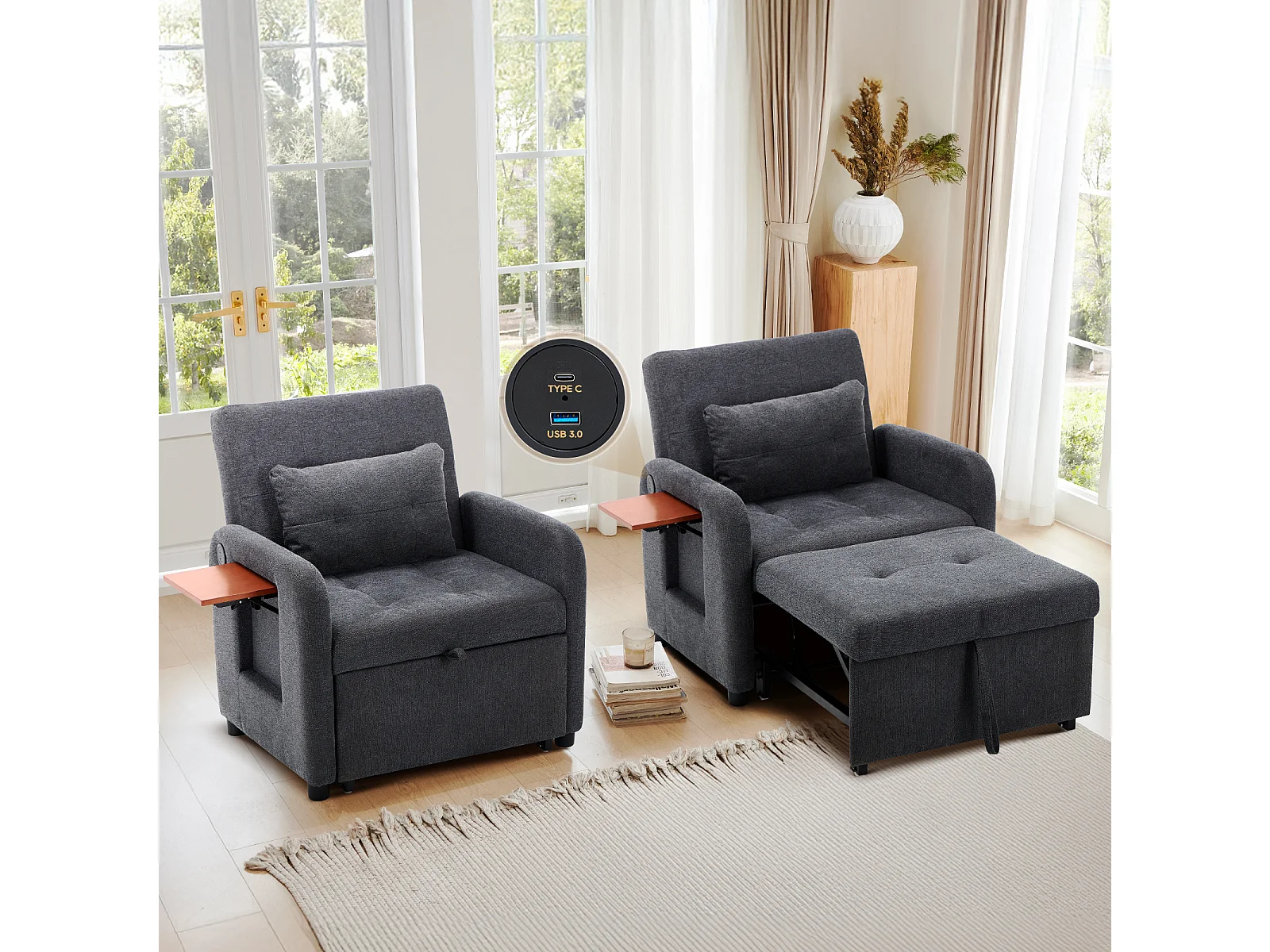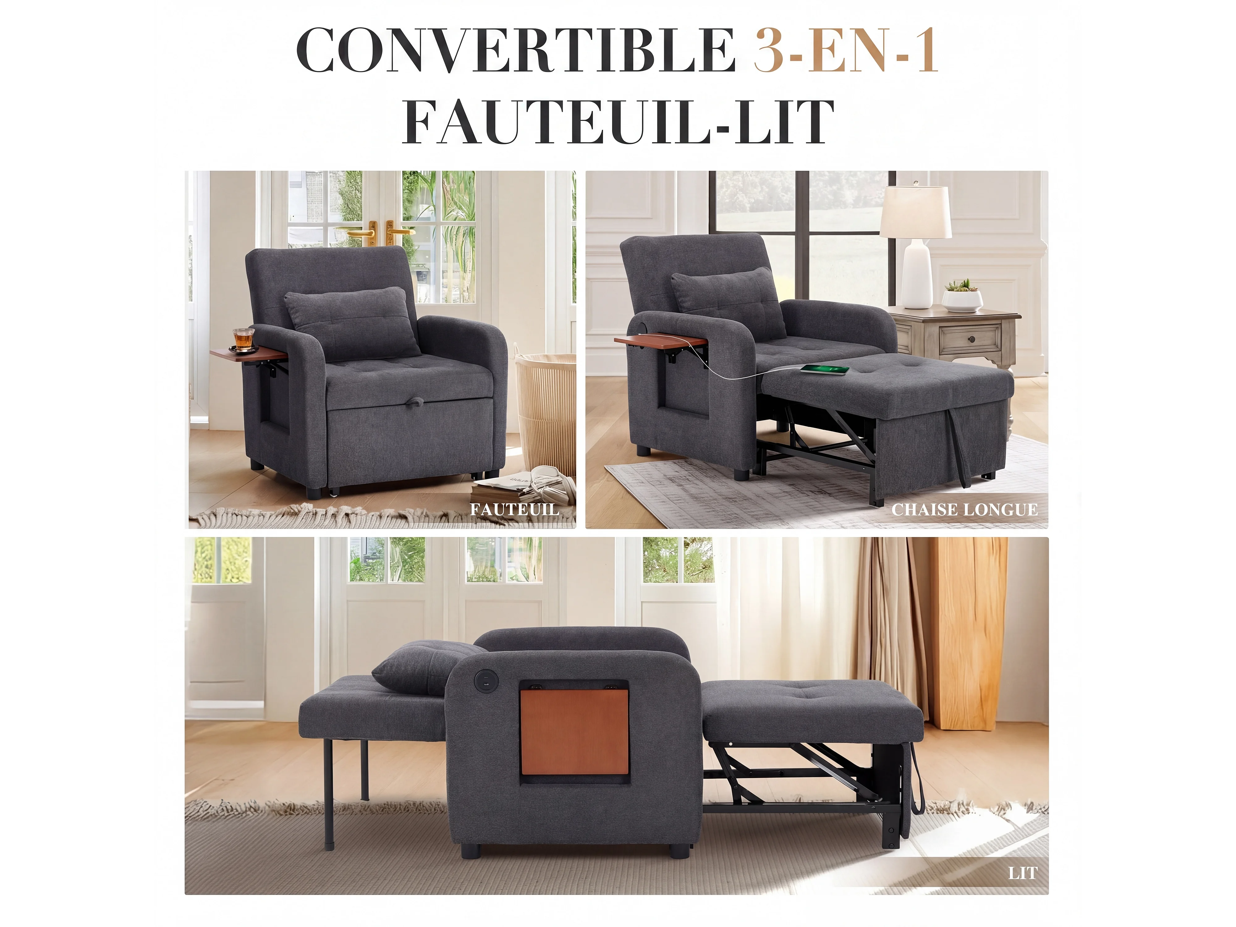 Canapé-lit pliable gris foncé – tissu multifonction, convertible assise/allongée, USB, table pliante, coussin, dossier réglable