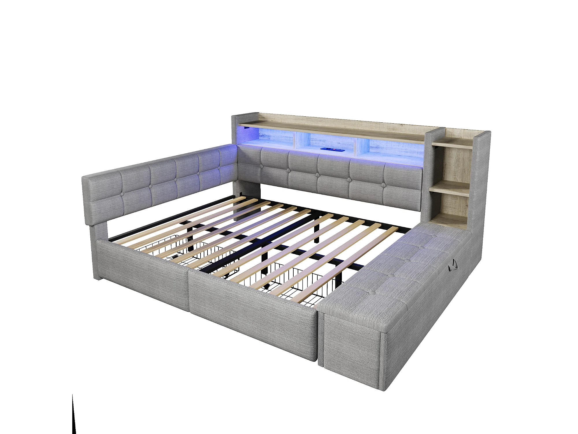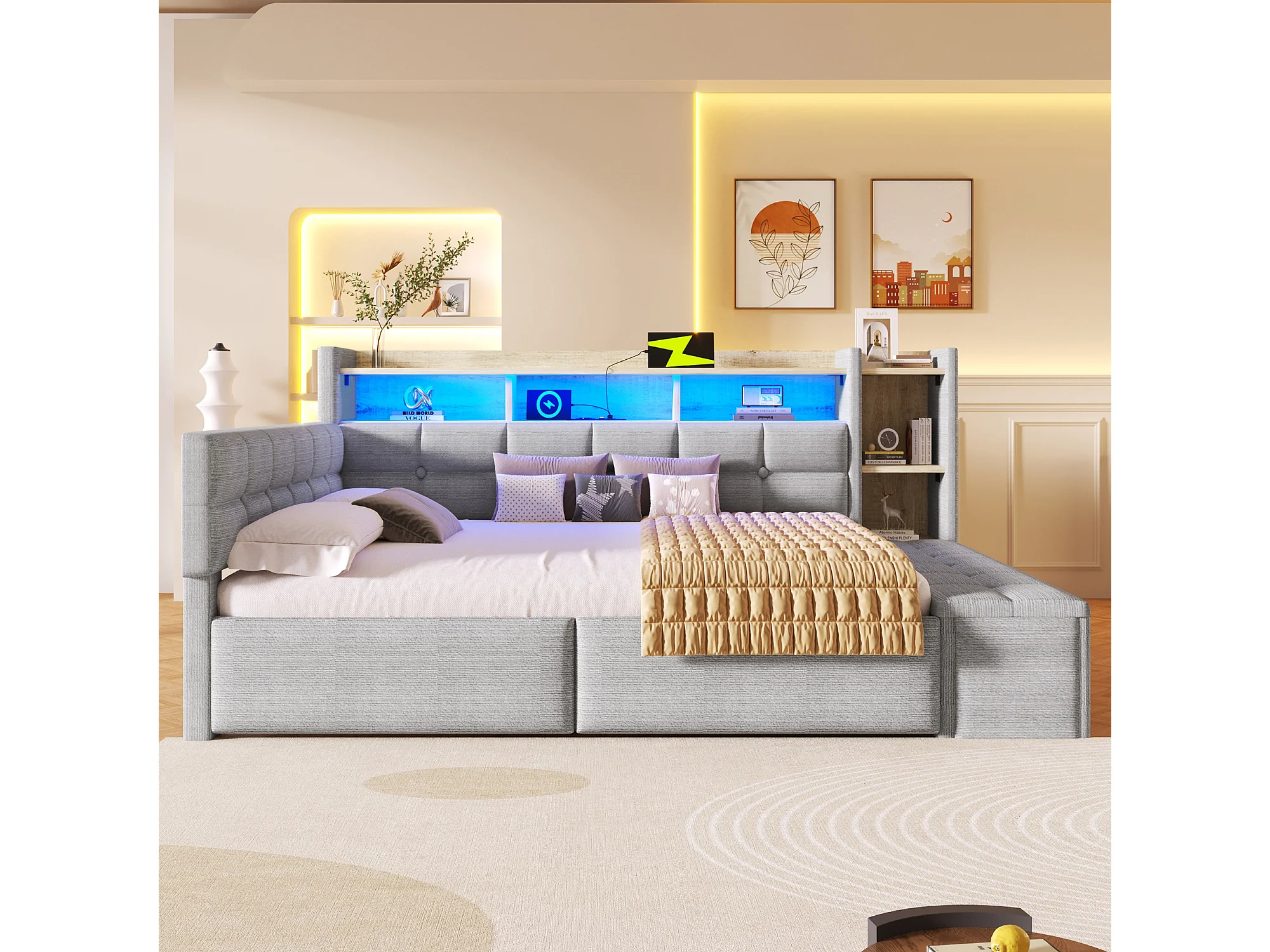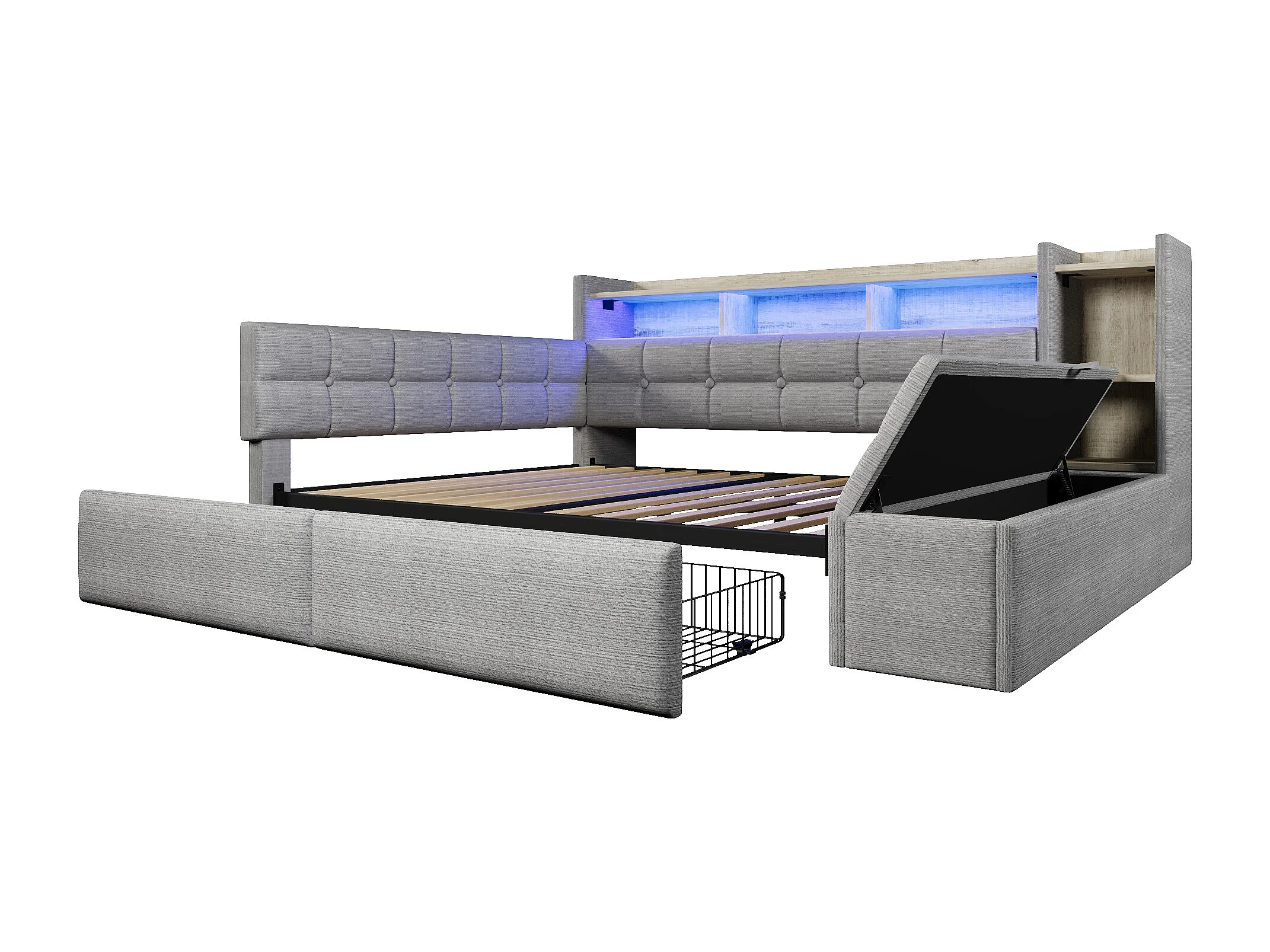 Canapé-lit pour enfant - 140 x 190 cm - avec 2 tiroirs + USB et Type-C + étagère + banquette de rangement + Leds - velours - gris clair