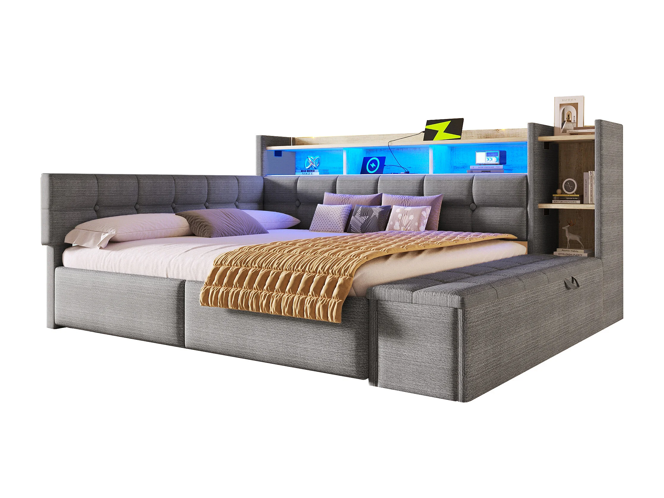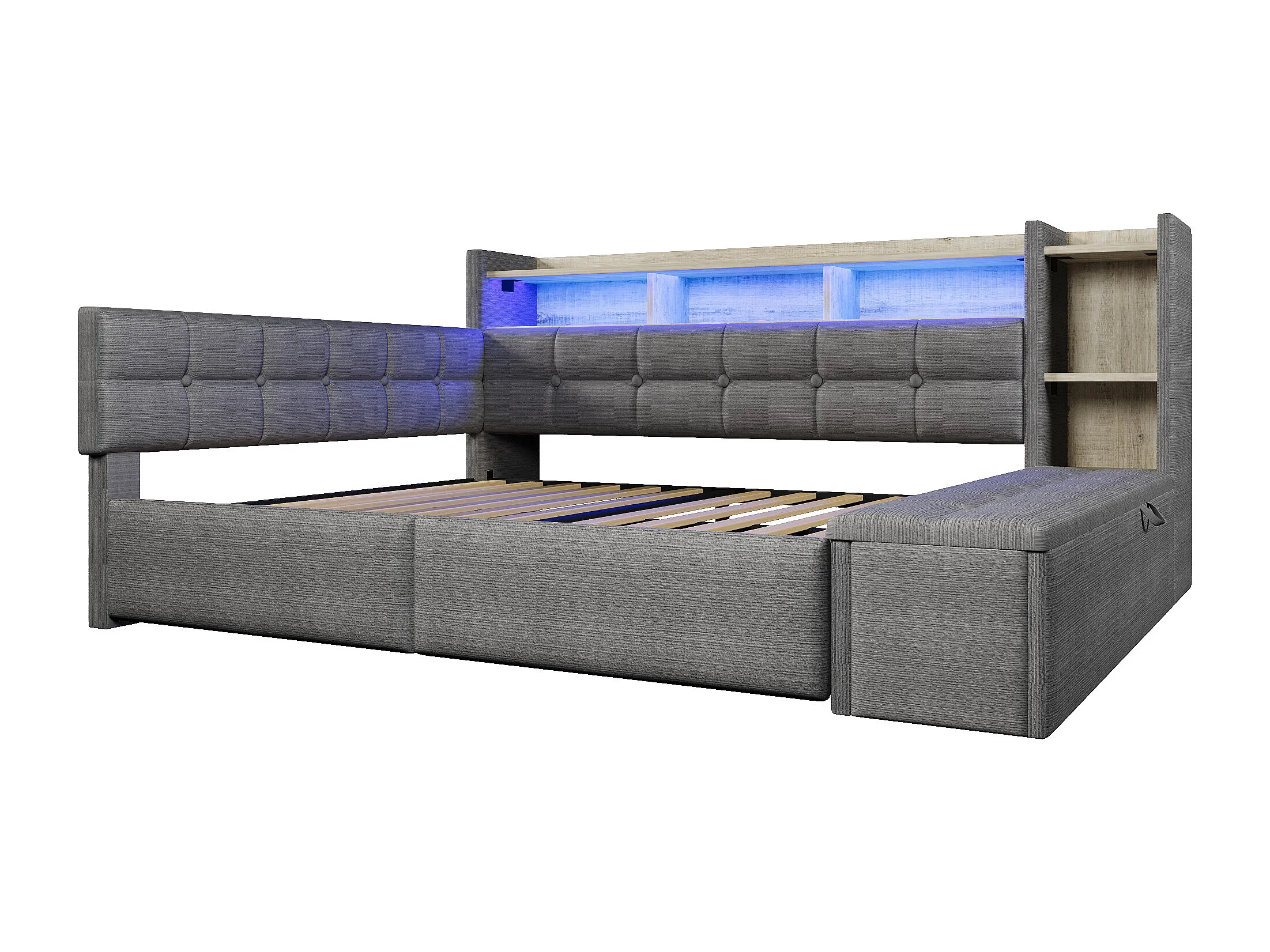 Canapé-lit pour enfant - 140 x 190 cm - avec 2 tiroirs + USB et Type-C + étagère + banquette de rangement + Leds - velours - gris foncé