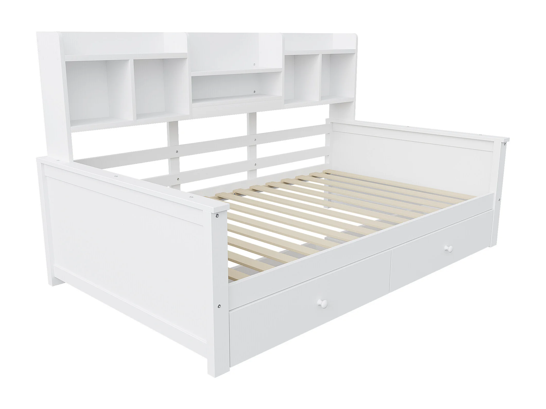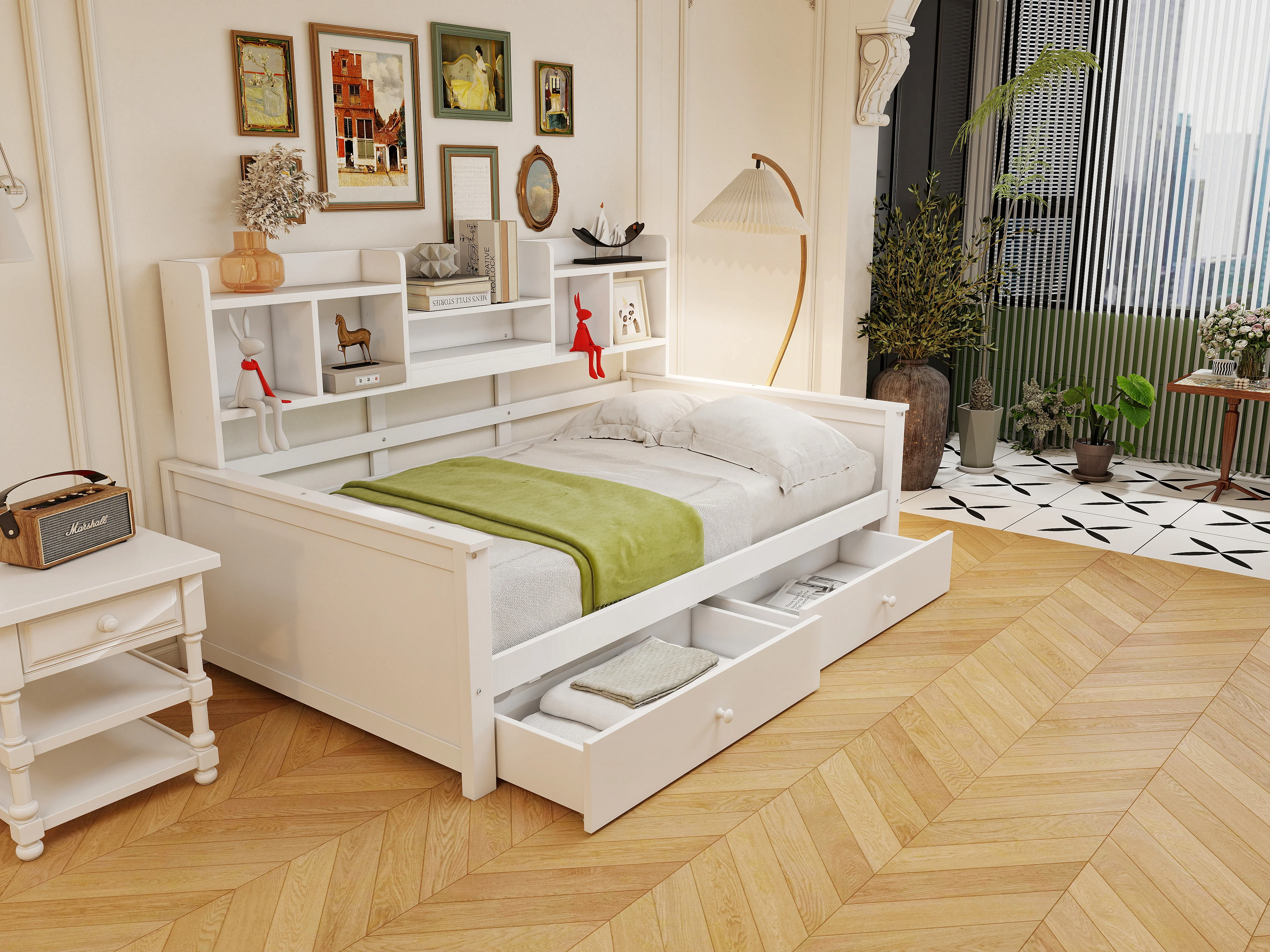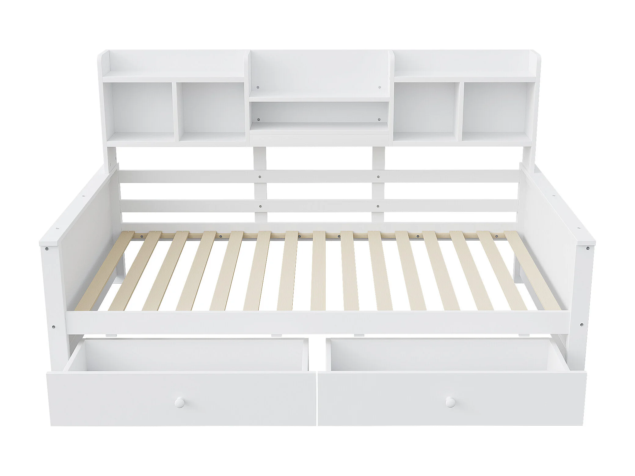 Canapé-lit pour enfant - 90 x 200 cm - avec 2 tiroirs + étagères de rangement + sommier à lattes - bois - blanc