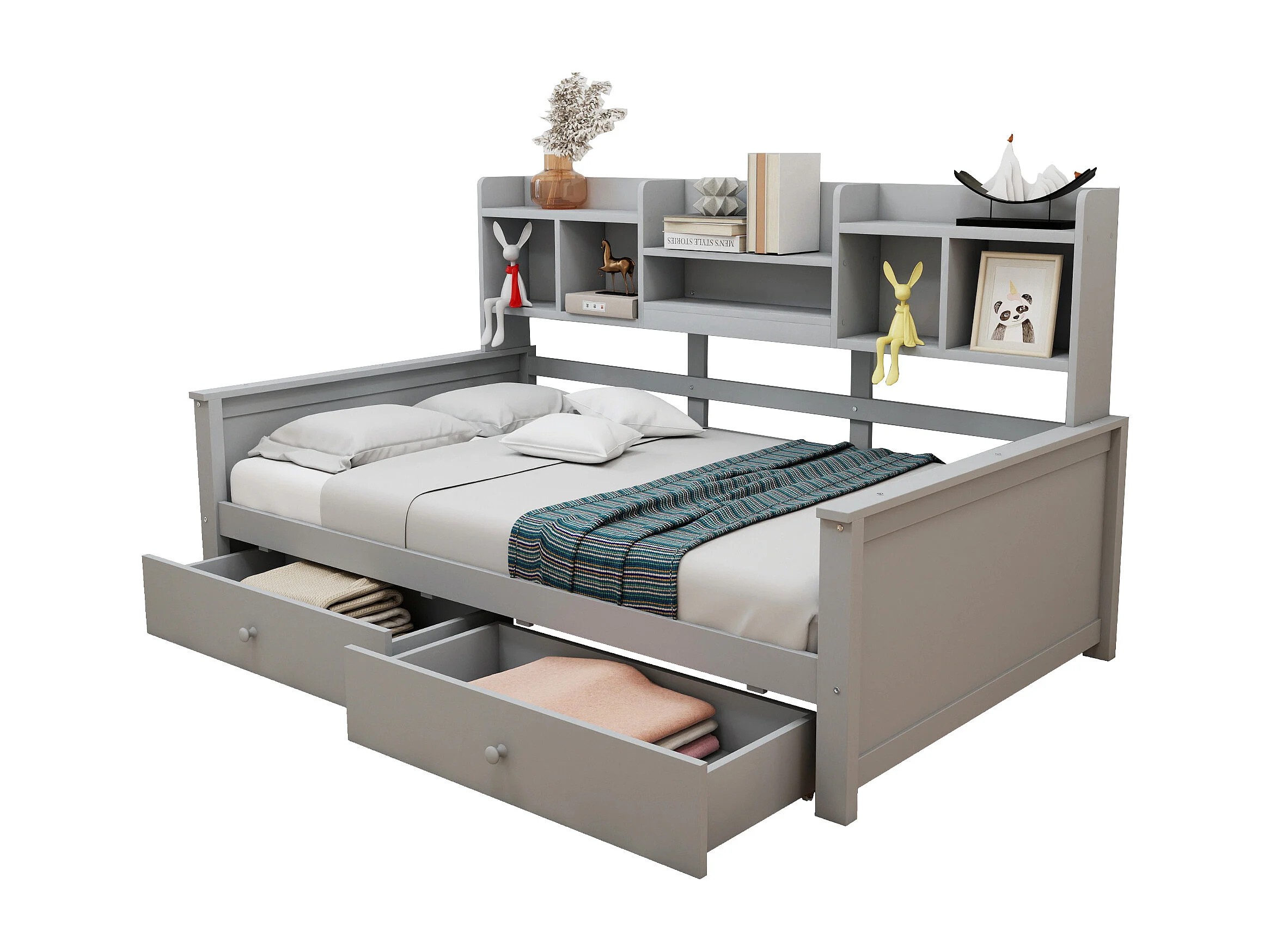 Canapé-lit pour enfant - 90 x 200 cm - avec 2 tiroirs + étagères de rangement + sommier à lattes - bois - gris
