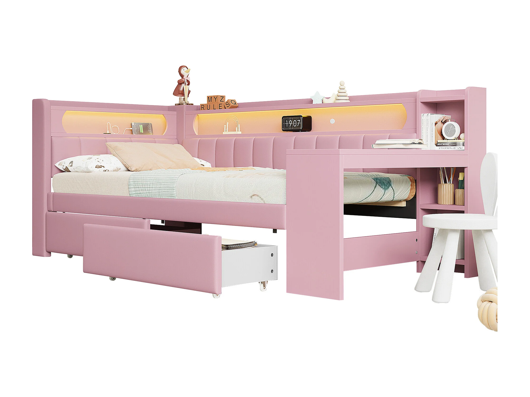 Canapé-lit pour enfant - 90 x 200 cm - avec Leds + USB + bureau + 2 tirois - MDF + lin - rose