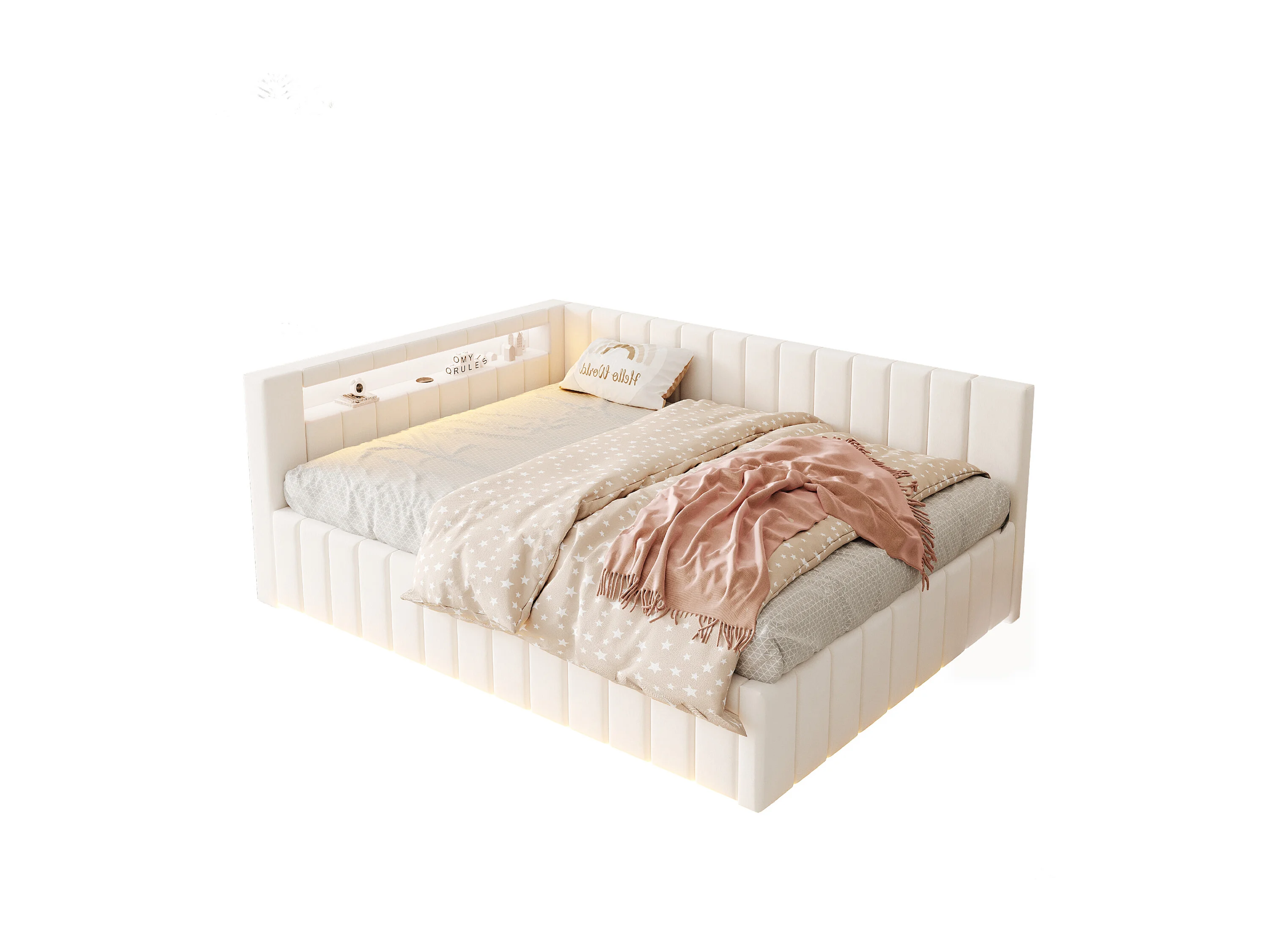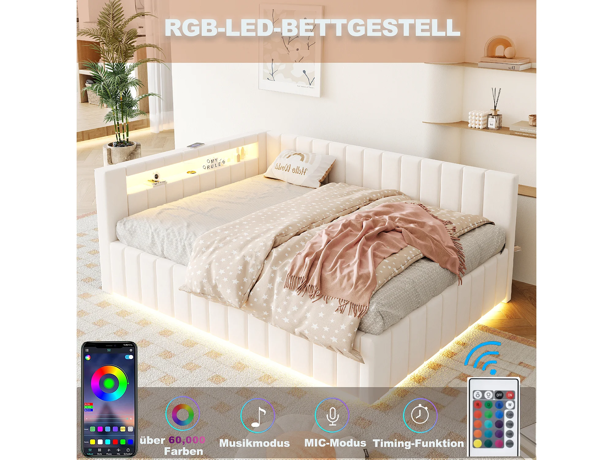 Canapé-lit rembourré - 140 x 200 cm - avec coffre hydraulique + Leds + dossier + tête de lit - velours - beige