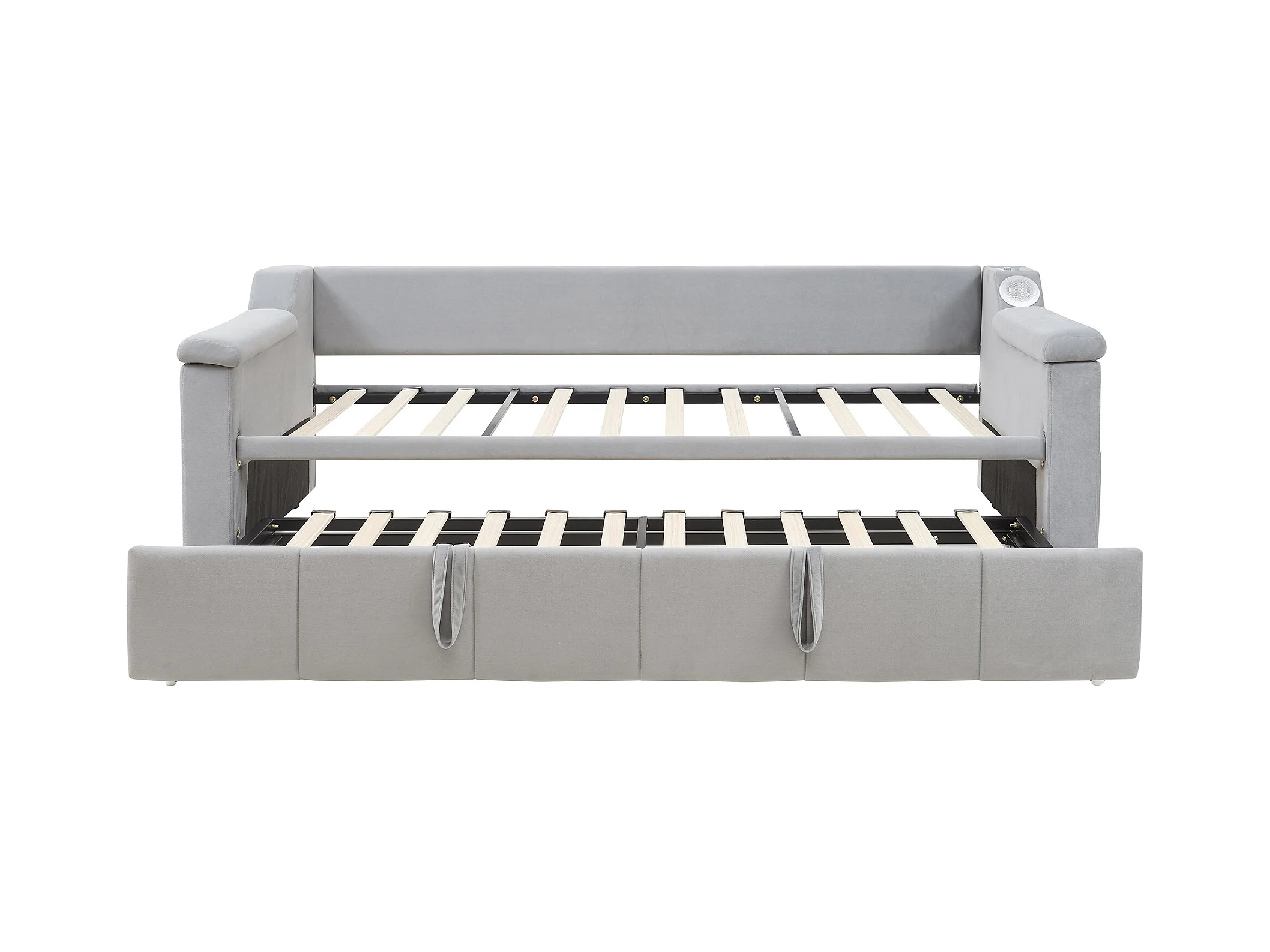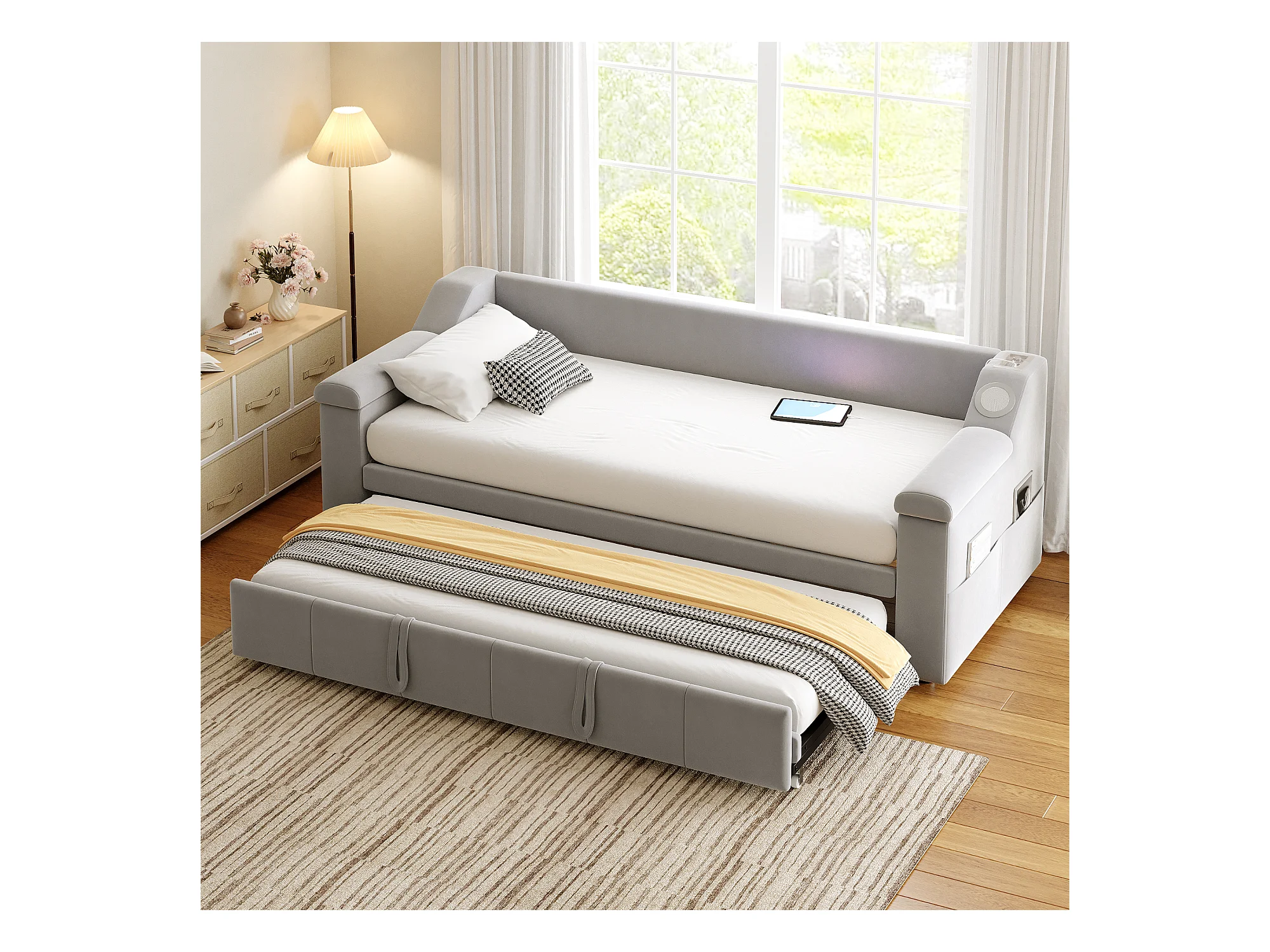 Canapé-lit rembourré 90x190 cm - avec port de charge USB - avec système audio Bluetooth intelligent - tissu velours - gris clair