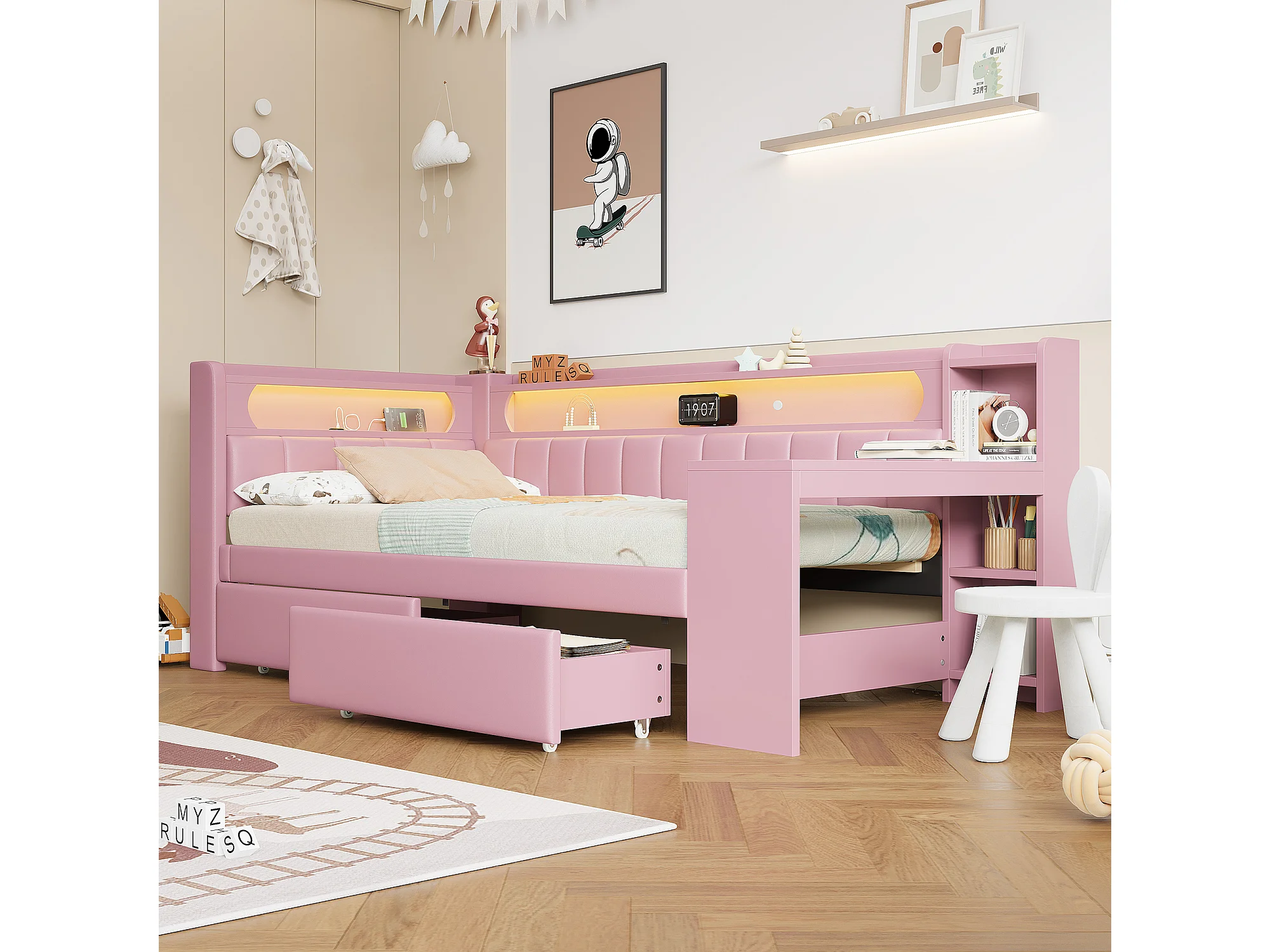 Canapé-lit rembourré 90x200 cm - avec ports USB et LED - avec bureau et 2 tiroirs - rose(sans matelas)