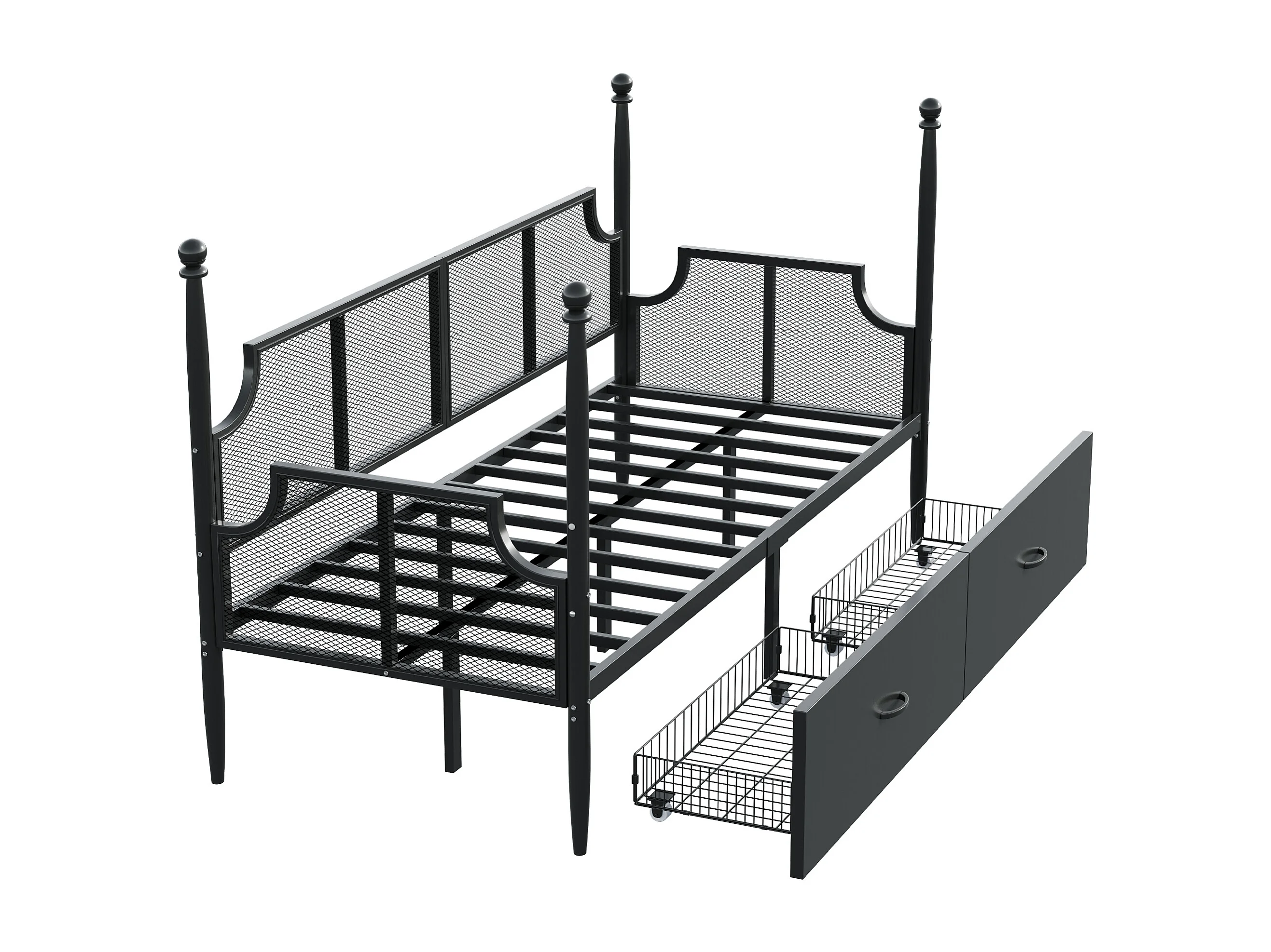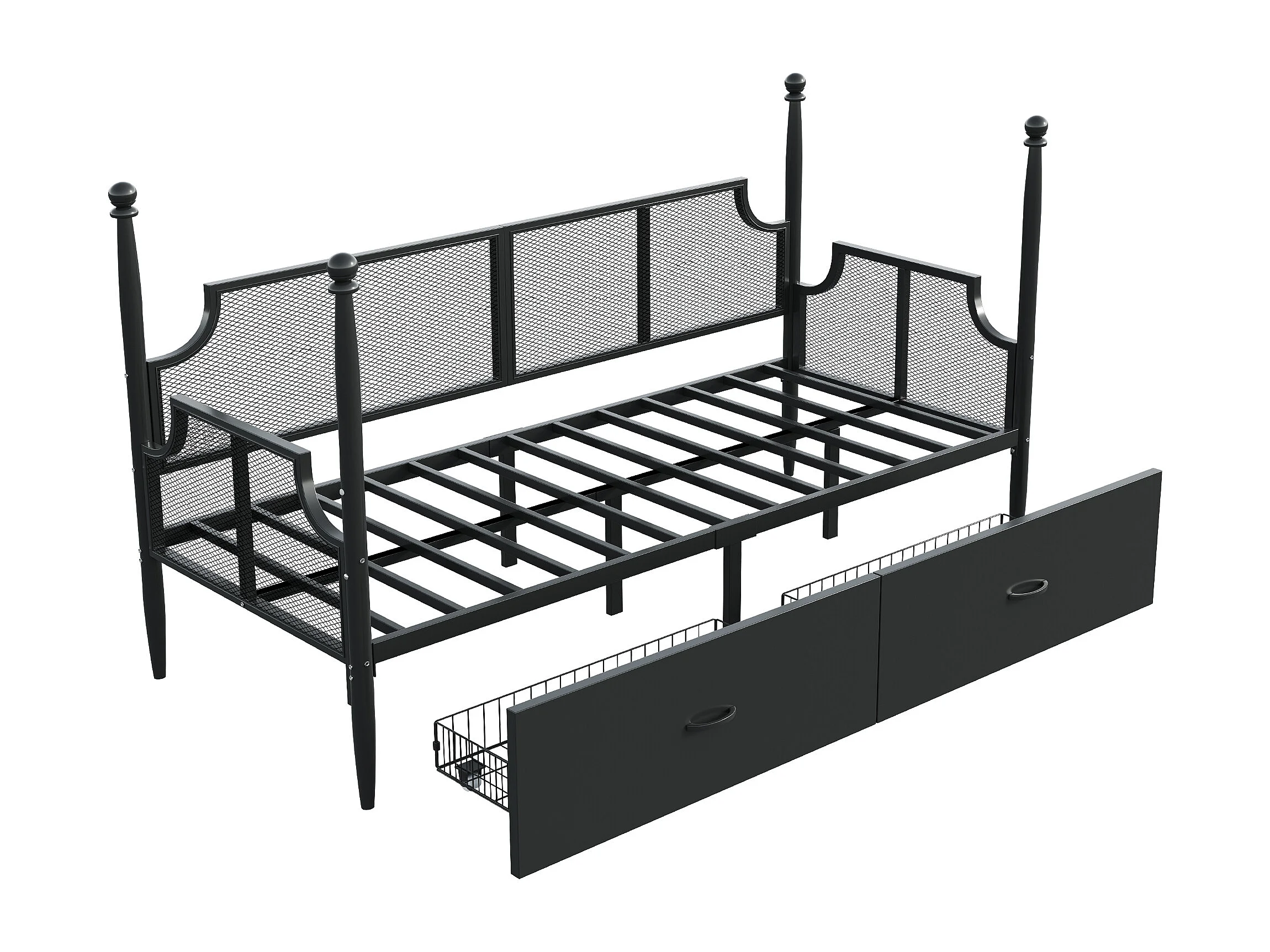 Canapé-lit simple 90x200 cm, 2 tiroirs, dossier et accoudoirs de style vintage, en fer noir, sans matelas